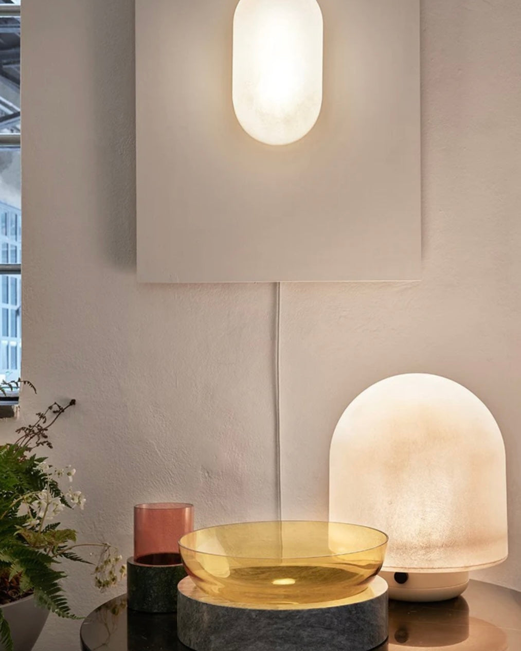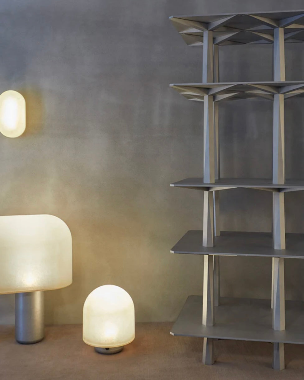 Puffball, a collection of minimal lamps, draws inspiration from the rounded caps and columned stalks of wild mushrooms and toadstools. The chunky silhouettes, made of raw fiberglass and tumbled or painted aluminum, give off a warm luminescent glow.