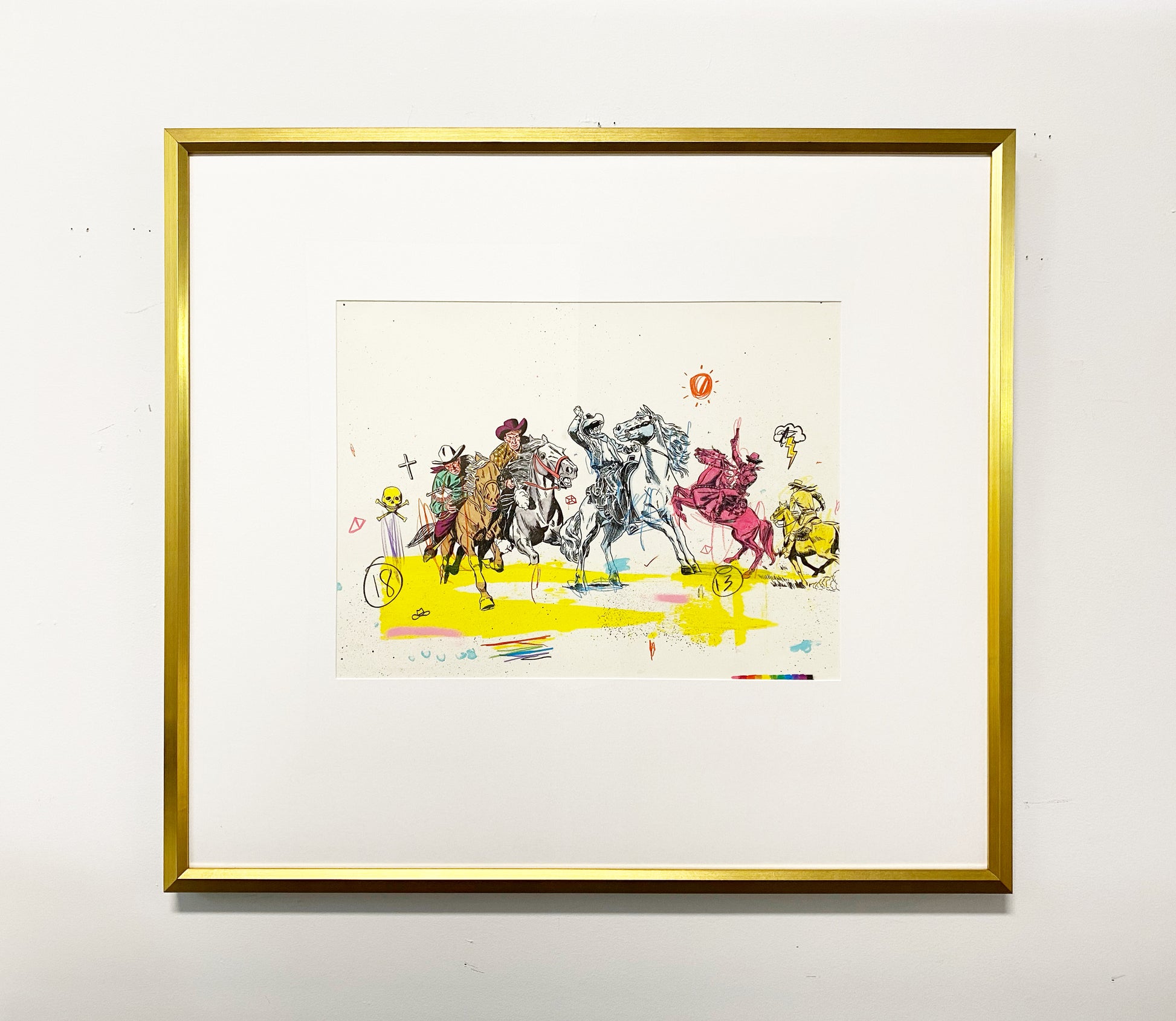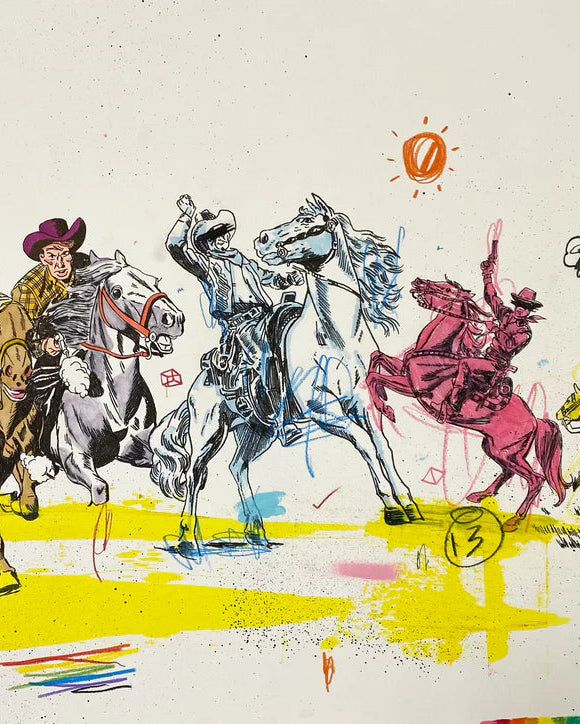 American (b. 1975). Matt Eddmenson, who graduated from The Art Academy of Cincinnati in 1999, draws from a range of influences and sources for his practice, including Cowboy Comics, Pop Art, and the work of Cy Twombly. His works are gatherings and reconfigurations of American imagery and iconography, commonly featuring cowboys, skulls, and rodeo horses. He also incorporates images from the golden age of comics and tattoo culture. Eddmenson explains: “I work from my memories as a child, I learned to draw by tracing comic book covers over and over until I was able to draw these characters from memory—I have a deep admiration for comic book art.” Works like 'You Keep Twistin My Words Around' (2020) and 'Don't Look at the Sun Too Long' (2020) demonstrate Eddmenson’s ability to reference western comics, his love for postmodern masters, and the great colorists of the 21st century.