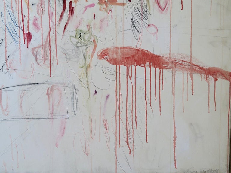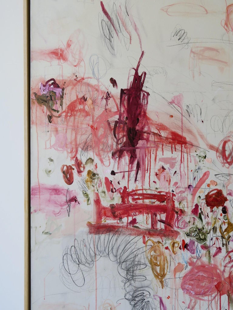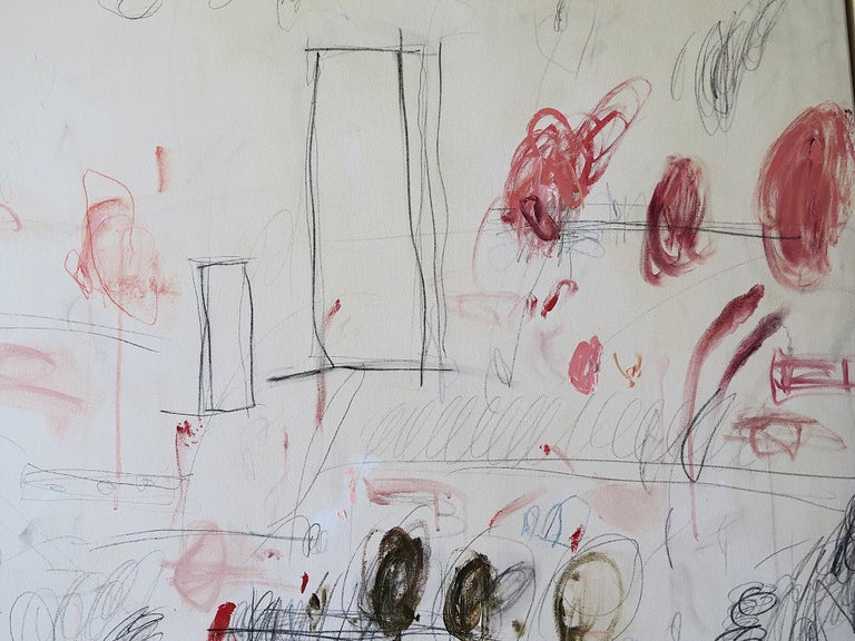 Large-scale abstract painting in hues of blush crimson consisting of acrylic, pencils, and oil pastels on canvas.