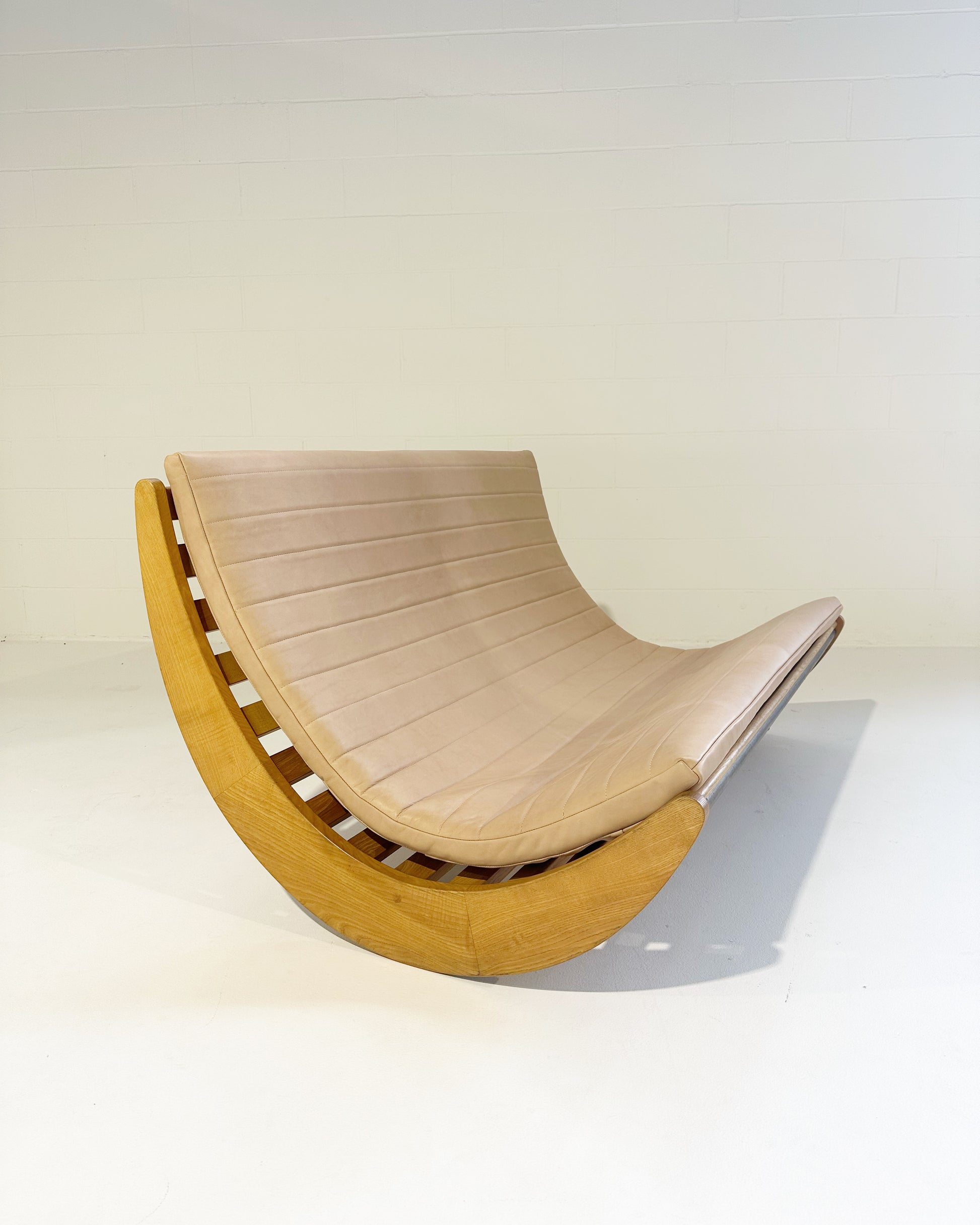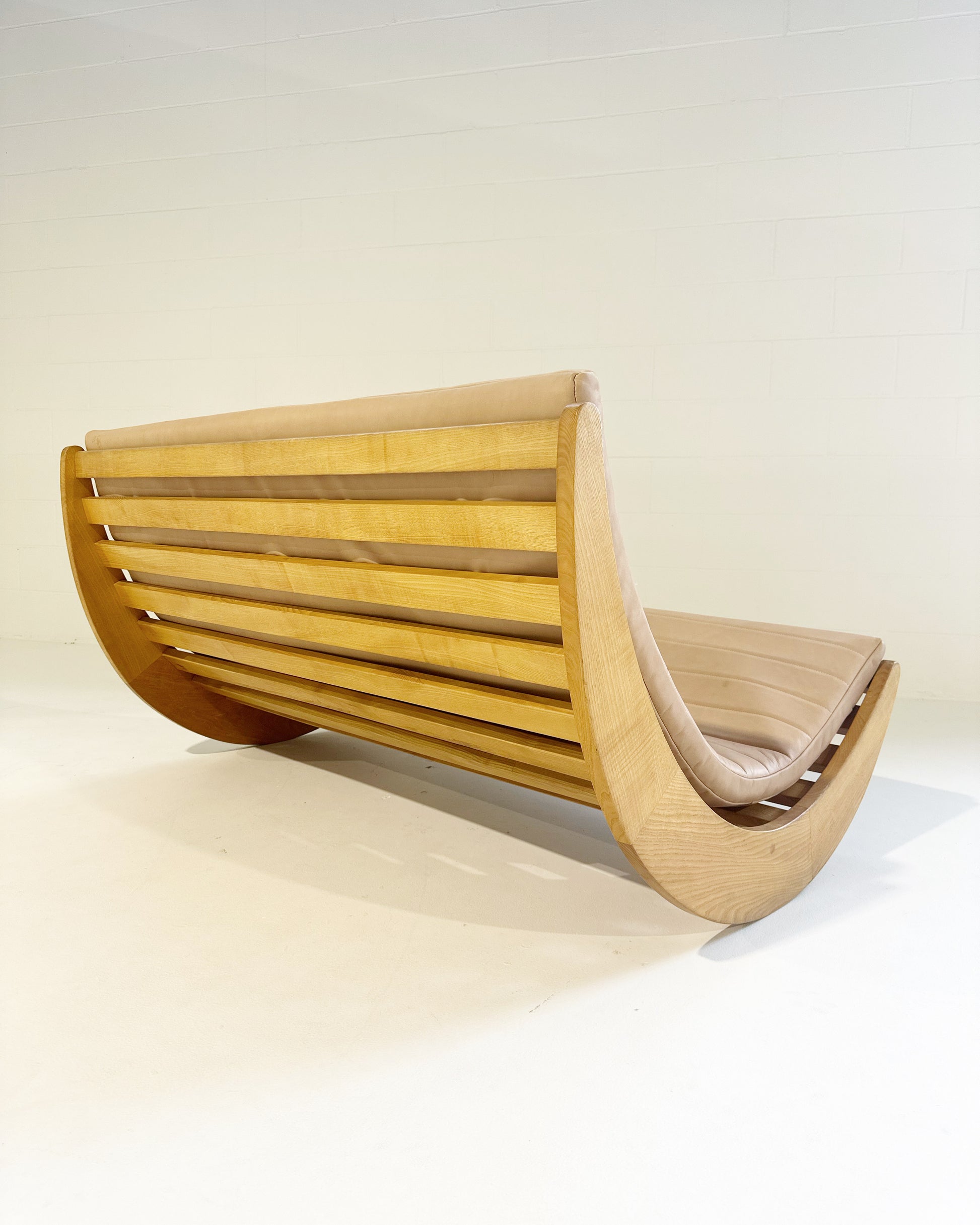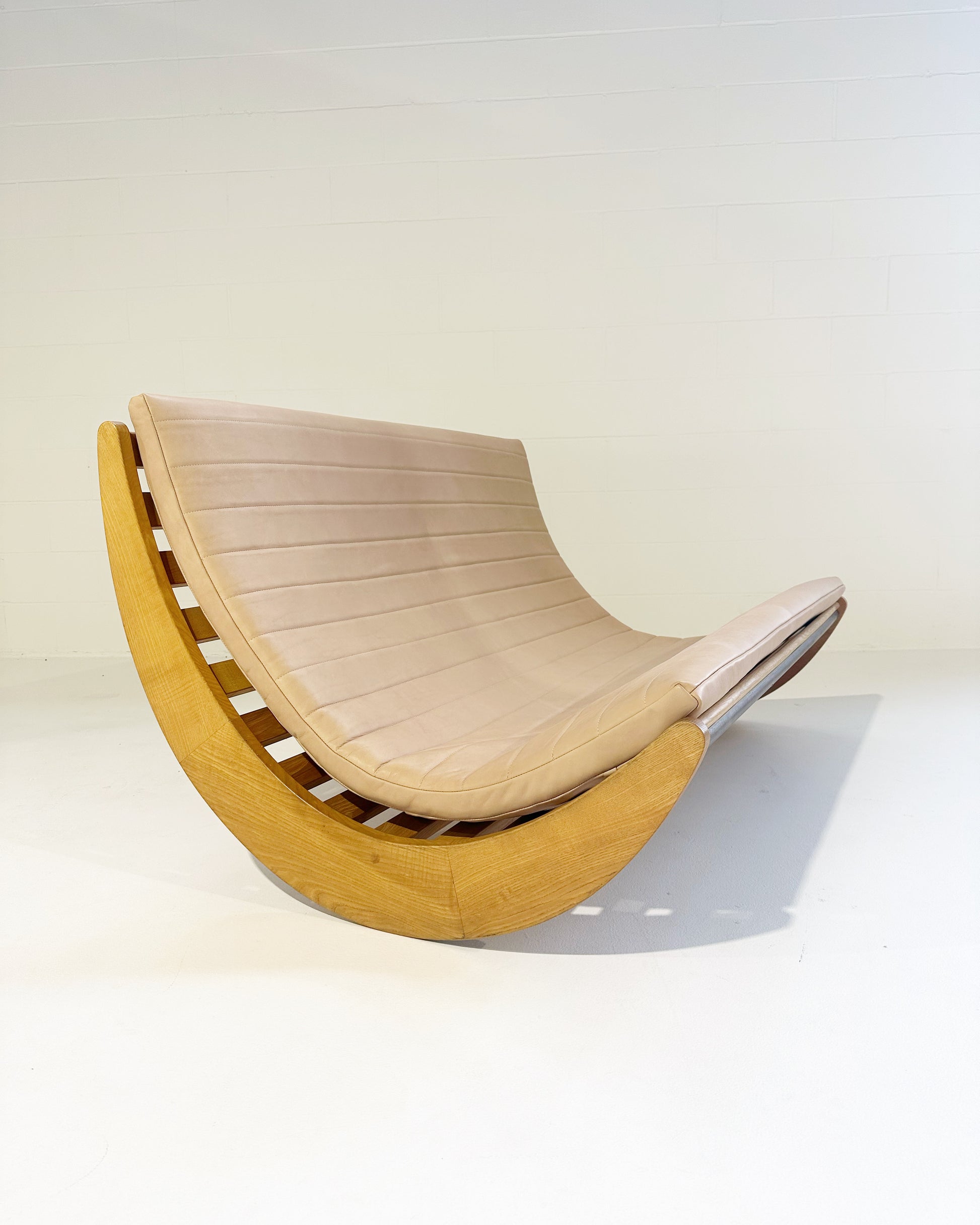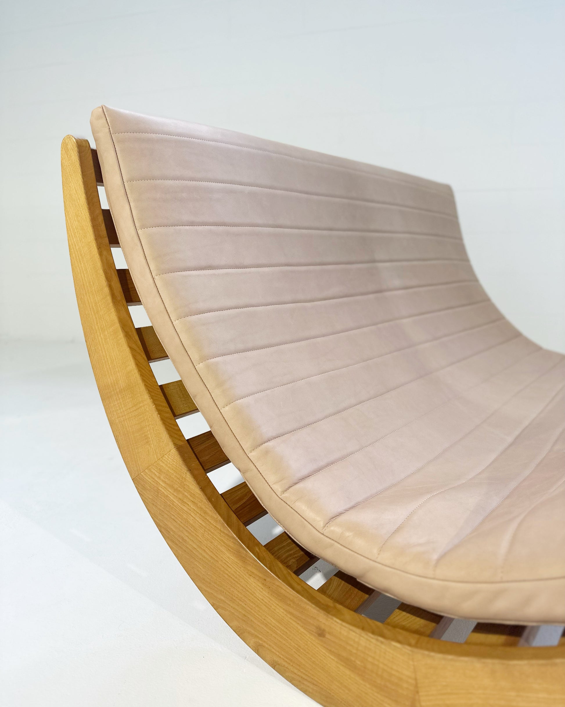We love this piece! Verner Panton loved a good futuristic design. We've seen many of the single rockers for one person. This double rocker is supreme. We added a channeled-leather cushion to the piece. The gorgeous saddle leather is from renowned Danish brand, Sorenson.