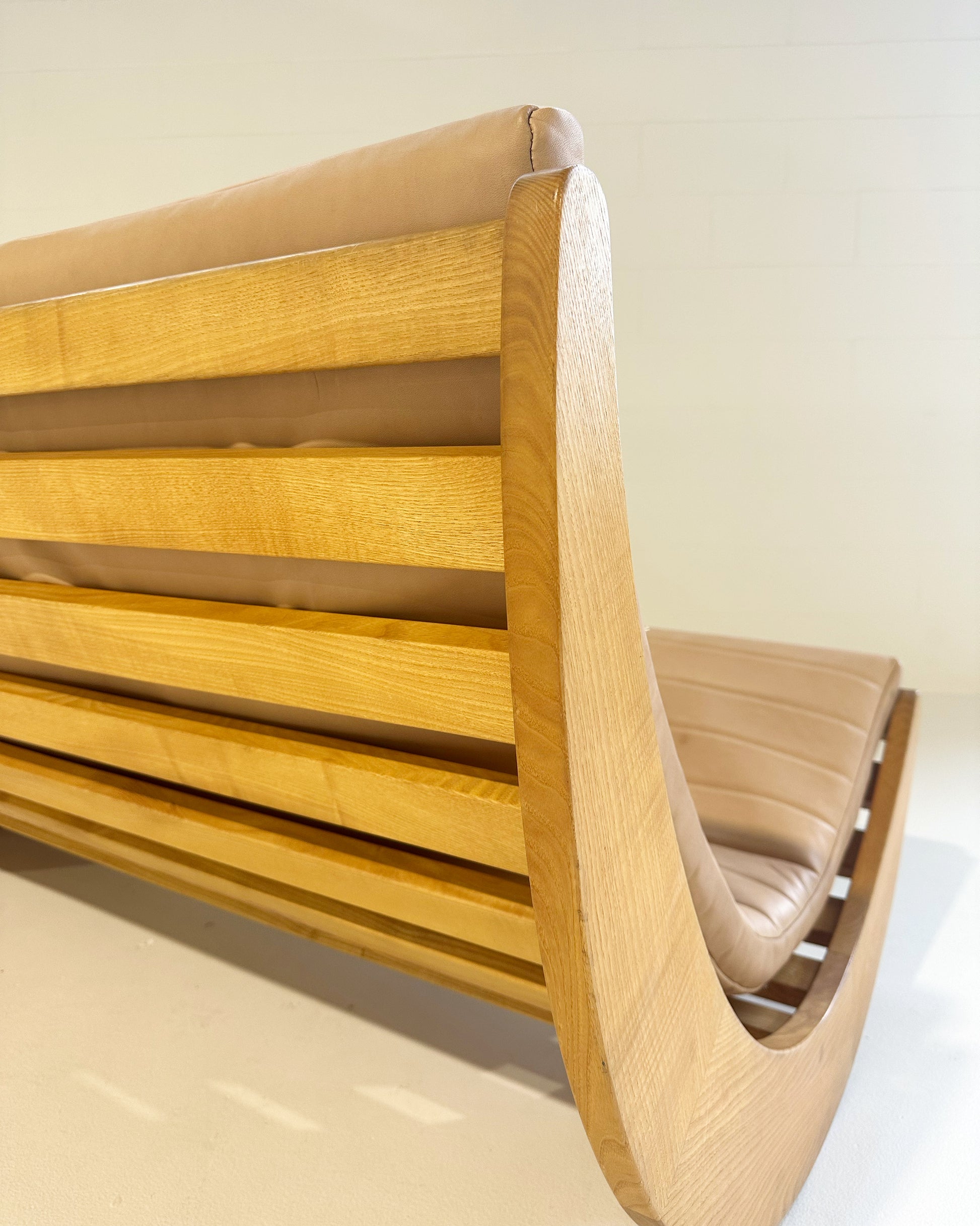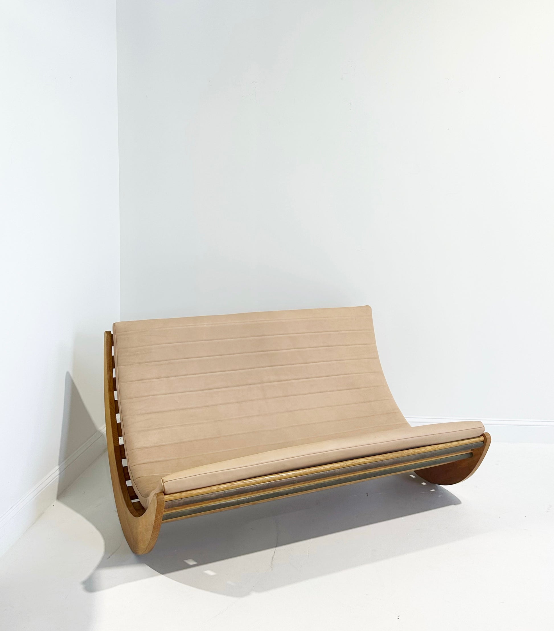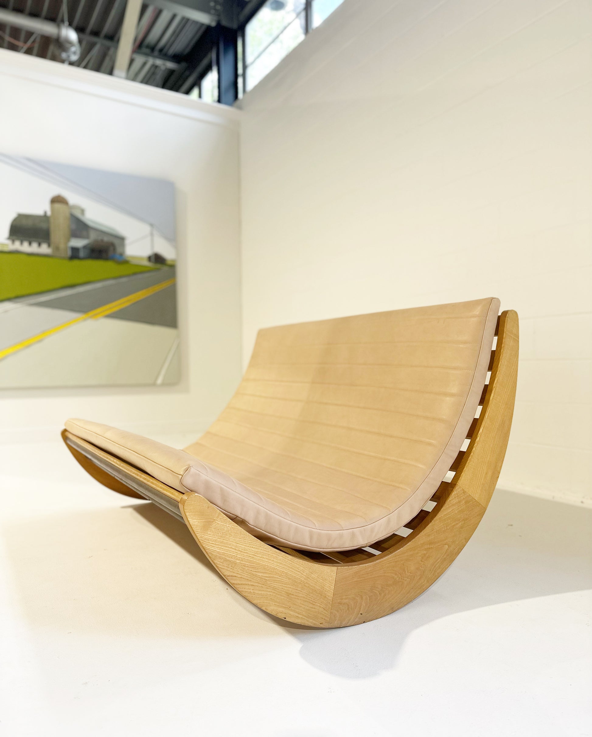 We love this piece! Verner Panton loved a good futuristic design. We've seen many of the single rockers for one person. This double rocker is supreme. We added a channeled-leather cushion to the piece. The gorgeous saddle leather is from renowned Danish brand, Sorenson.