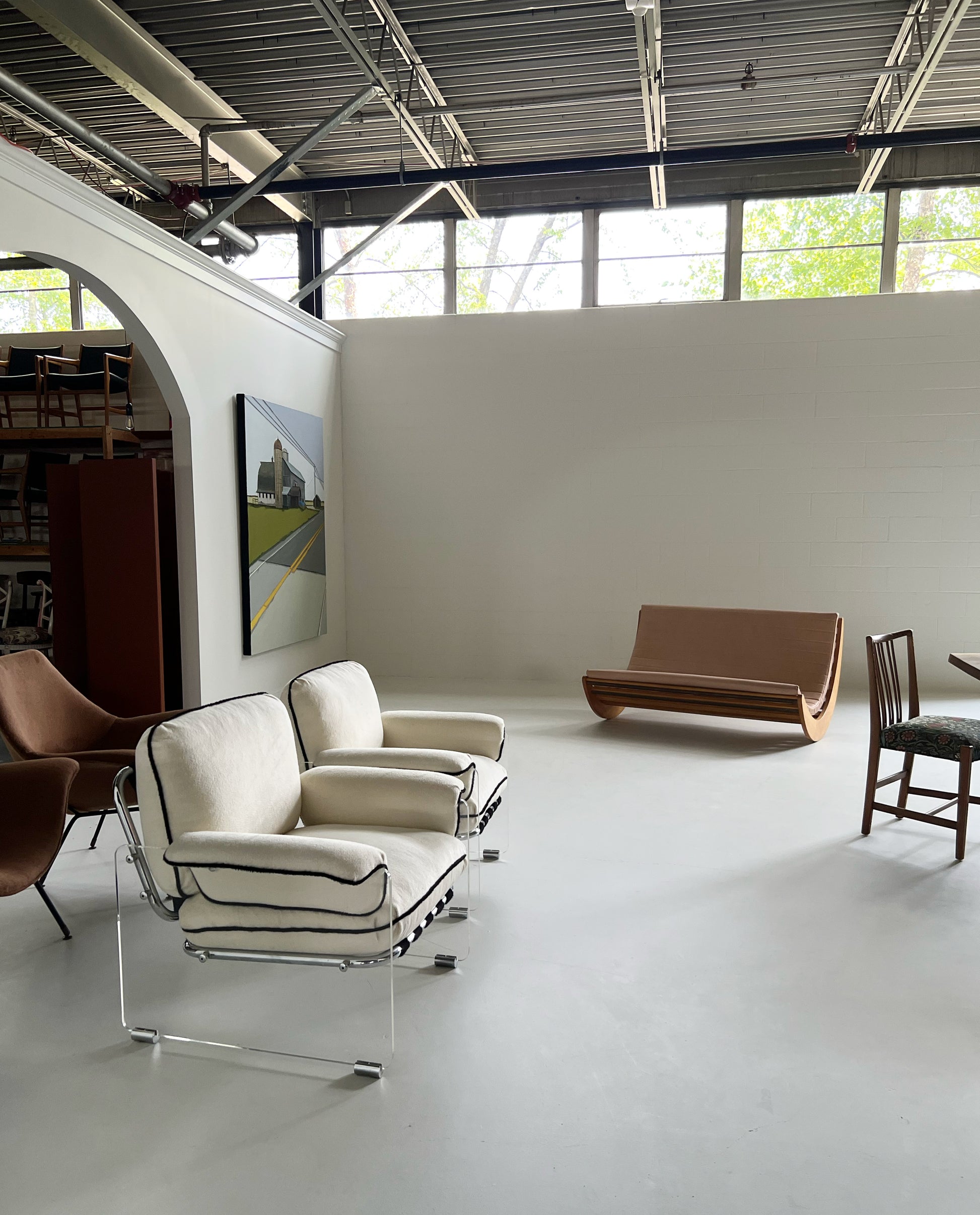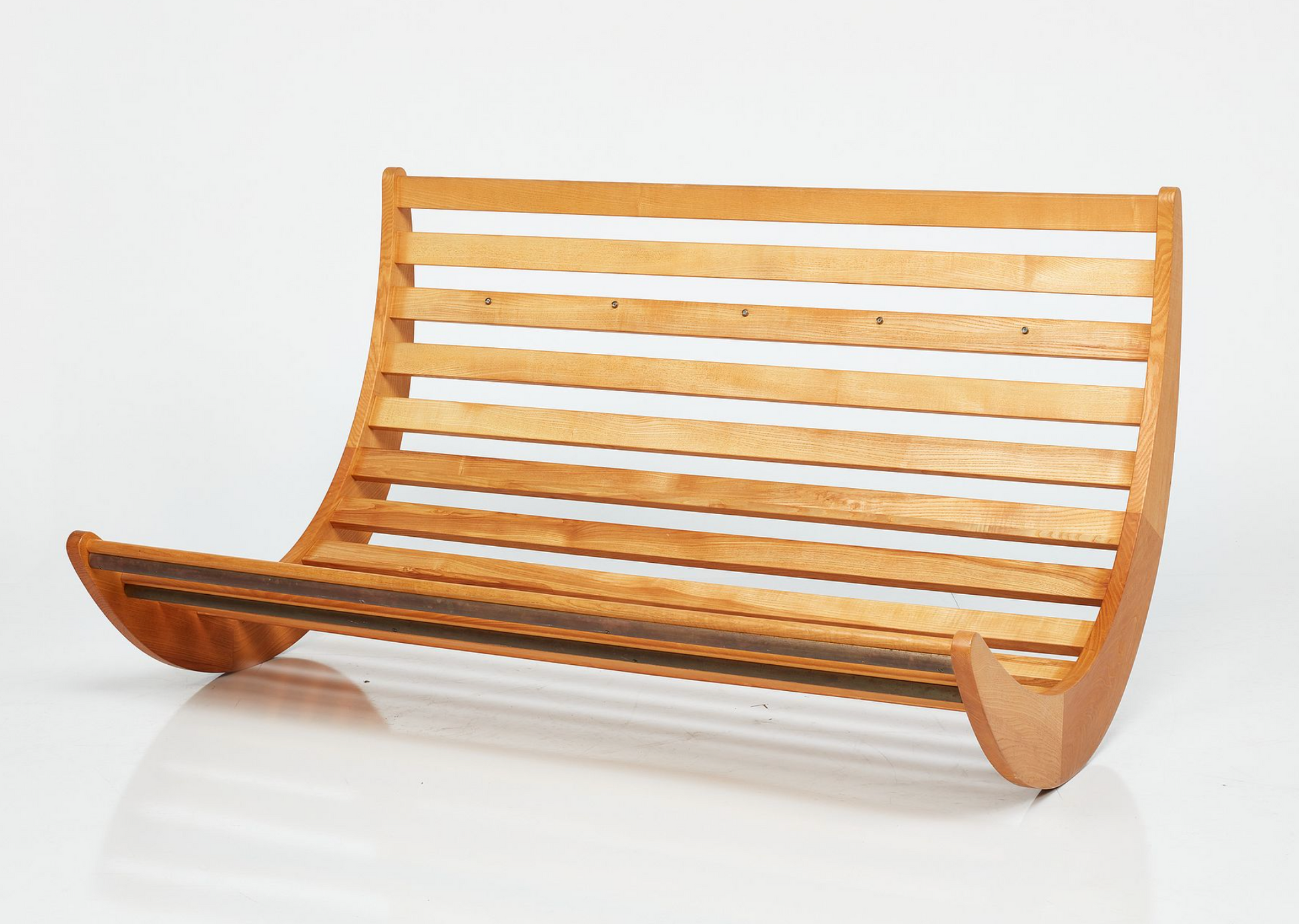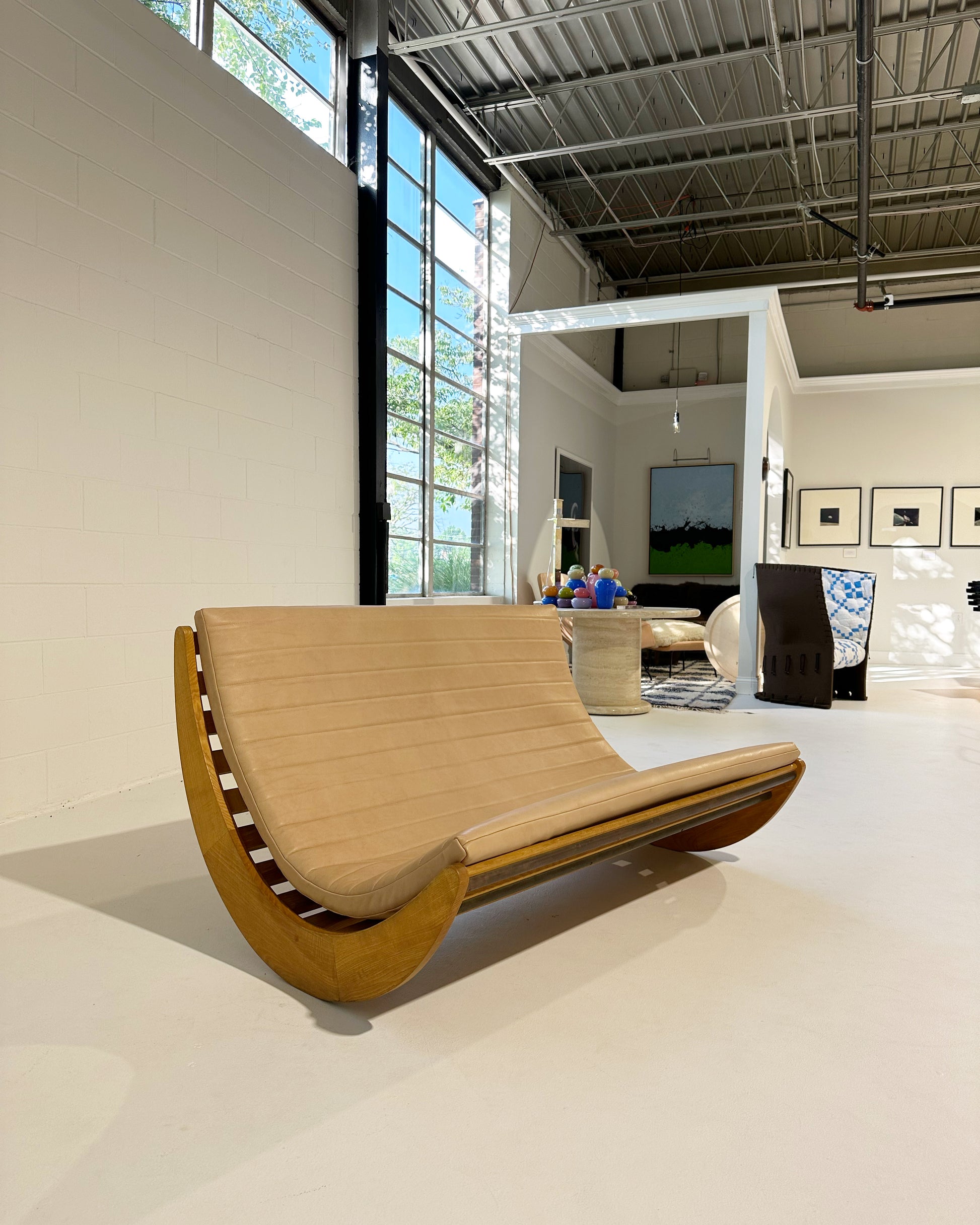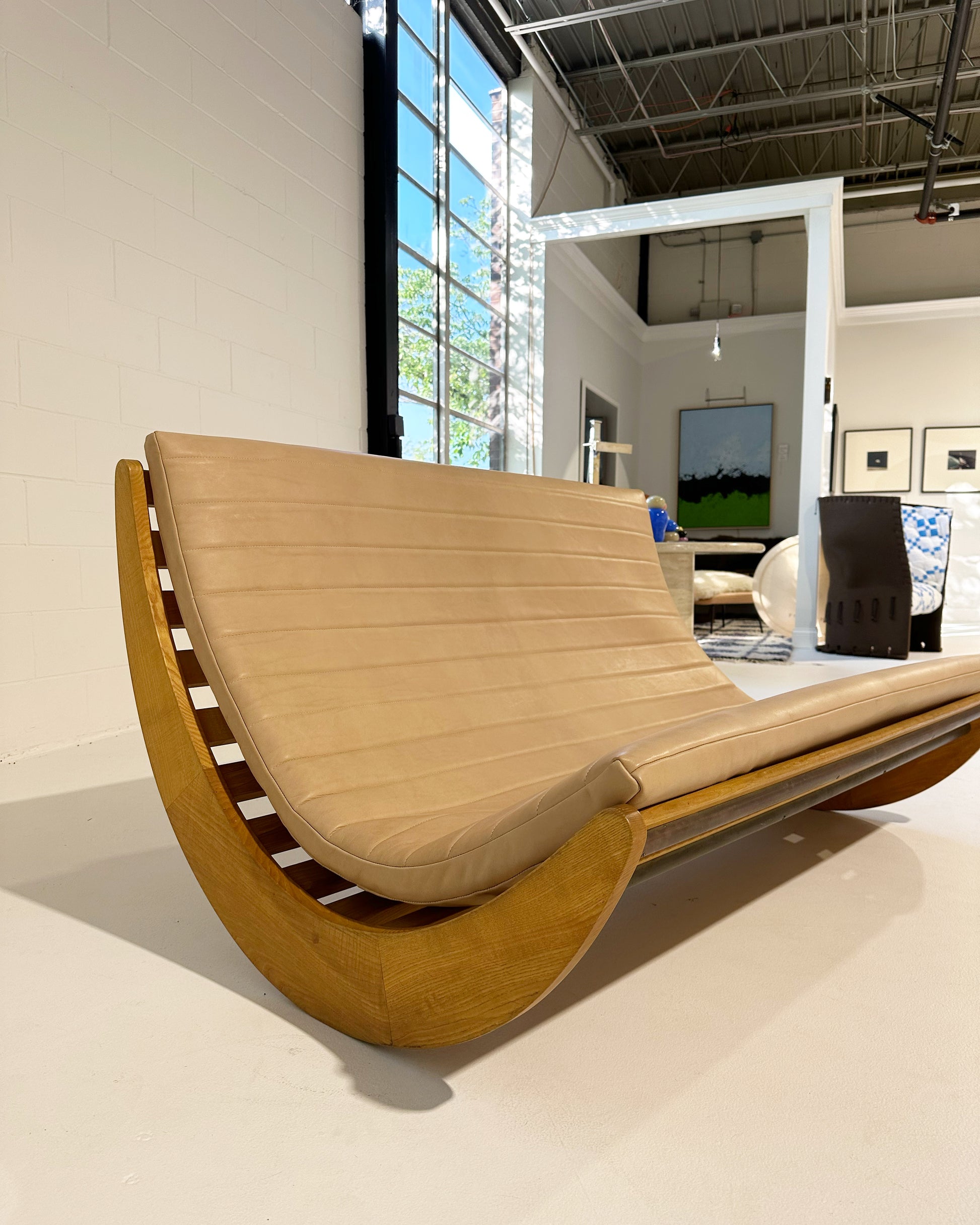 We love this piece! Verner Panton loved a good futuristic design. We've seen many of the single rockers for one person. This double rocker is supreme. We added a channeled-leather cushion to the piece. The gorgeous saddle leather is from renowned Danish brand, Sorenson.
