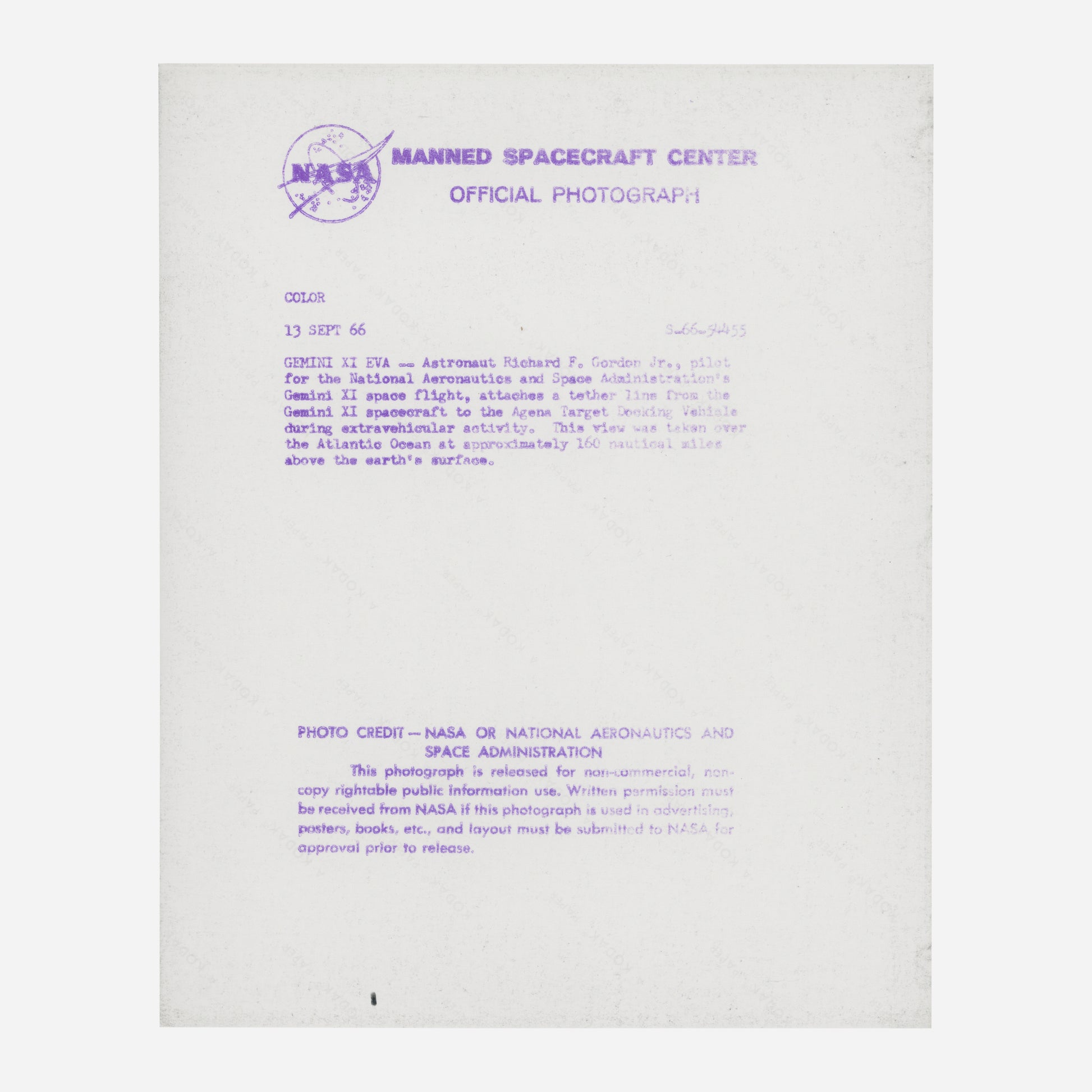 Numbered to upper margin 'NASA S-66-54454' with 'A Kodak Paper' watermarks to verso.