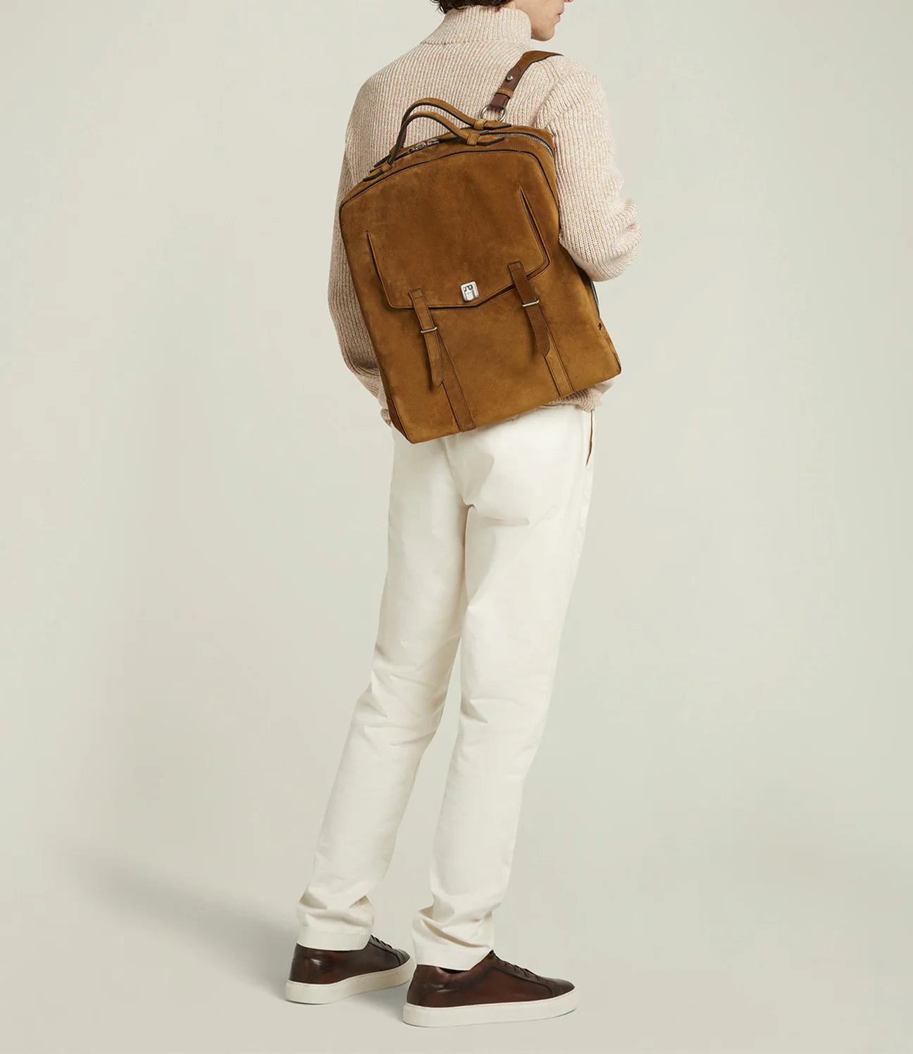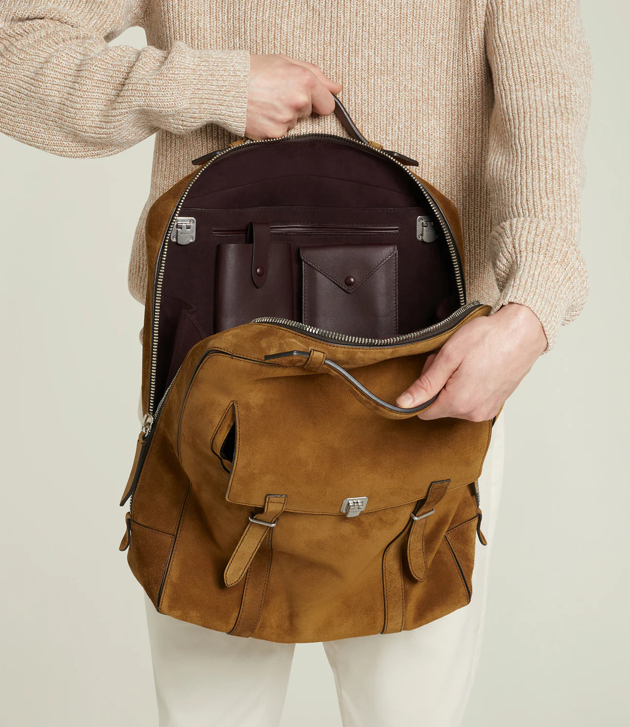Handcrafted in Italy, the Rider Backpack features a sleek, streamlined exterior and an arsenal of interior organisational compartments, including a 14” laptop sleeve and hidden magnetic pockets in back. The Rider is compatible with our multi-tasking Runaway portfolio, which clips neatly inside, and is finished with solid brass hardware.