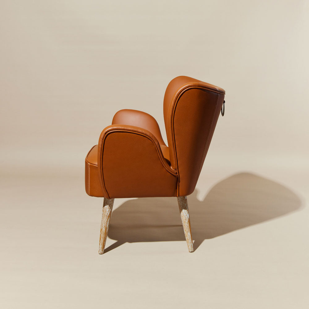 One of the iconic pieces in the Bönan collection, Saddle is an armchair with a timeless aesthetic. The upholstered seat covered in leather gives the cushioning a visually predominant role in dialogue with the wooden structure, whose pickled oak finish lends preciousness to the whole.