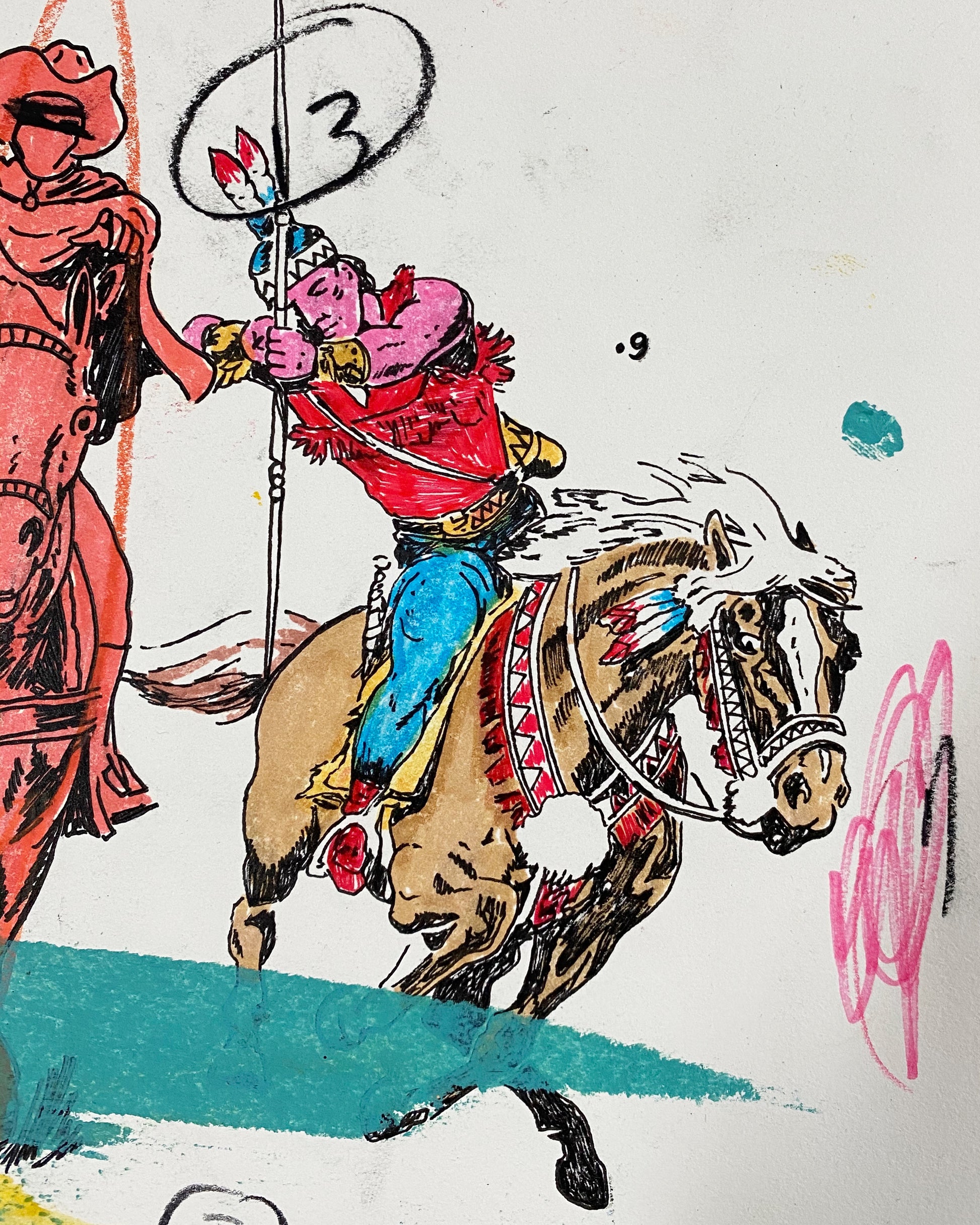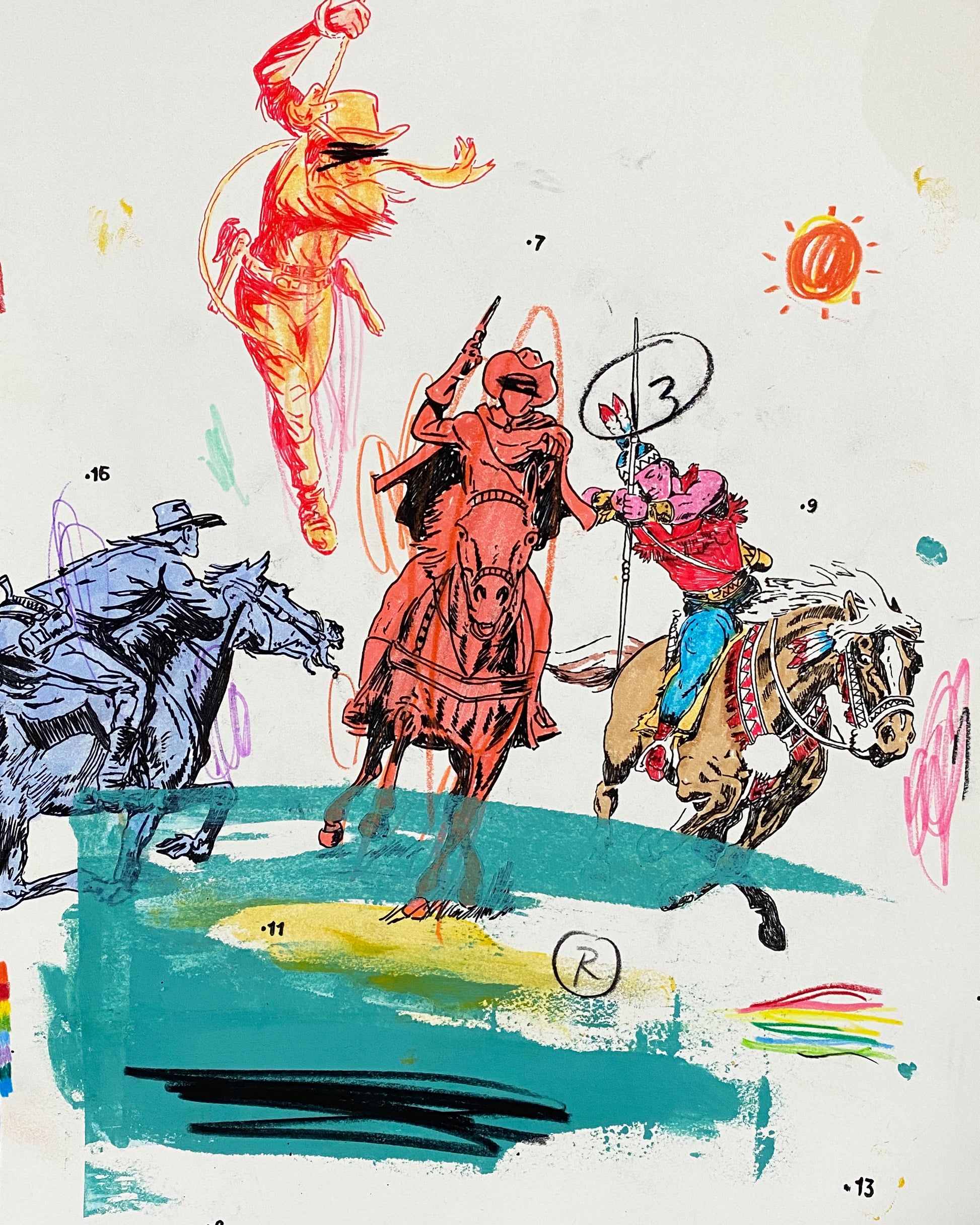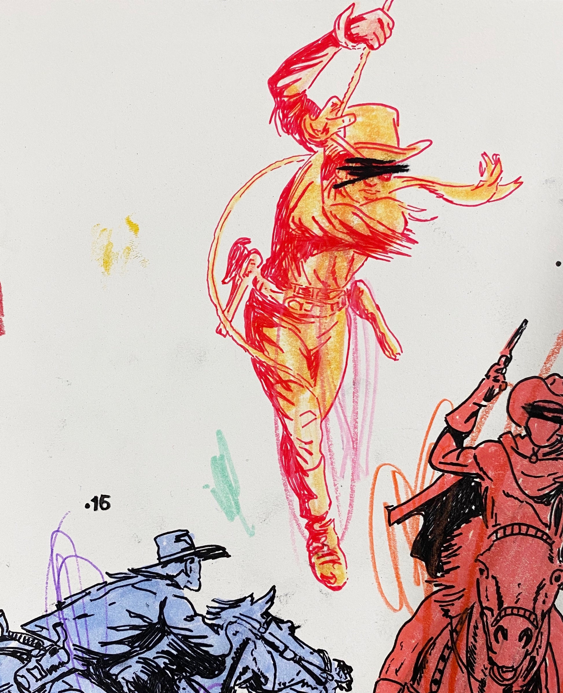 American (b. 1975). Matt Eddmenson, who graduated from The Art Academy of Cincinnati in 1999, draws from a range of influences and sources for his practice, including Cowboy Comics, Pop Art, and the work of Cy Twombly. His works are gatherings and reconfigurations of American imagery and iconography, commonly featuring cowboys, skulls, and rodeo horses. He also incorporates images from the golden age of comics and tattoo culture. Eddmenson explains: “I work from my memories as a child, I learned to draw by tracing comic book covers over and over until I was able to draw these characters from memory—I have a deep admiration for comic book art.” Works like 'You Keep Twistin My Words Around' (2020) and 'Don't Look at the Sun Too Long' (2020) demonstrate Eddmenson’s ability to reference western comics, his love for postmodern masters, and the great colorists of the 21st century.