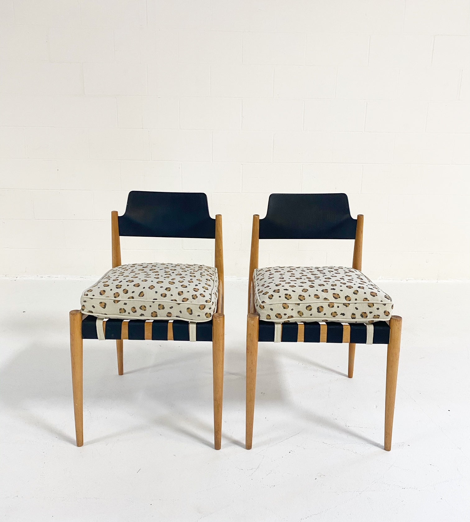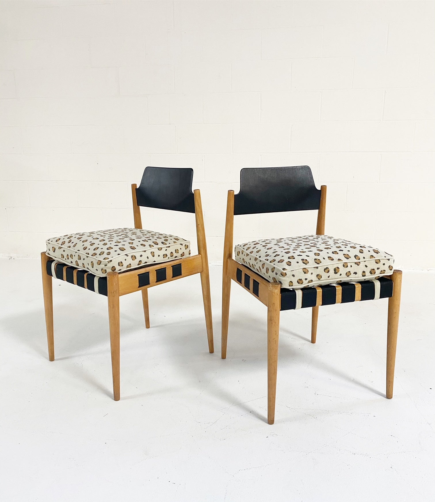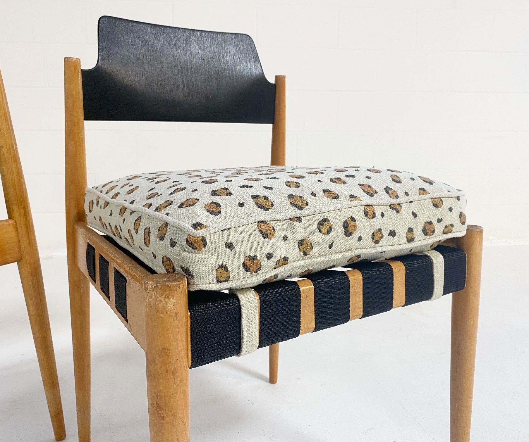 We created a custom cushion fashioned from a beautifully embroidered Chelsea Textiles Leopard fabric. The color choice of this gorgeous fabric is perfect as it plays against the blond beech and black back of this incredible chair. The chair consists of a basic but beautiful design including four tapered legs with a woven seating of black fabric webbing. Stunning!