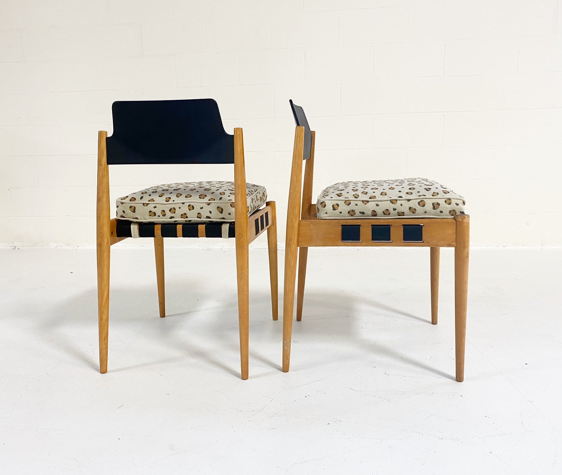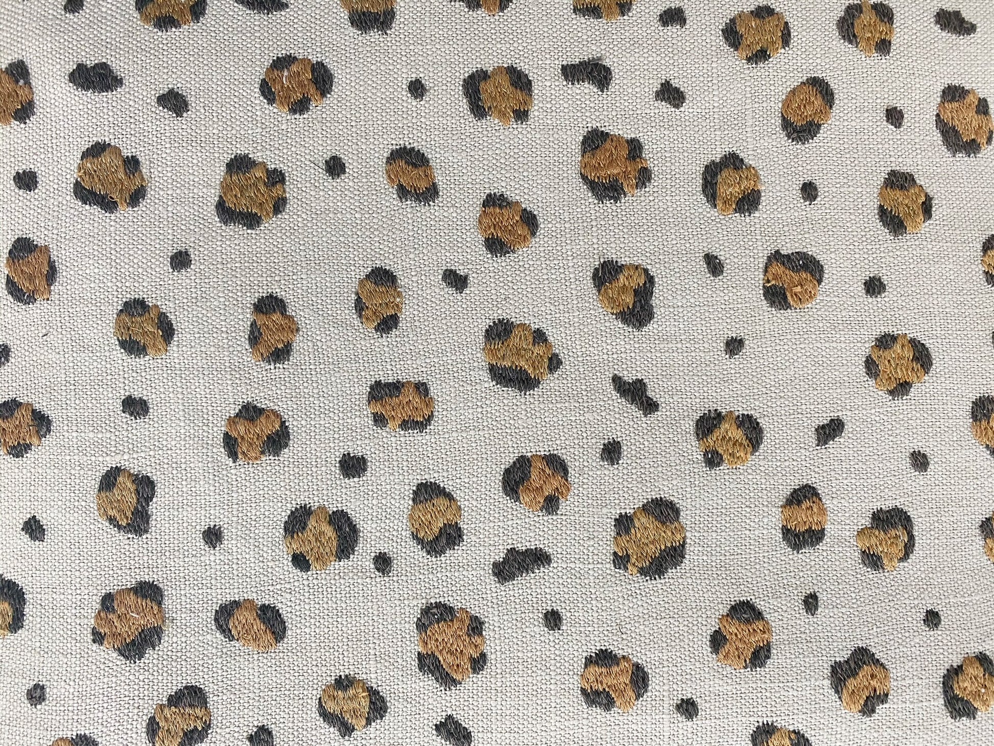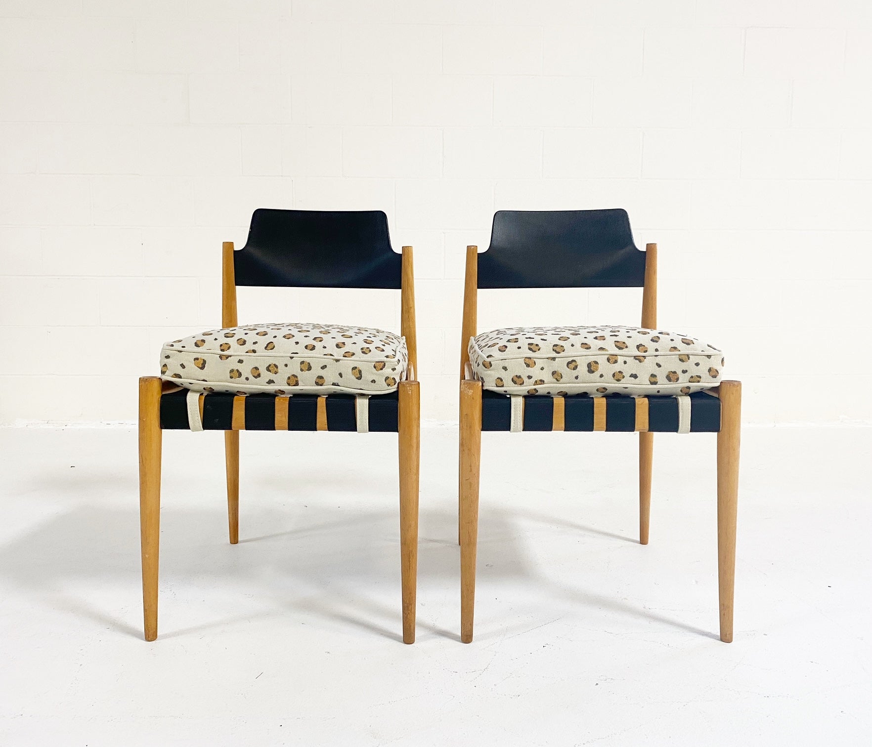 We created a custom cushion fashioned from a beautifully embroidered Chelsea Textiles Leopard fabric. The color choice of this gorgeous fabric is perfect as it plays against the blond beech and black back of this incredible chair. The chair consists of a basic but beautiful design including four tapered legs with a woven seating of black fabric webbing. Stunning!