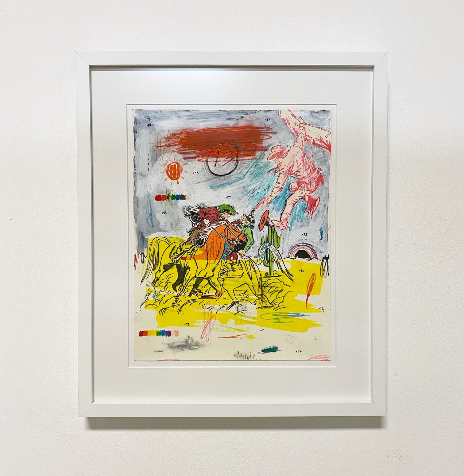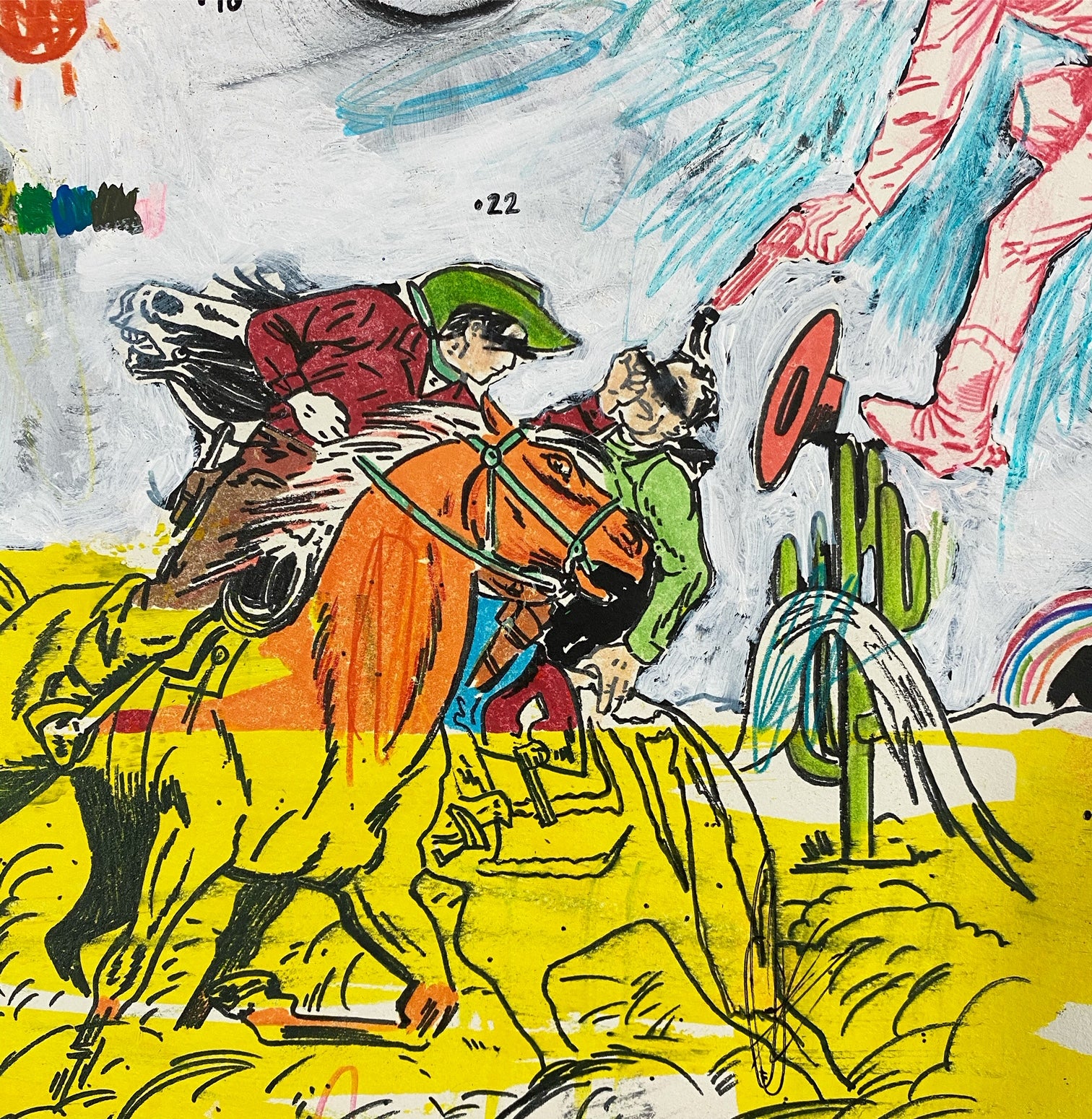American (b. 1975). Matt Eddmenson, who graduated from The Art Academy of Cincinnati in 1999, draws from a range of influences and sources for his practice, including Cowboy Comics, Pop Art, and the work of Cy Twombly. His works are gatherings and reconfigurations of American imagery and iconography, commonly featuring cowboys, skulls, and rodeo horses. He also incorporates images from the golden age of comics and tattoo culture. Eddmenson explains: “I work from my memories as a child, I learned to draw by tracing comic book covers over and over until I was able to draw these characters from memory—I have a deep admiration for comic book art.” Works like 'You Keep Twistin My Words Around' (2020) and 'Don't Look at the Sun Too Long' (2020) demonstrate Eddmenson’s ability to reference western comics, his love for postmodern masters, and the great colorists of the 21st century.