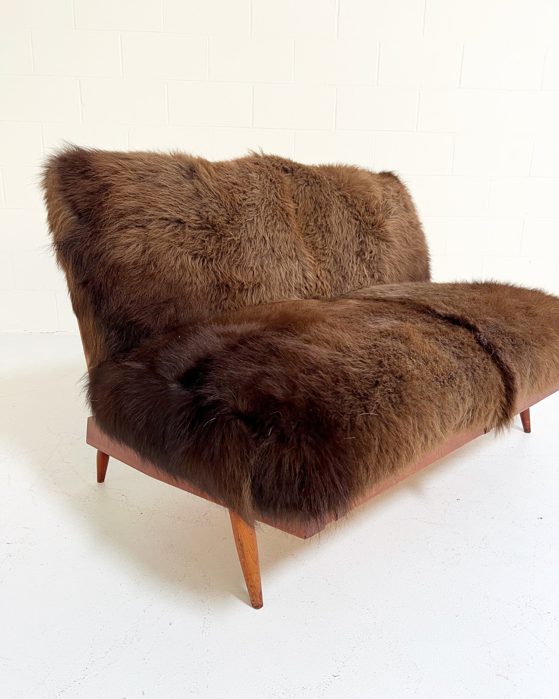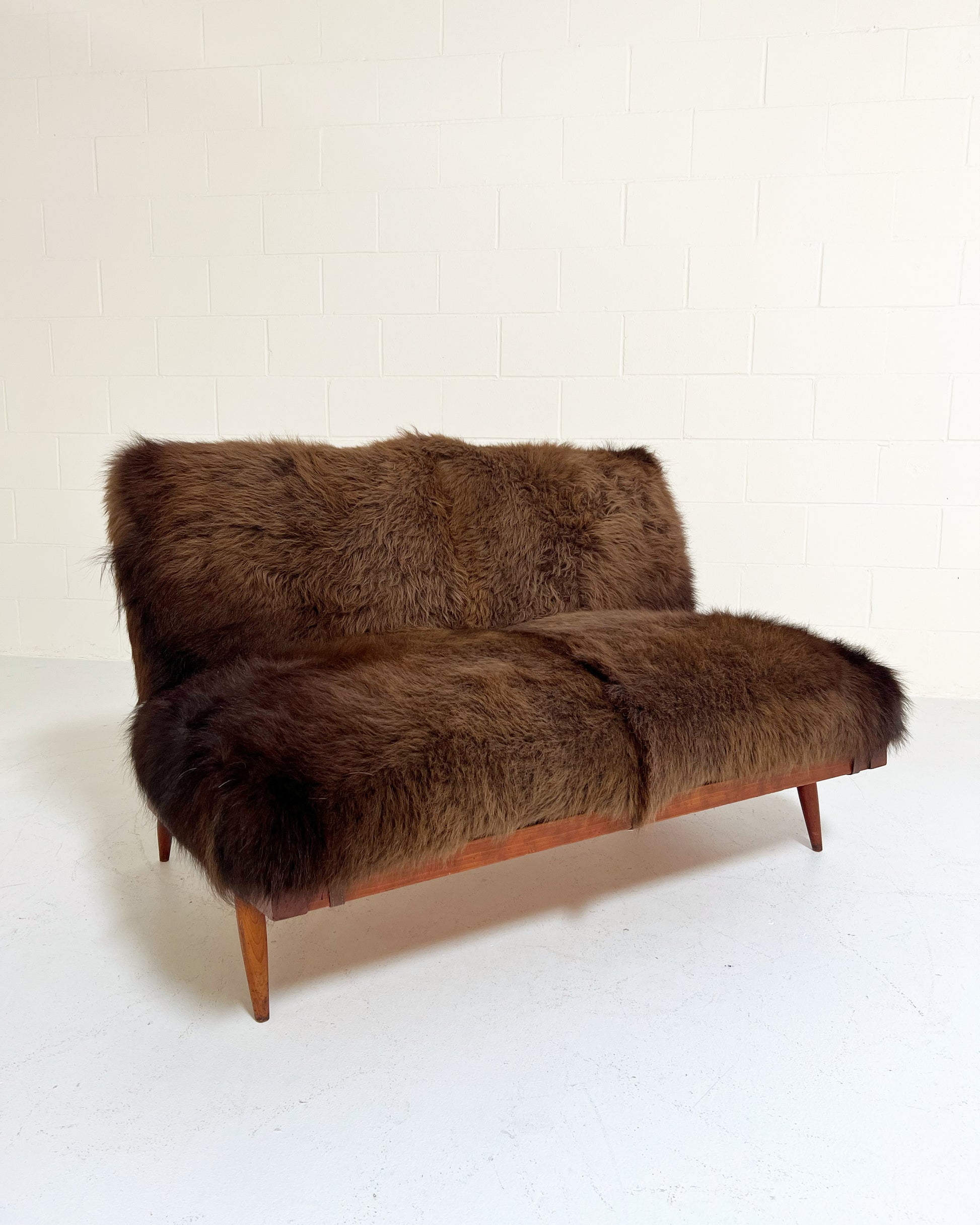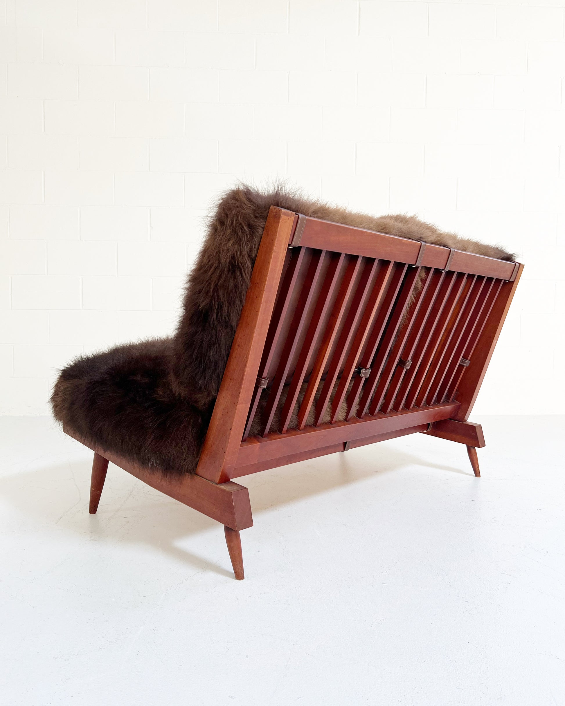 Nakashima's settee is a design lover's dream. Simple wood craftmanship at its finest. The cushions are custom and crafted of thick and soft bison hide. Each is generously filled with feathers for a most comfortable seat. We love how the chocolate brown bison hide complements the American cherry wood. This two-seat settee is incredibly handsome and destined for an equally beautiful room.