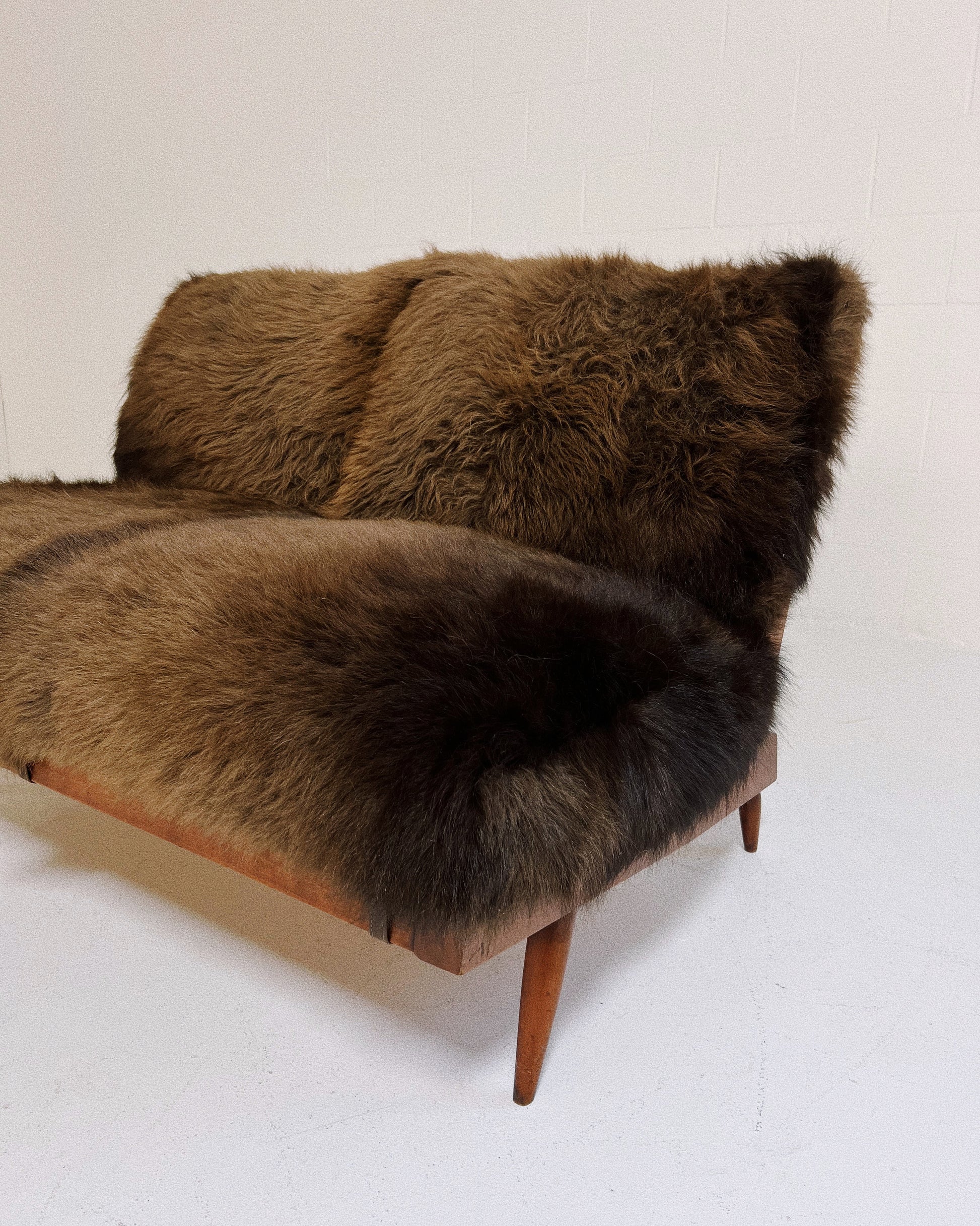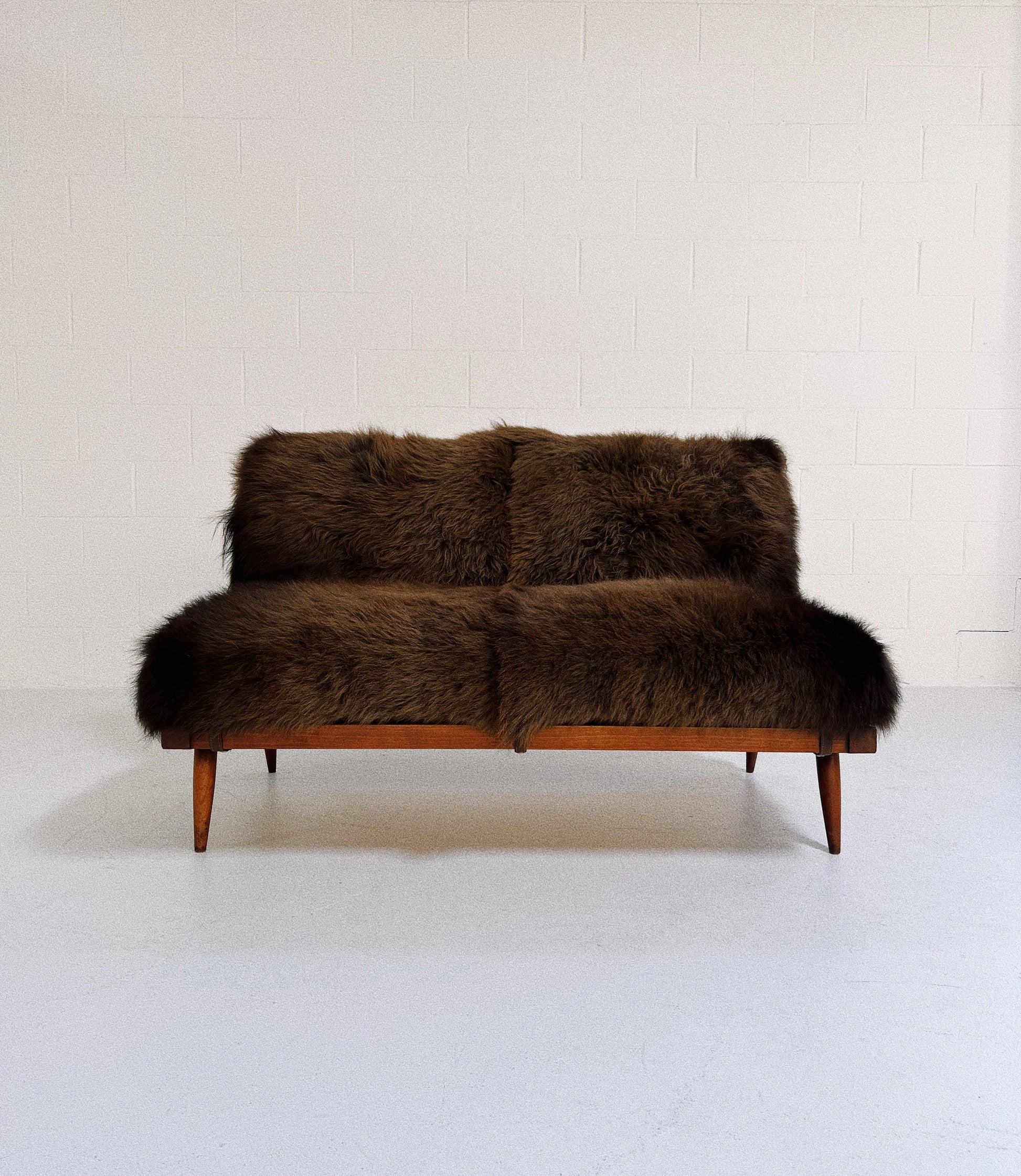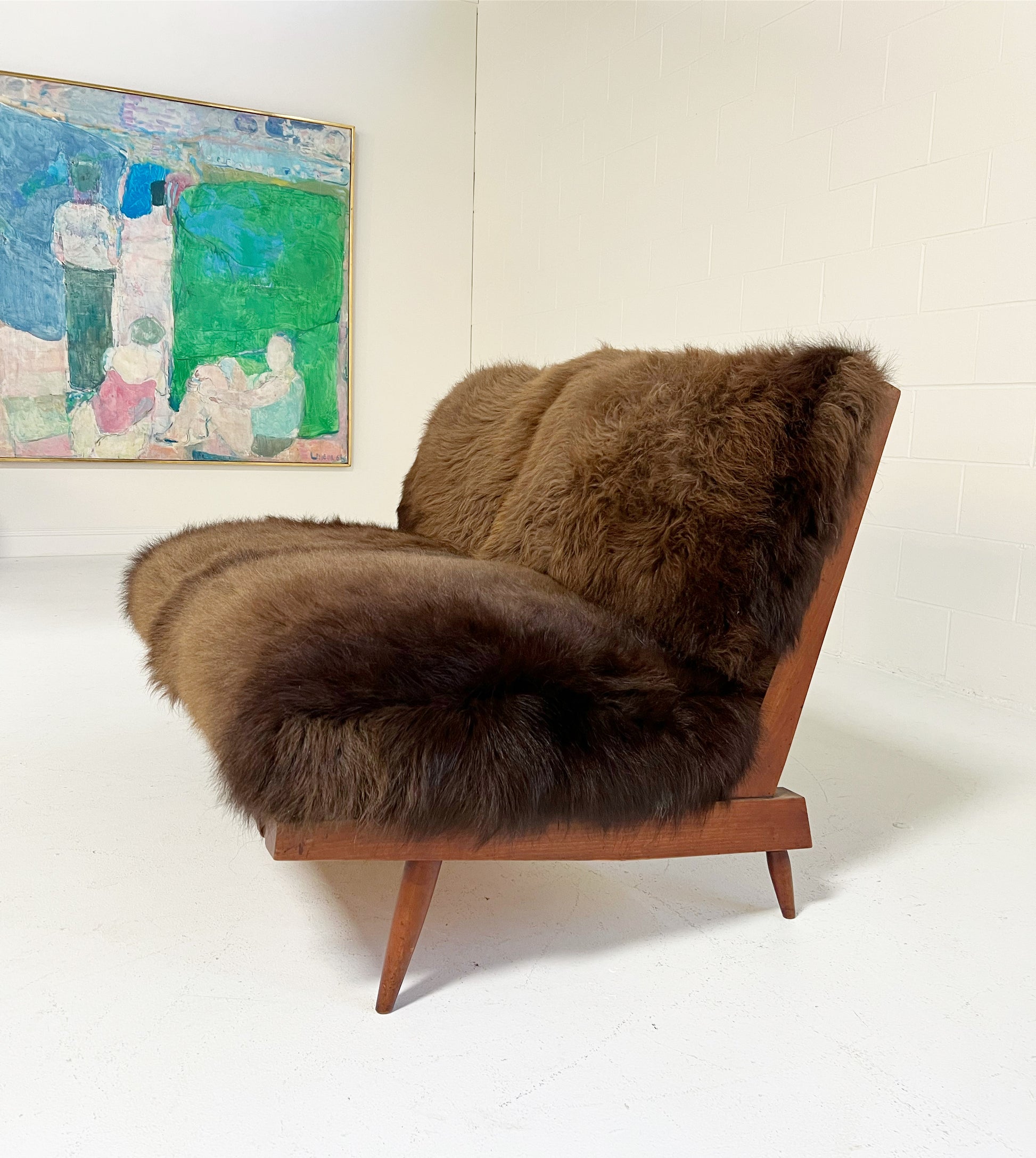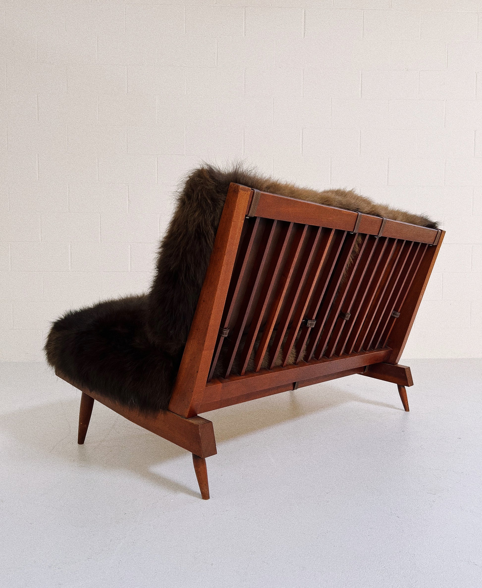 Nakashima's settee is a design lover's dream. Simple wood craftmanship at its finest. The cushions are custom and crafted of thick and soft bison hide. Each is generously filled with feathers for a most comfortable seat. We love how the chocolate brown bison hide complements the American cherry wood. This two-seat settee is incredibly handsome and destined for an equally beautiful room.