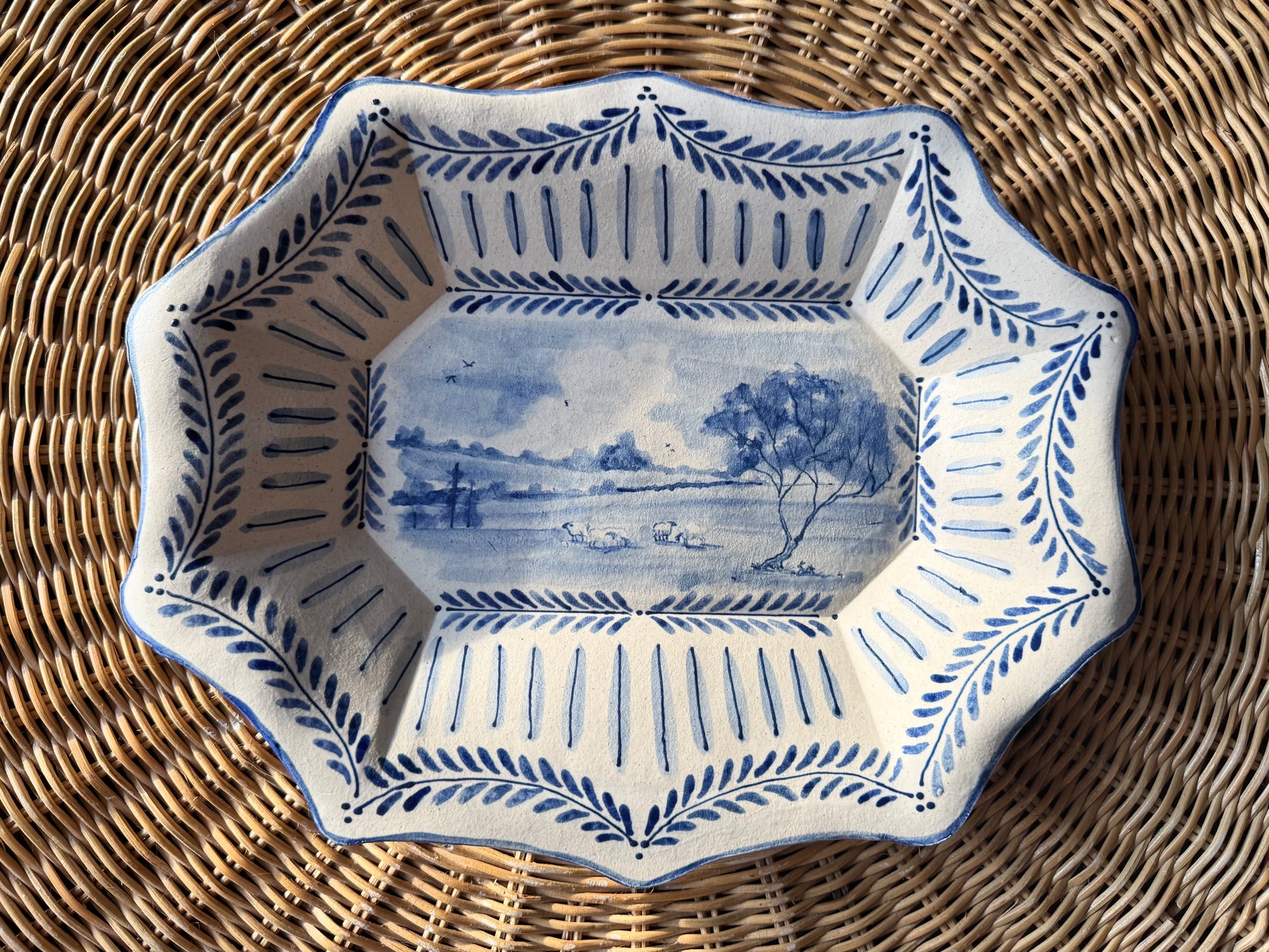 The Country Gentleman Collection by artist Maggie Robertson is a beautiful series of one-of-a-kind stoneware vessels. Each unique piece embraces the seams and irregularities of her hand-built technique complemented by intricate, hand-painted scenes of the English countryside in classic blue and white. The vessels are water tight and food safe, microwaveable and dishwasher safe; however, as they are art pieces and fragile, we would recommend hand washing.