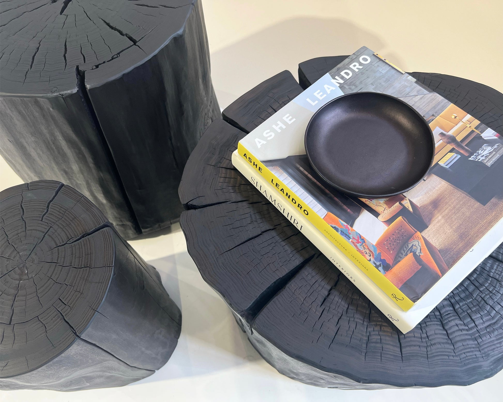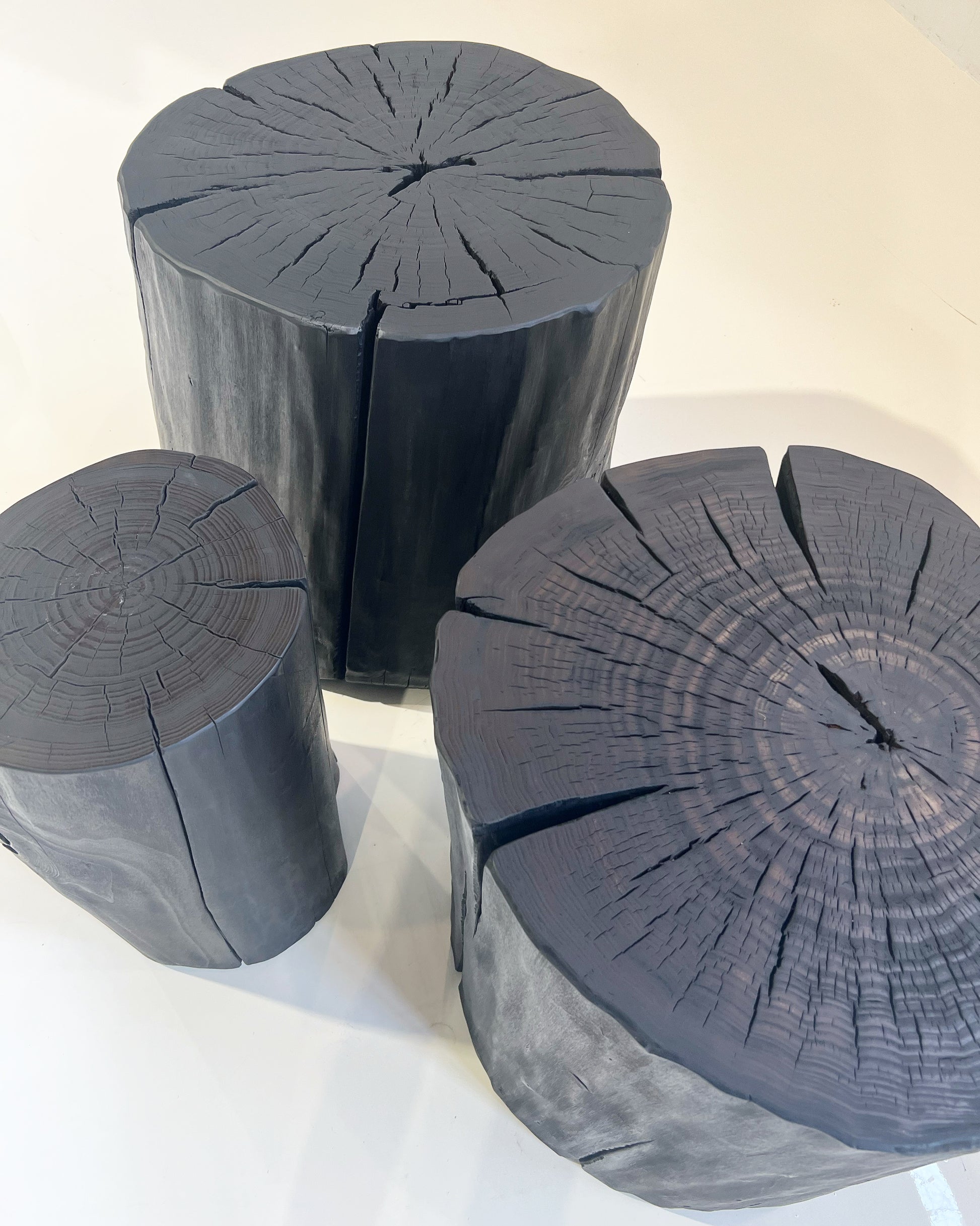 Beautiful, one-of-a-kind Shou Sugi Ban Log Side Tables from David Stine.