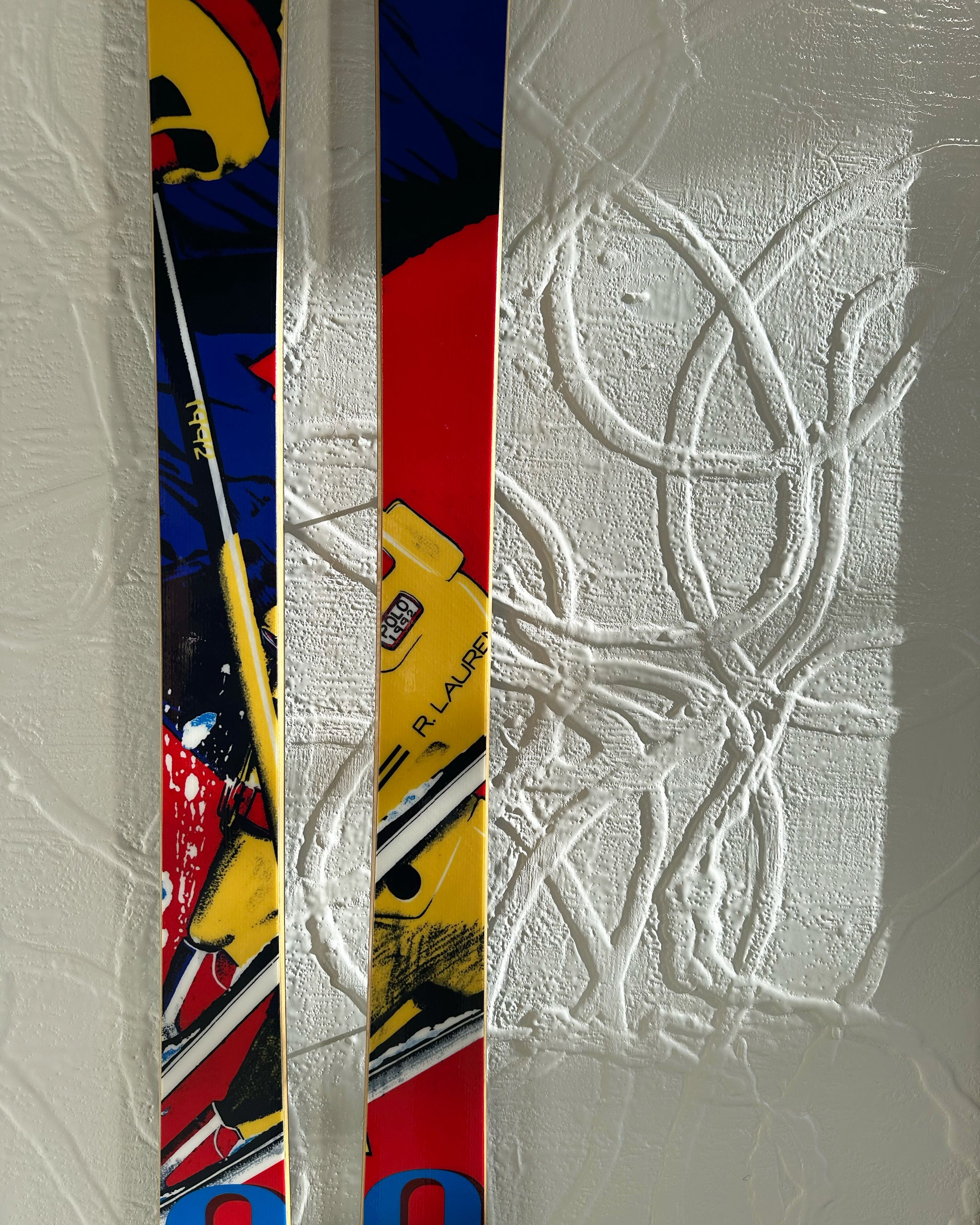 About the Skis | Custom-made in East Boston by Parlor Skis & Snowboards from maple and poplar wood, this limited-edition set of decorative skis is prominently printed with Ralph Lauren's iconic “Ski ’92” motif that depicts a skier mid-jump and debuted in Ralph Lauren’s Fall 1992 collection. These skis, like the apparel in the original collection, feature illustrations of downhill ski boots and bindings with custom “R. LAUREN,” “R93,” and “POLO 1992” markings. Limited to 15 sets of skis. Dimensions: 70" L x 3.75" W x .25" H