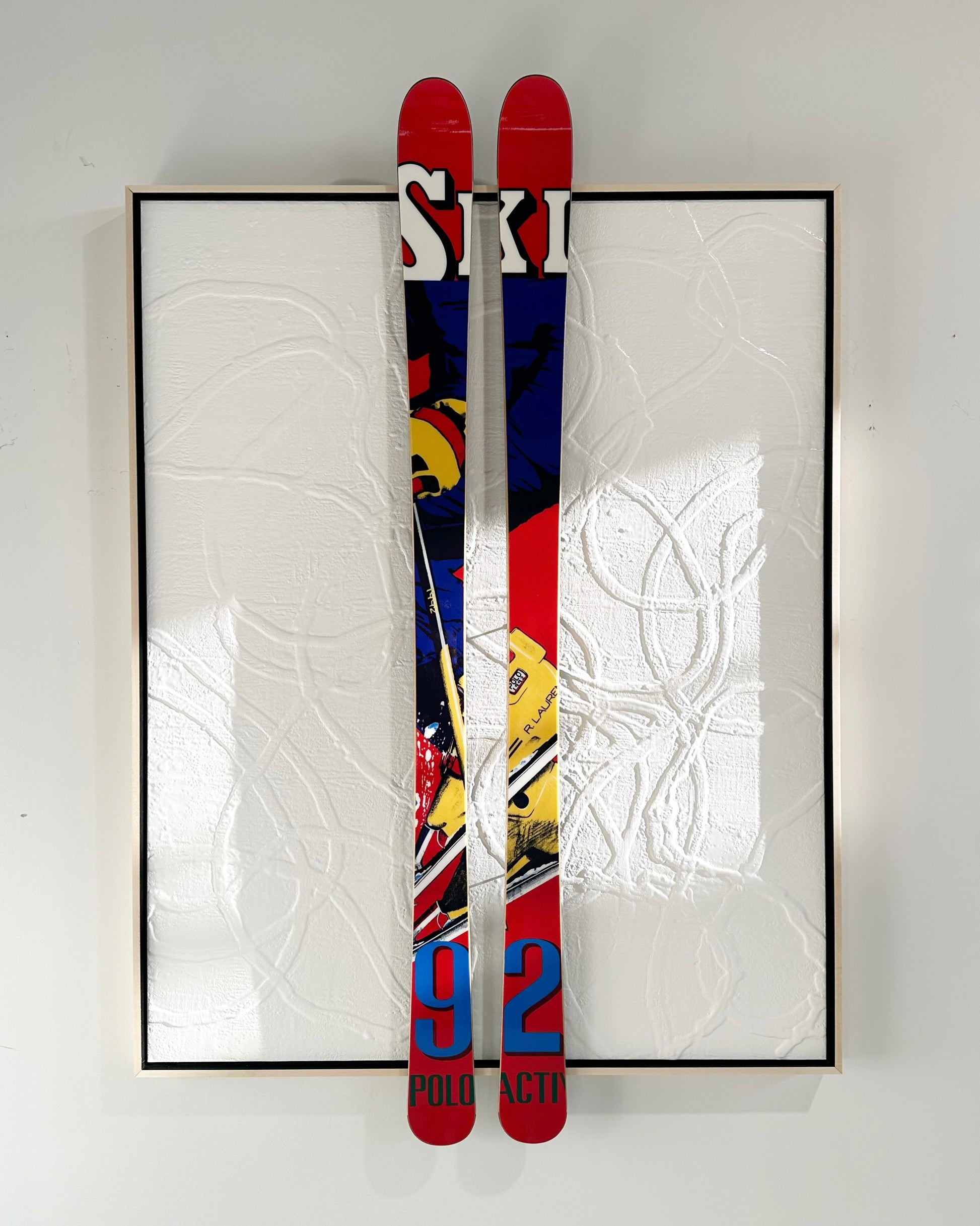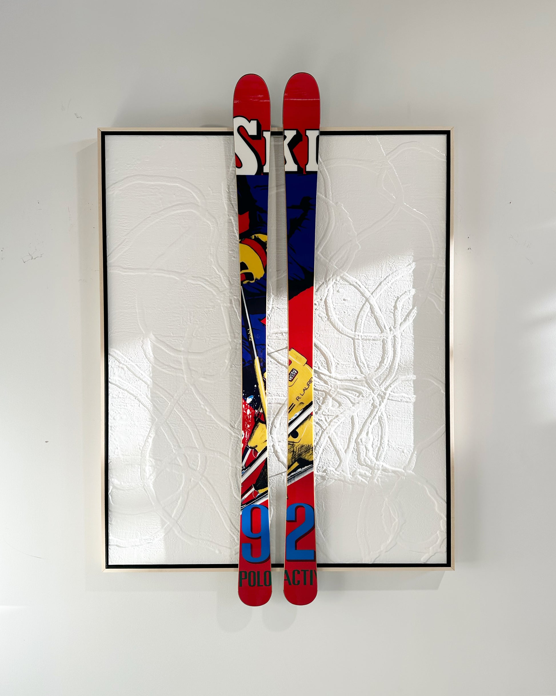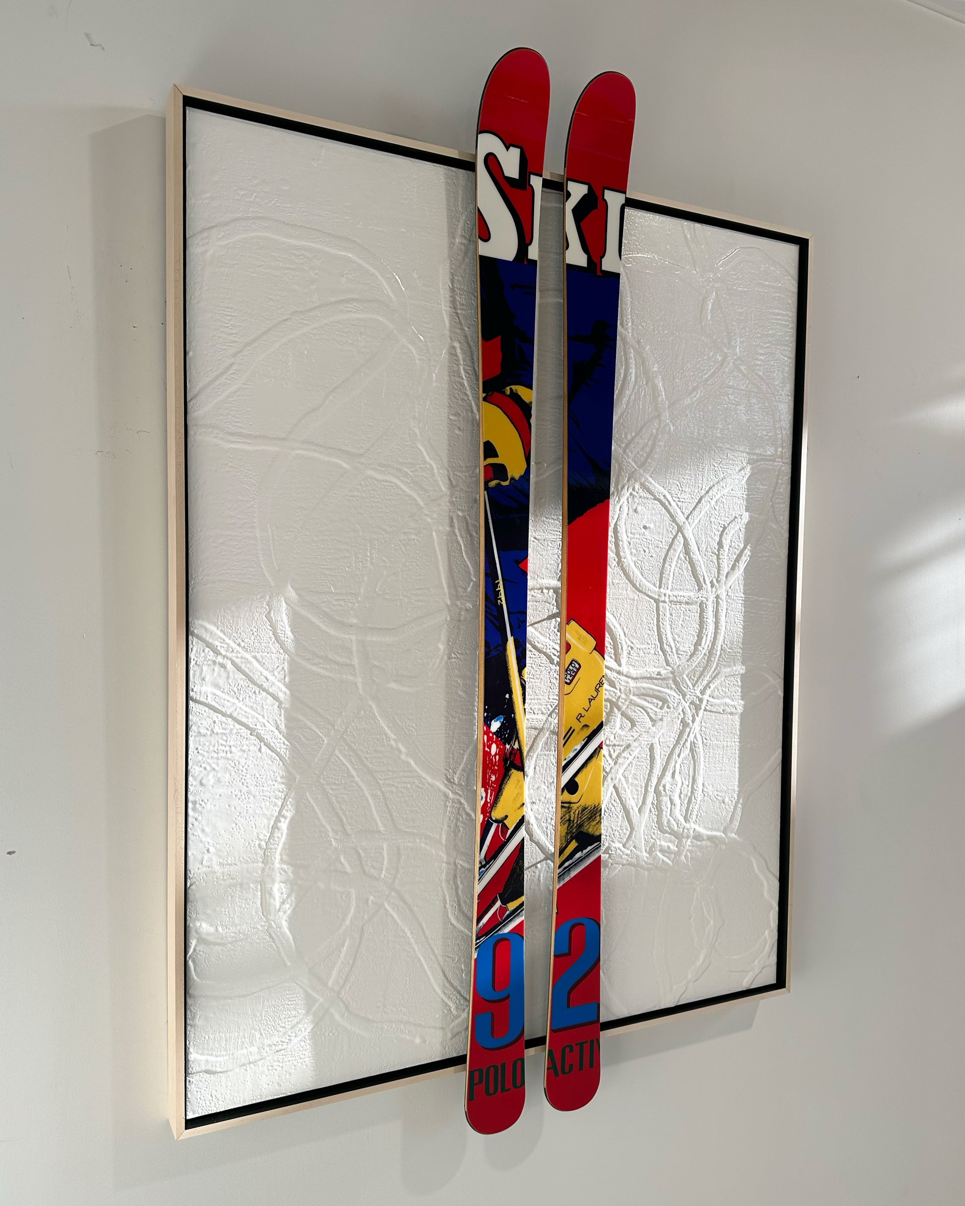 Encaustic and Ralph Lauren skis float-mounted on board.