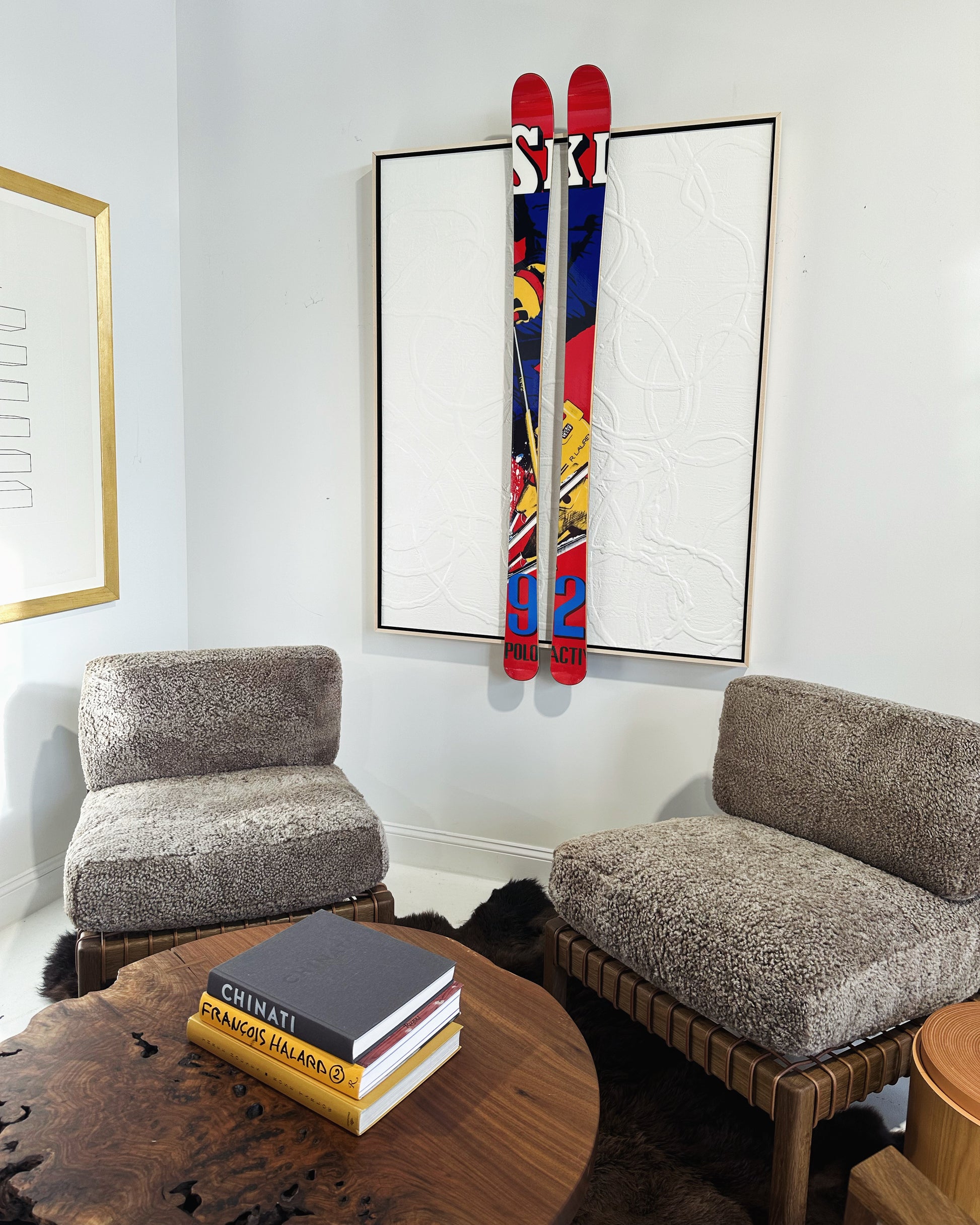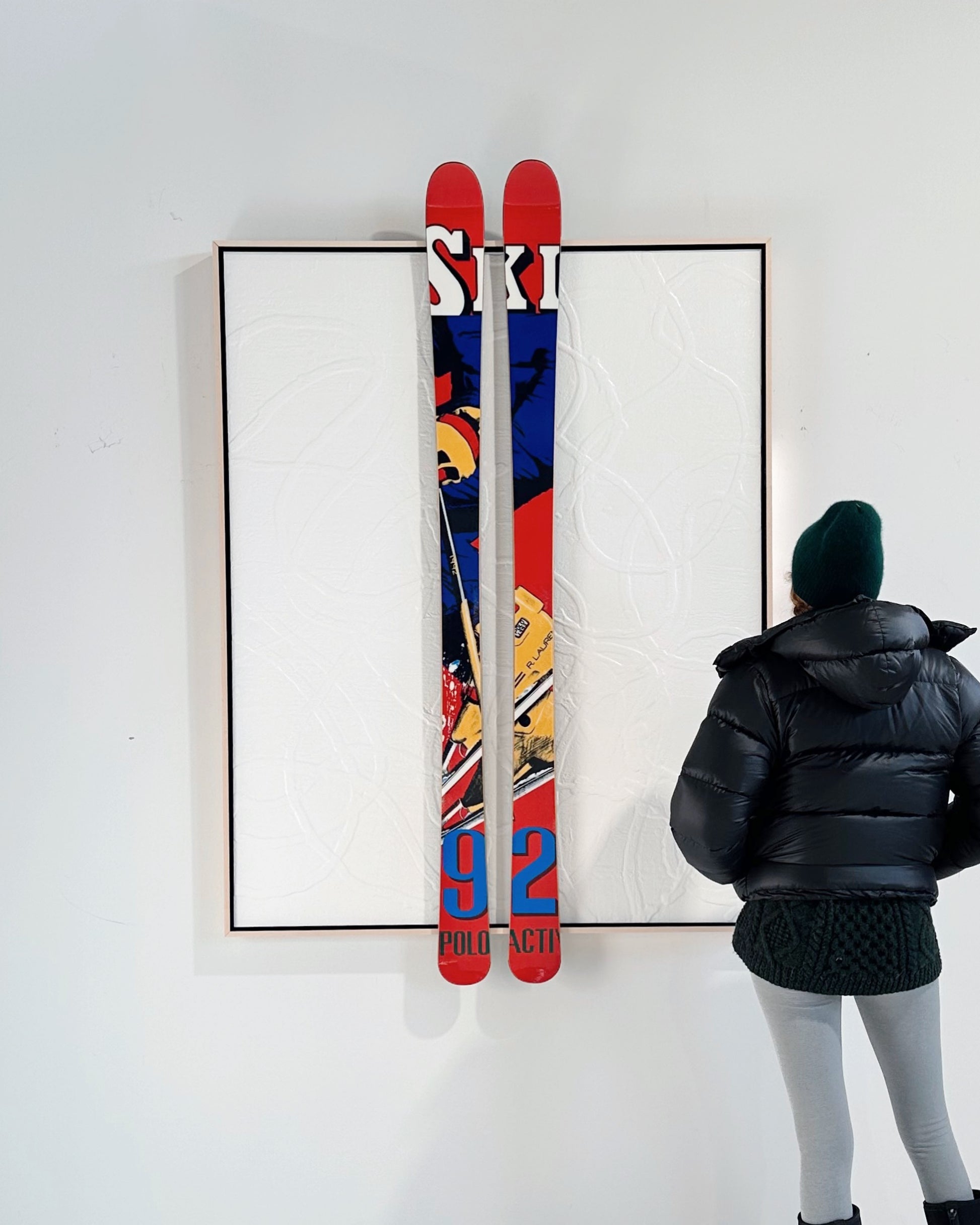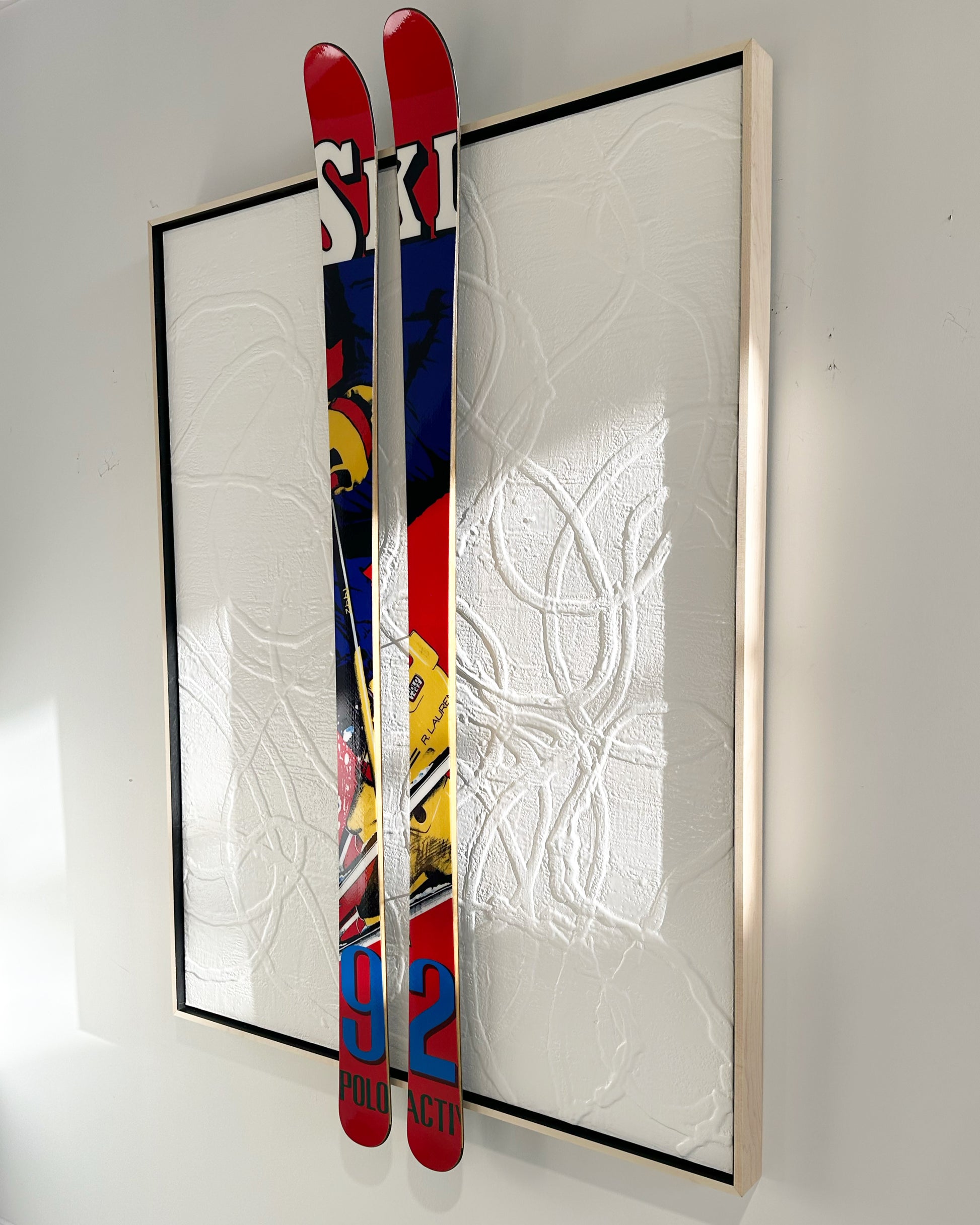 Encaustic and Ralph Lauren skis float-mounted on board.