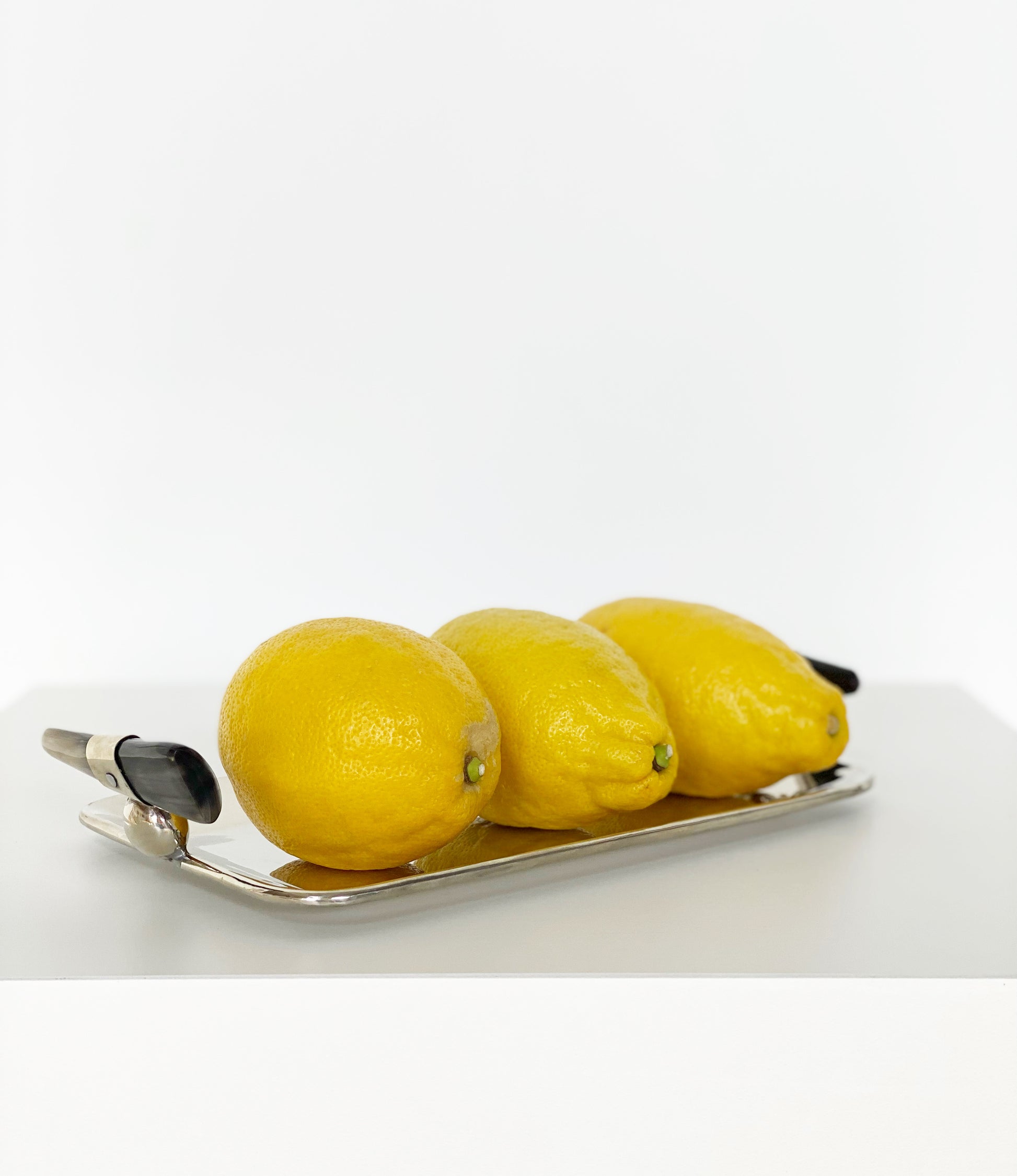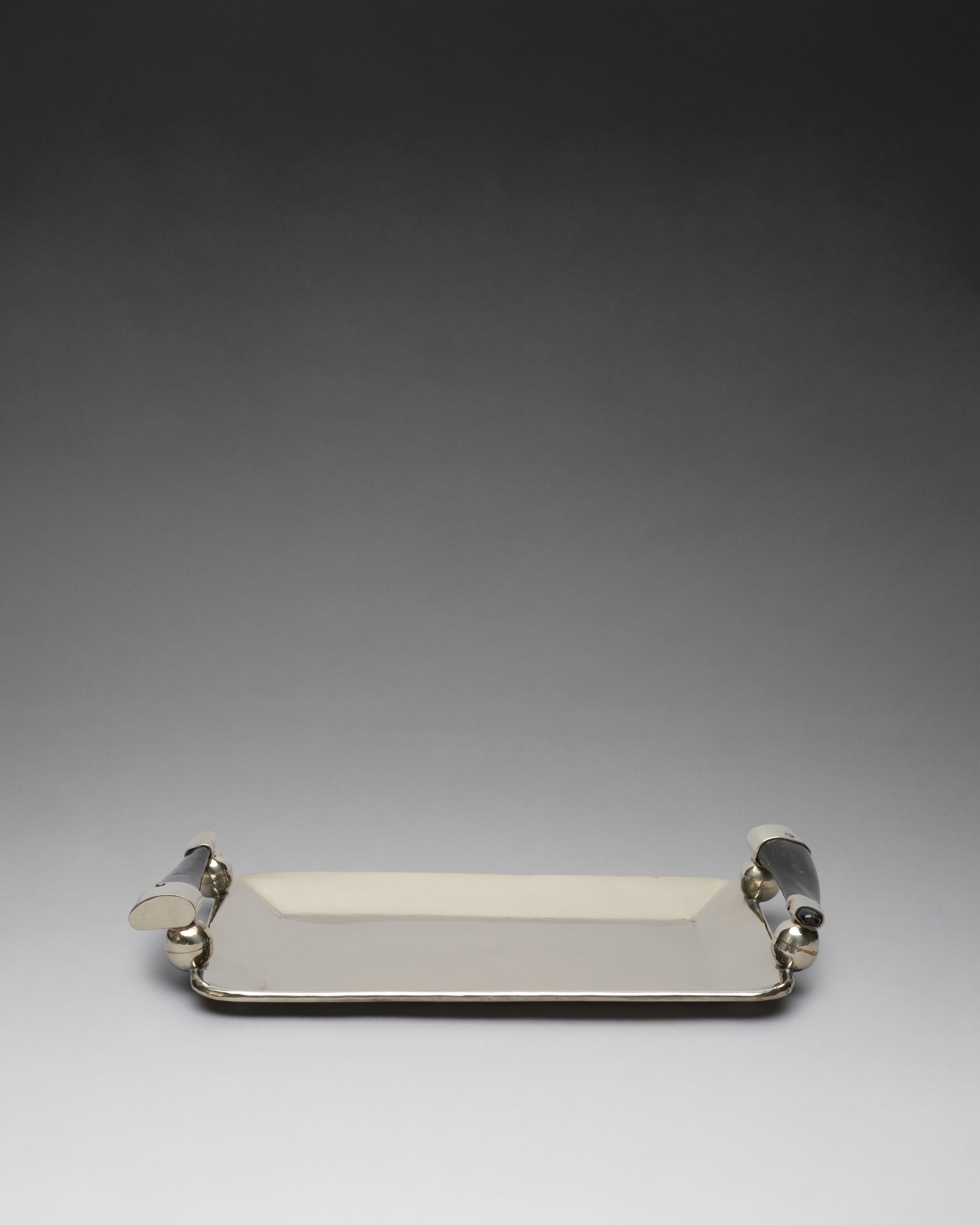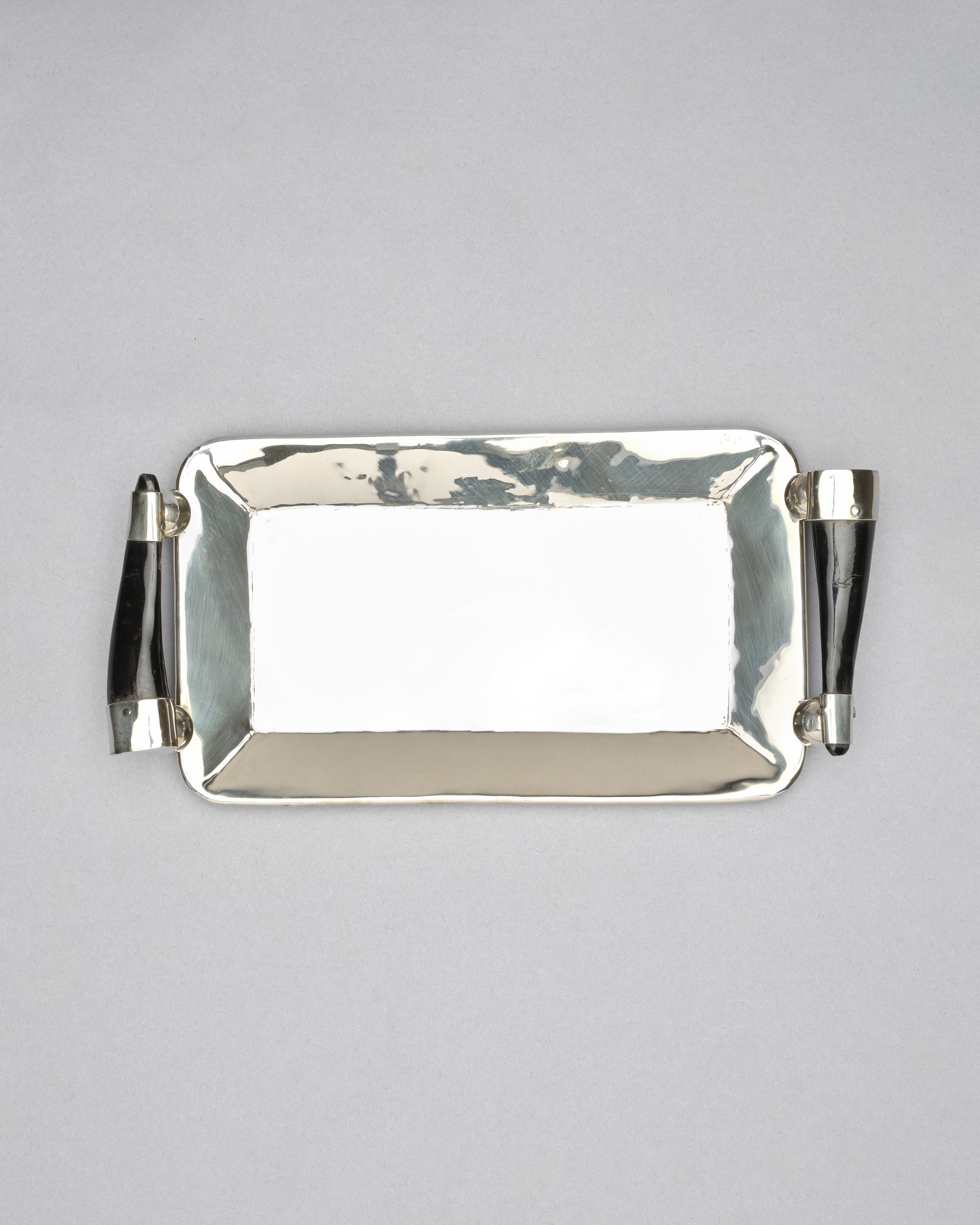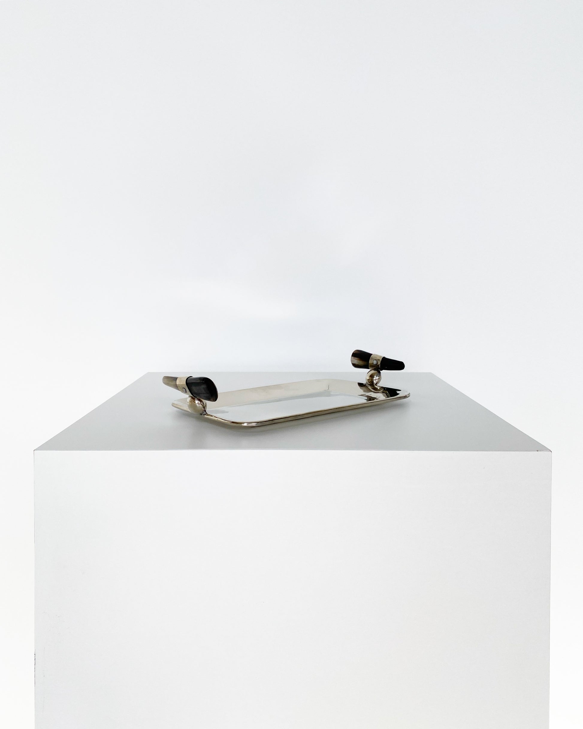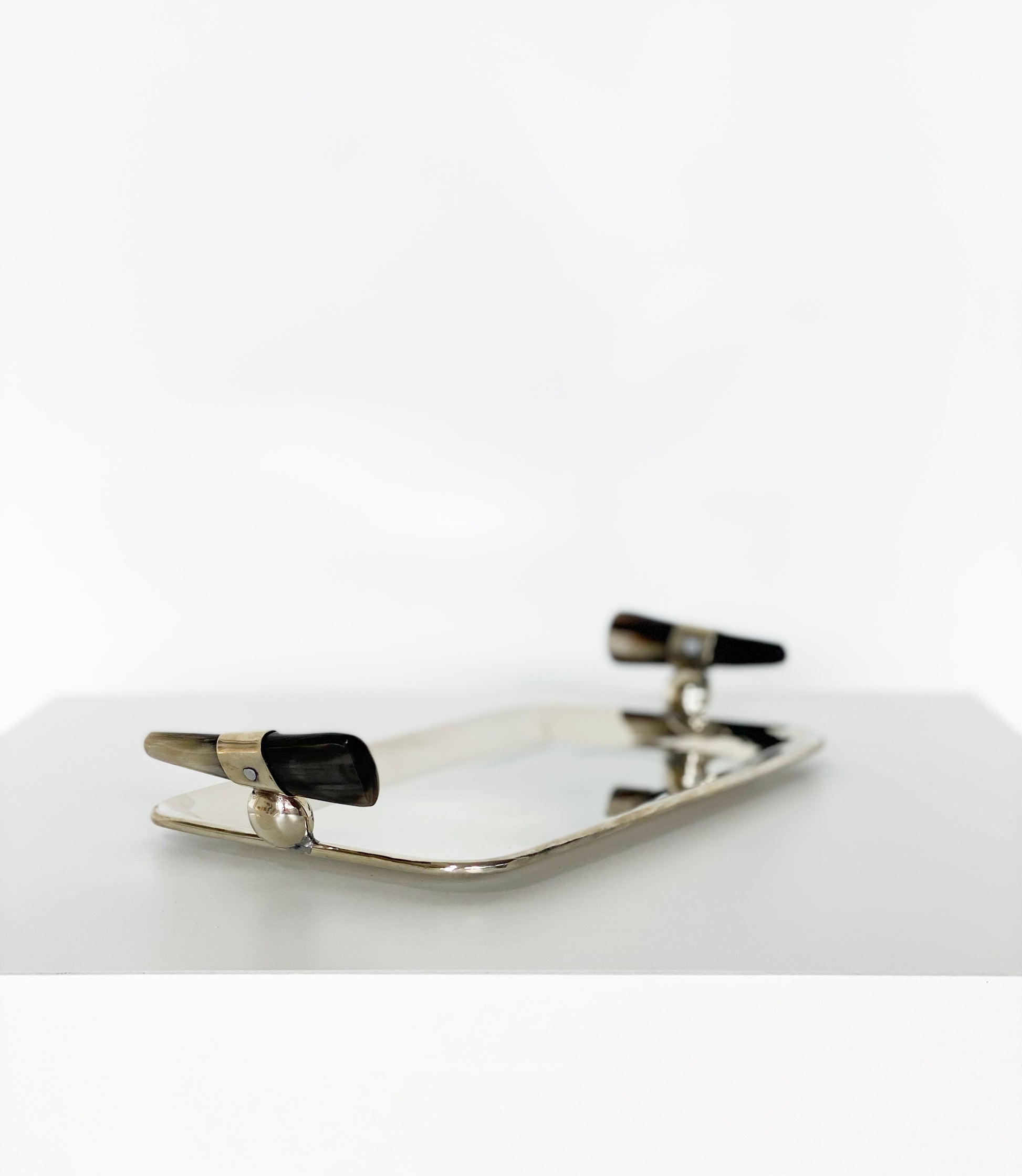 We love the shine of this tray. And the addition of the dark colored horn handles is so chic. Made in Argentina.