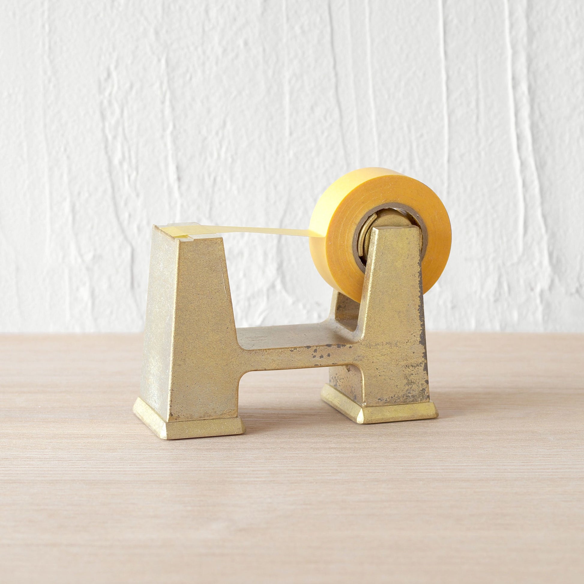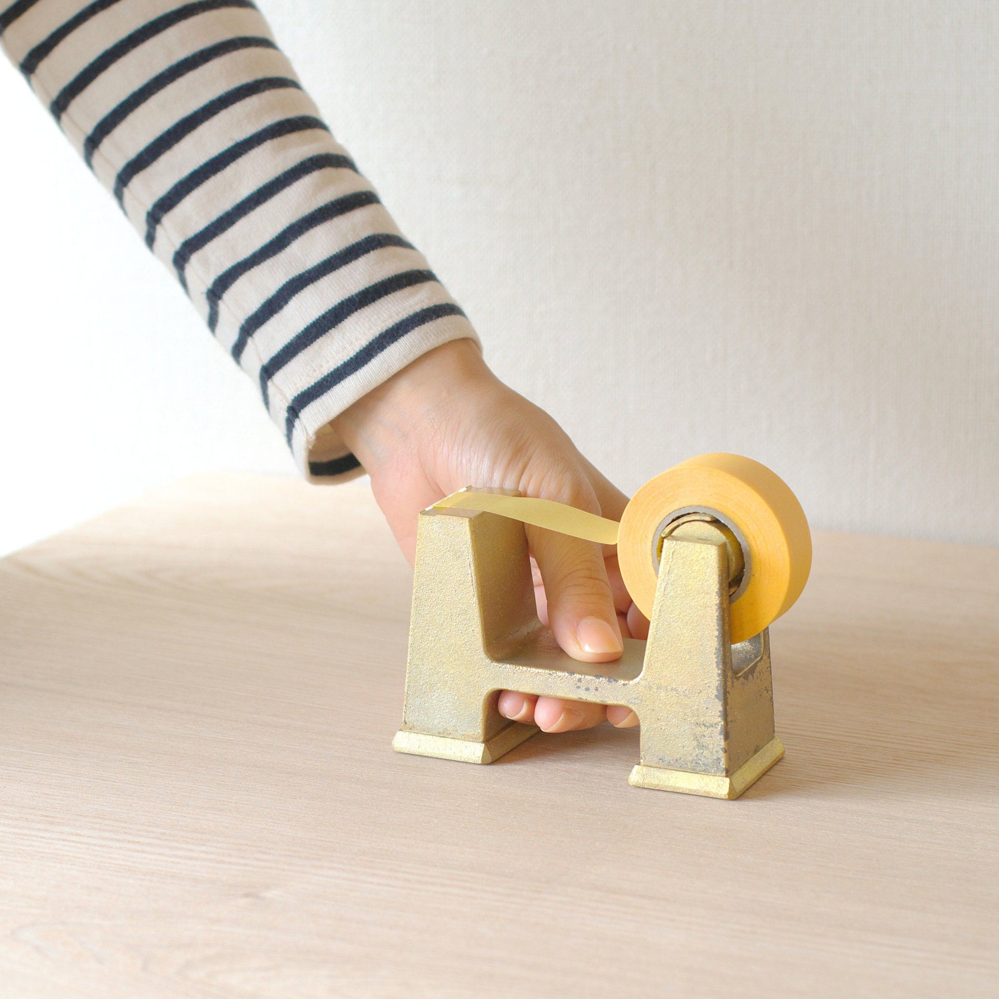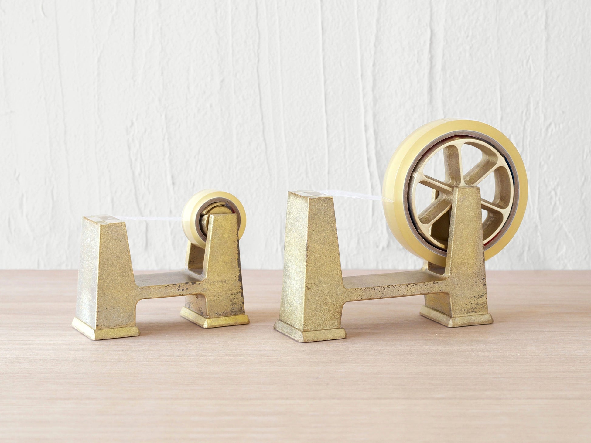 Office chic. Our tape dispensers are made in Japan by a storied brass manufacturer, Futagami. They are Ihada or a type of casting that leaves a crude finish which will gradually patina over time, creating a richer color. The dispensers are heavy but stable. The space under the bar bridging the two pillars makes it easy for one to insert their hand to carry it around. The blade for cutting the tape and the rotor are also made out of solid brass. Form meets function meets cool.
