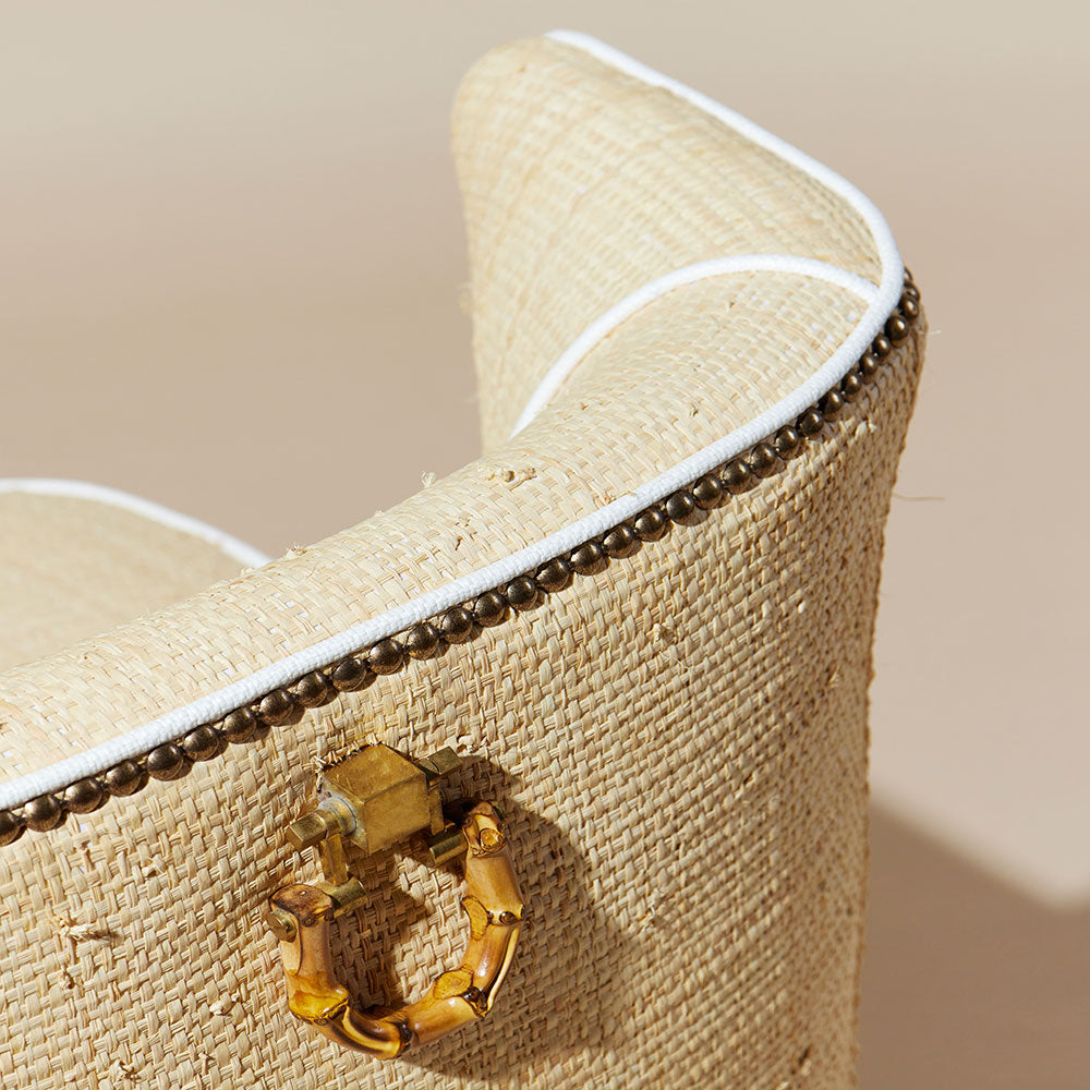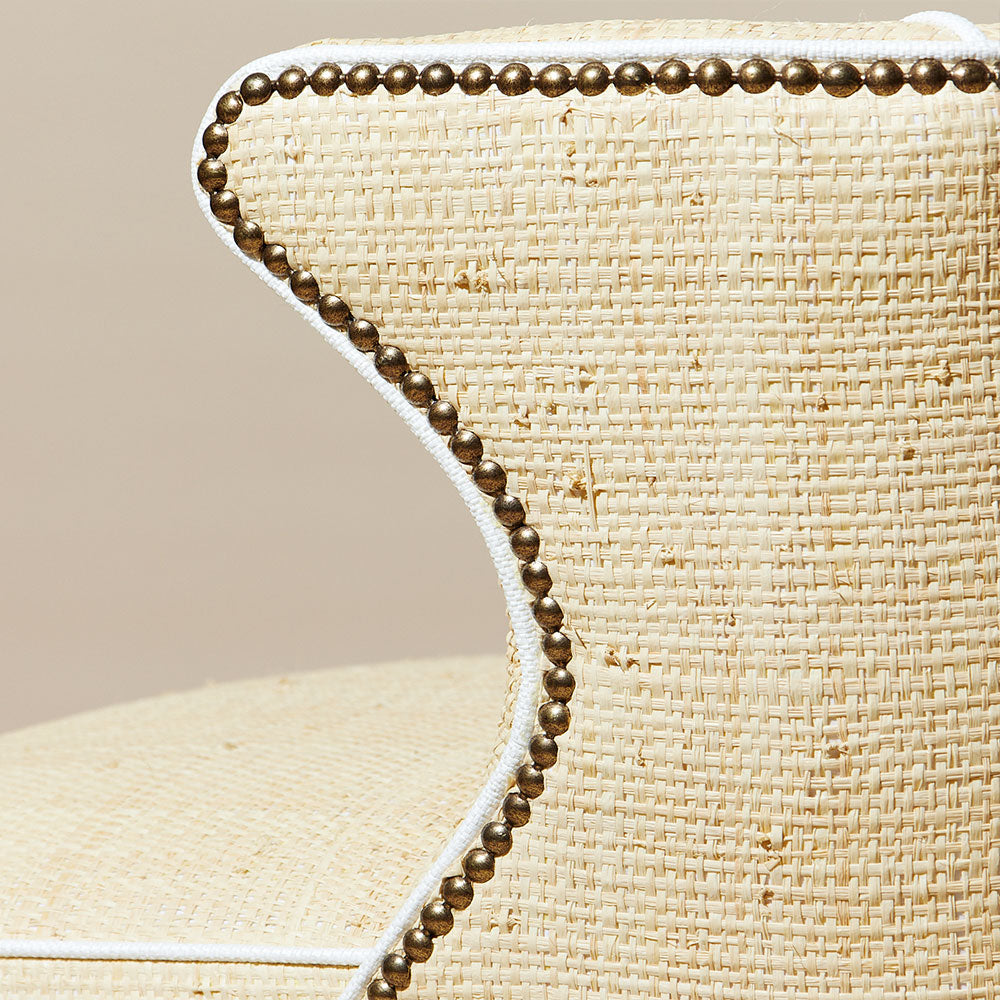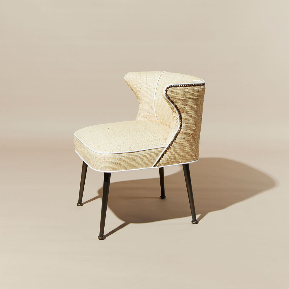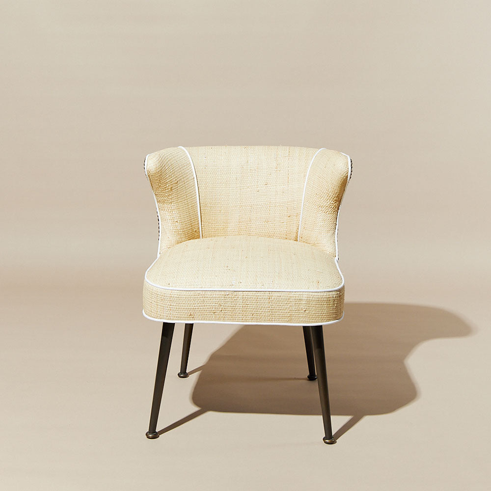 Sole is a padded armchair with raffia upholstery and burnished brass legs. The markedly curved backrest not only gives an attractive appearance but it also brings Sole to be cozy and comfortable. The wrap-around movement makes the presence of the armrests unnecessary.
