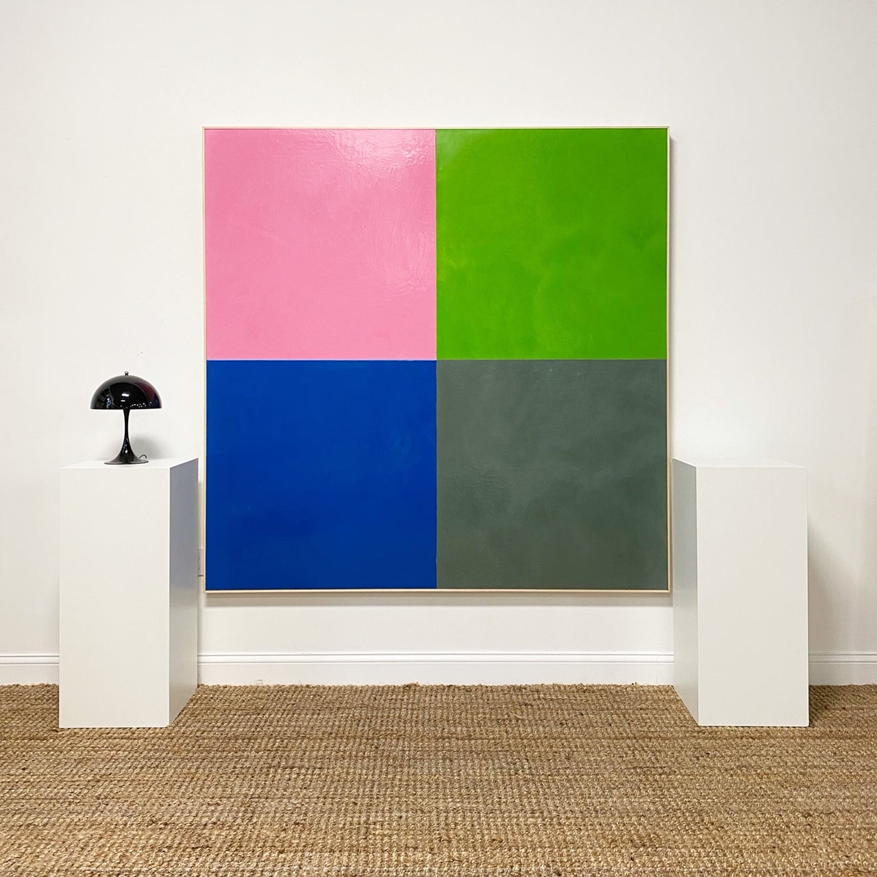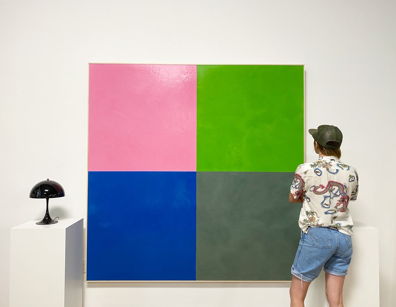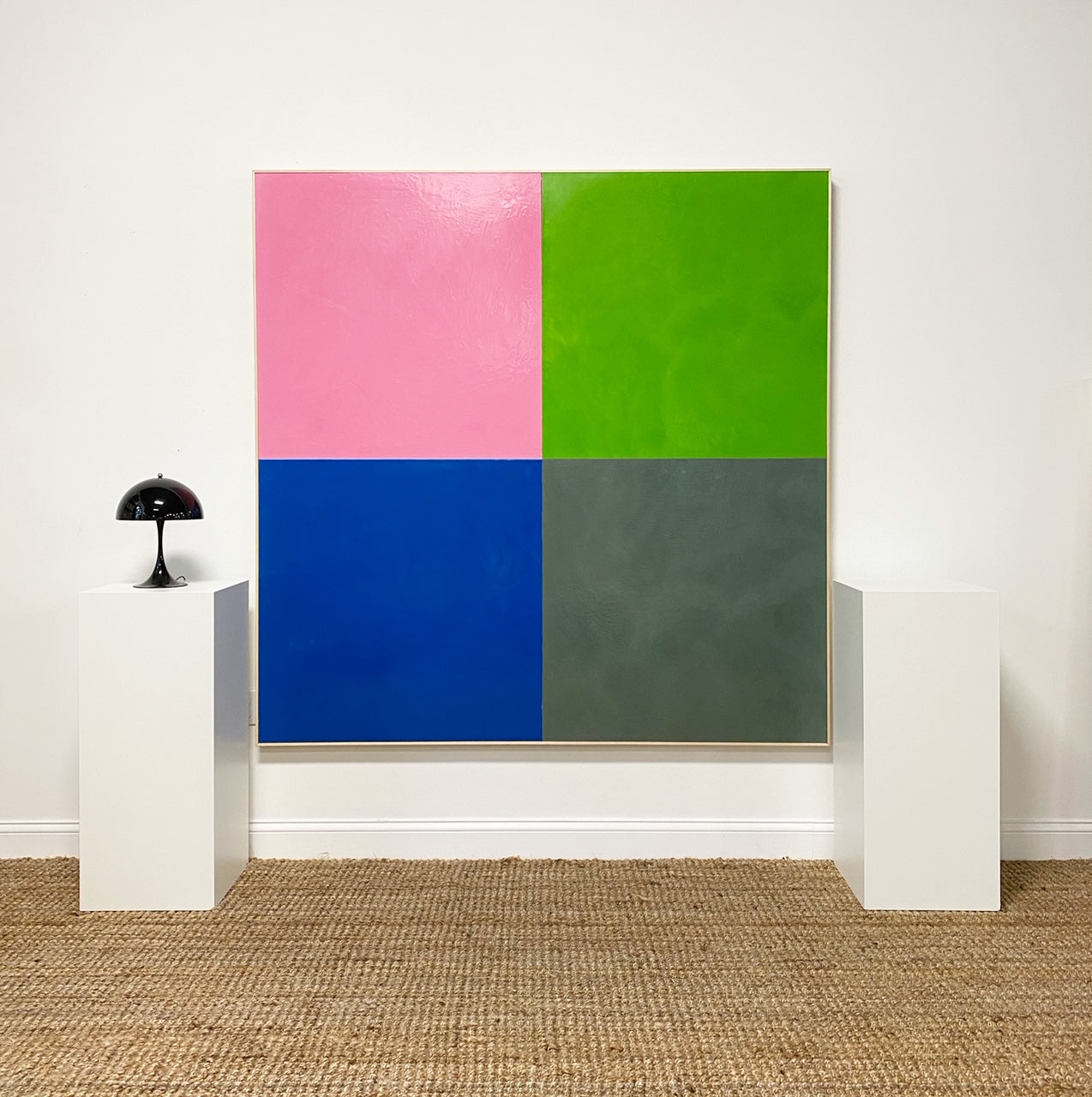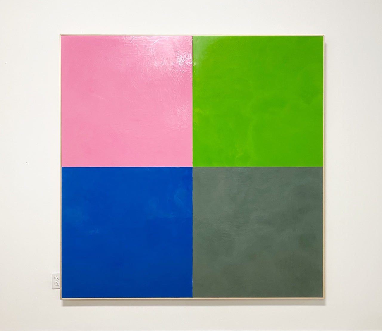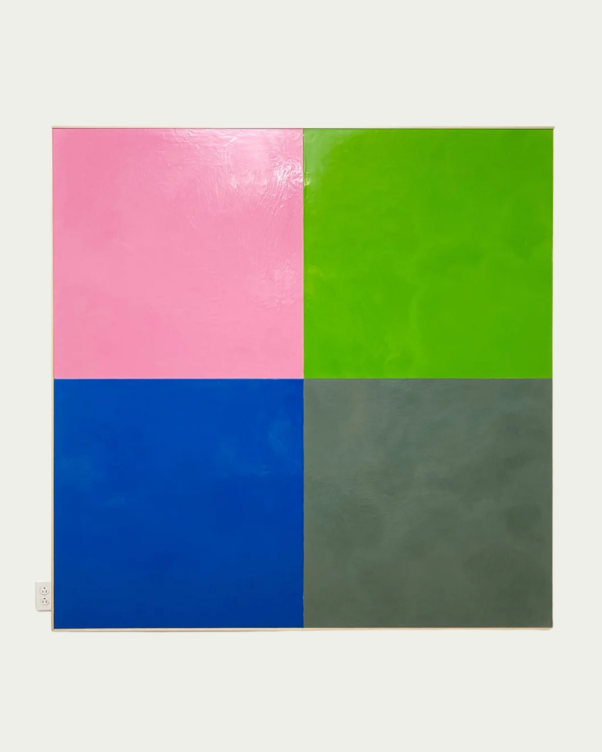 O’Hara creates his Square Dance series by first laying on a ¼ inch of wax onto his specially made boards. O’Hara heats the wax with a heat gun to cure the paint to the board and smooth the surface into a glassy finish. To achieve the crisp, sharp lines of each square, four boards are each painted their carefully chosen color. Color theory plays an integral part in the series. Differing from Albers, O’Hara chose to position his squares not one on top of another but in a grid. This allows the viewer’s eye to “dance” around the work. O’Hara then positions the colors and bolts each board together to create the larger square. The series is simple, powerful and direct, and above all else, quite enjoyable to look at hanging on a wall.