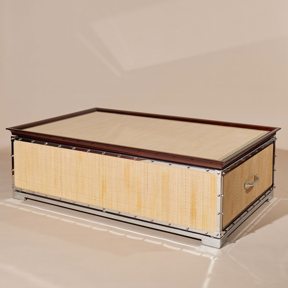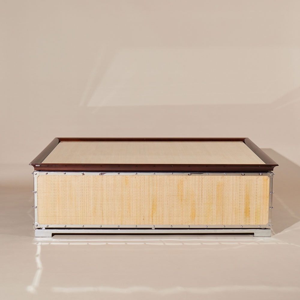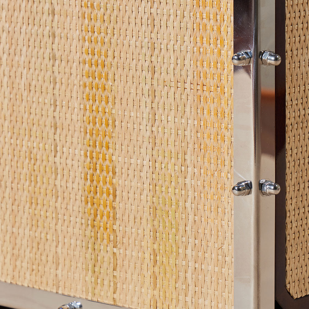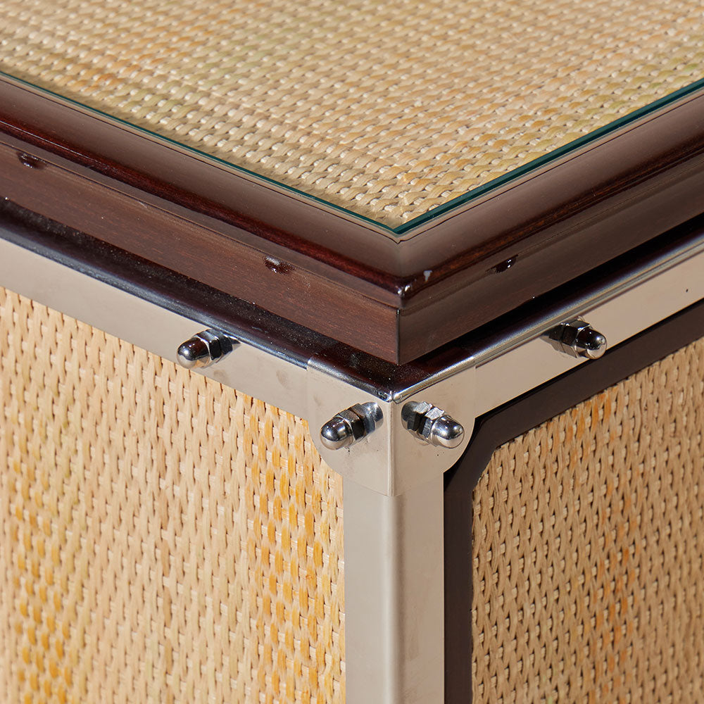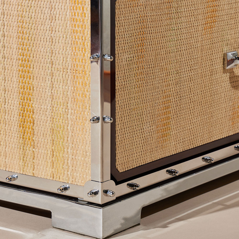 St. Barth is a coffee table that immediately becomes the protagonist of the space and the fulcrum of conviviality. The structure in chrome-plated steel dotted with small studs dialogue with the raffia cladding.