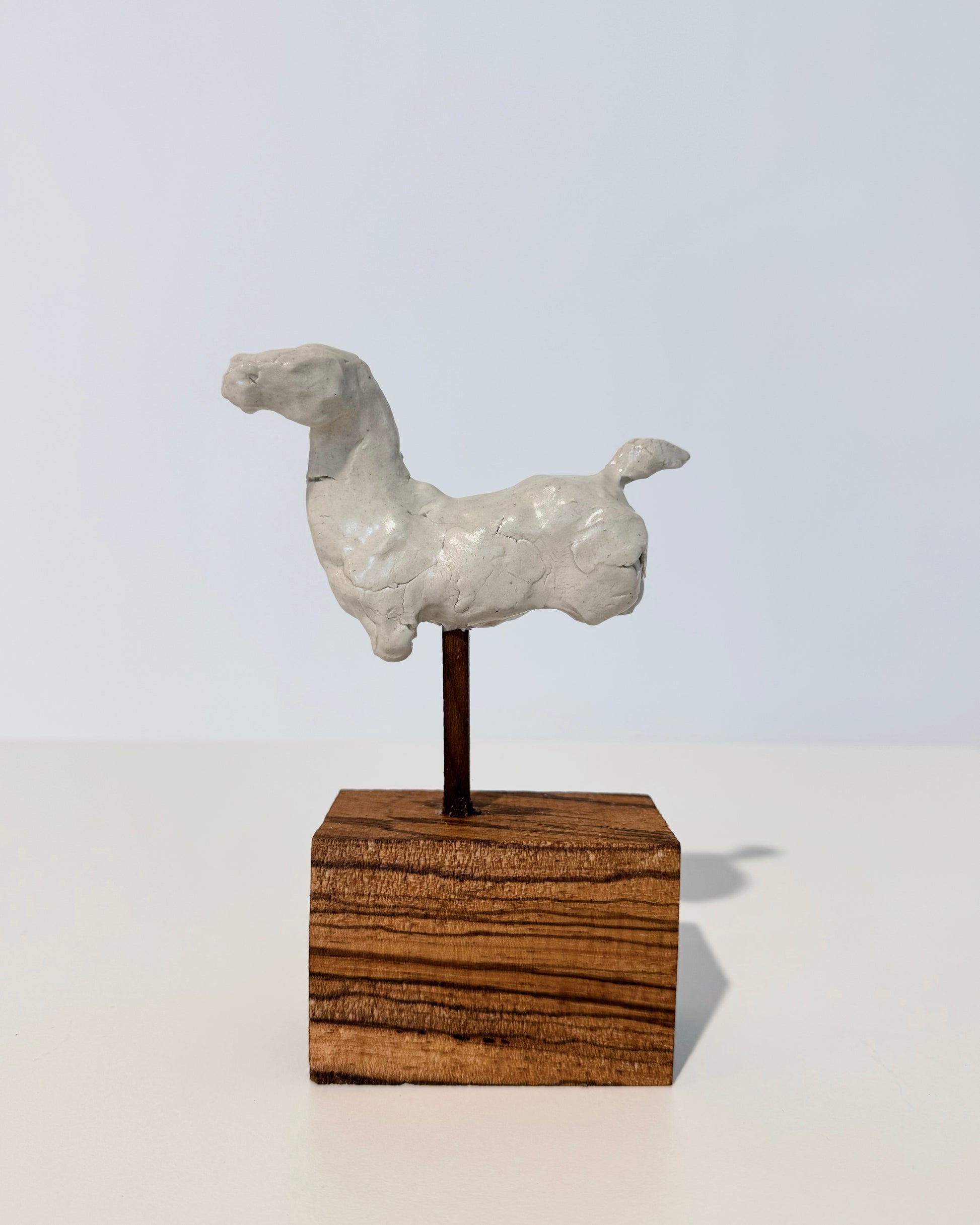 The Talisman sculptures are stoneware ceramic and mounted with various hardwoods. They evoke the inexplicable connection man has always had to the beauty and power of horses and through Maggie's gestural style of sculpture they remind us of the ancient equine artifacts. They almost look as if they were recently excavated.