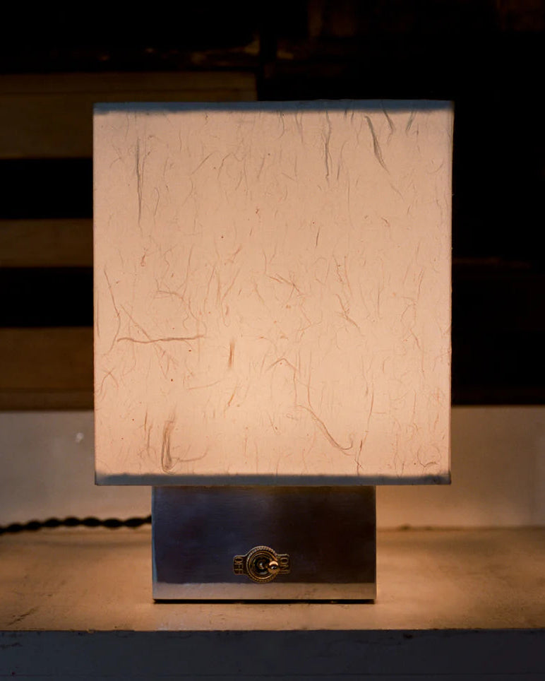 The base is constructed from polished aluminum contrasting an off-white Japanese Mulberry Paper Shade complete with an aluminum top, each lamp may be customized with fabric covered twist cording, available in a range of colors.