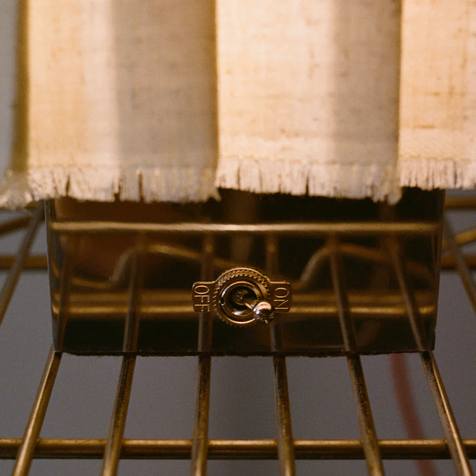 The base is constructed from polished aluminum contrasting an off-white Box Pleated Linen Shade finished with a stationery aluminum top, each lamp may be customized with fabric covered twist cording, available in a range of colors.