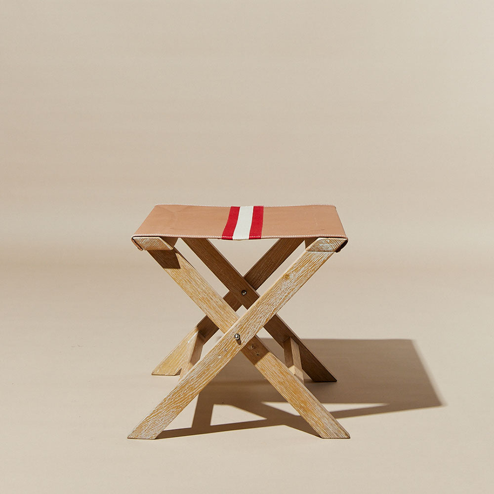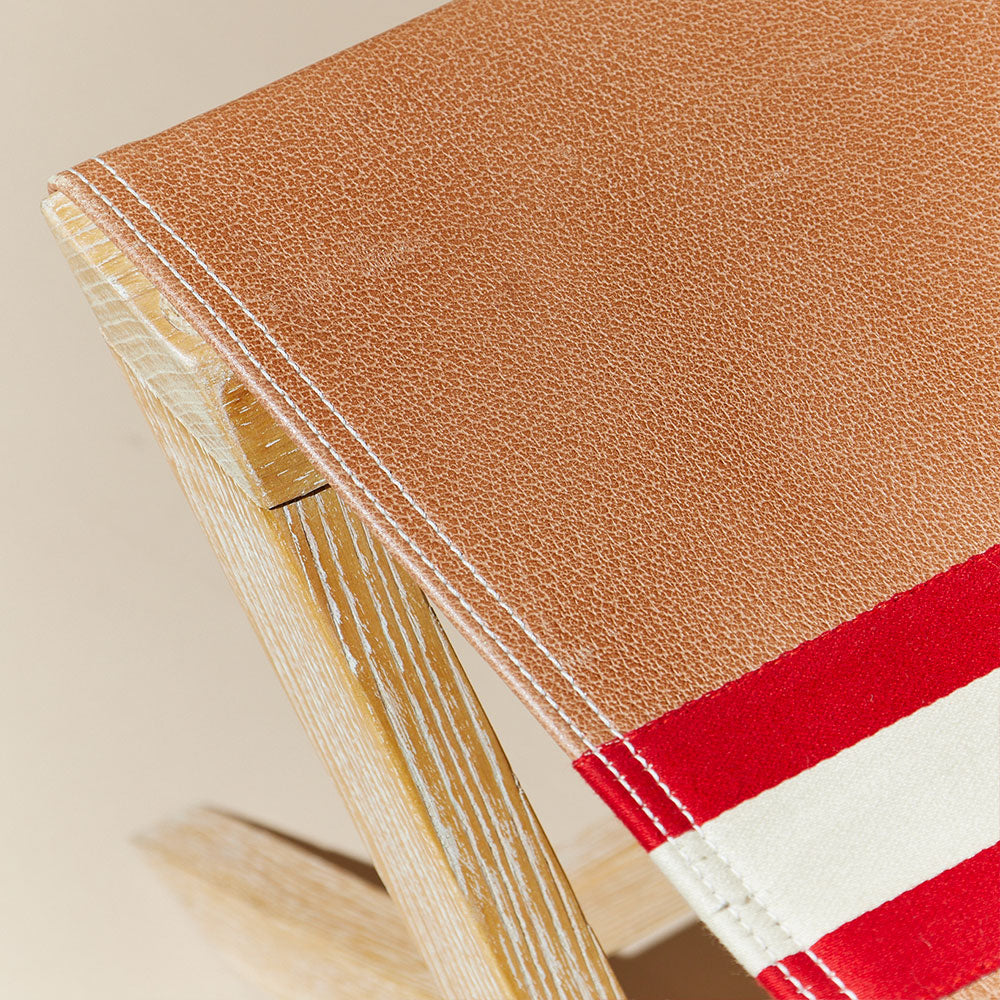 Tabouret is one of the little benches with a western tone. Here, the wood and the leather are well combined in a perfect balance, both in tone and texture. The glossy finish of the wood contrasts with the texture of the leather and the striped pattern.