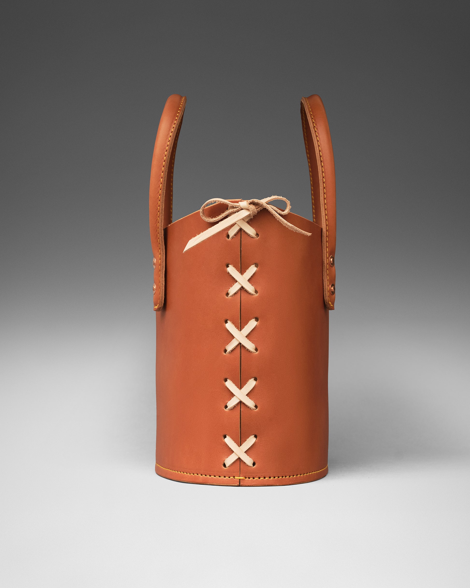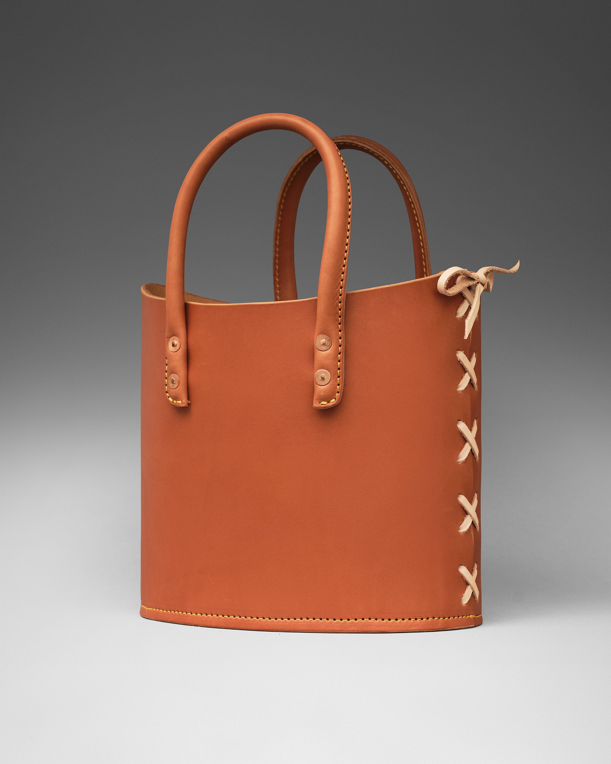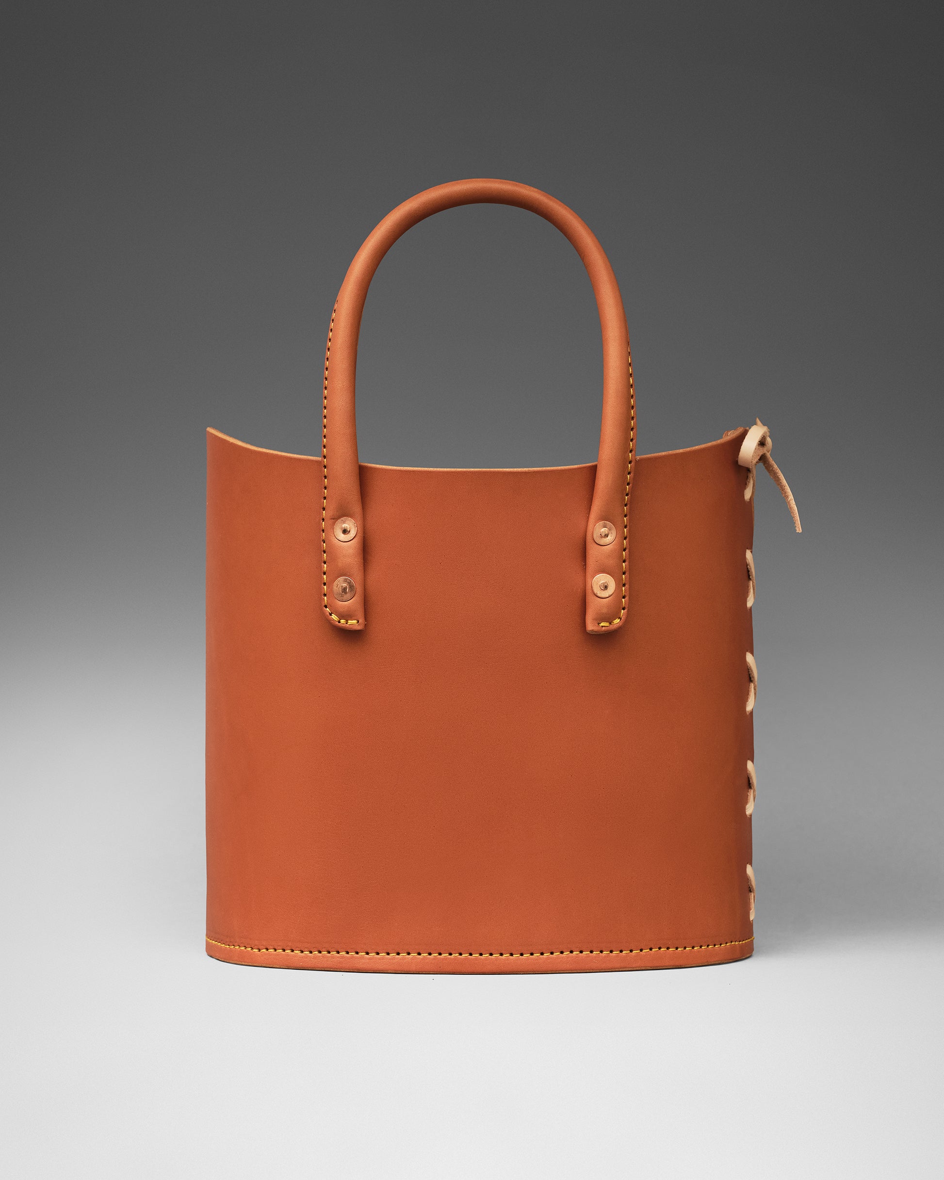 Structured tote bag handcrafted in luxurious bridle leather with tubular solid leather handles, welted constructed base, leather laced side, copper rivets, and open top.