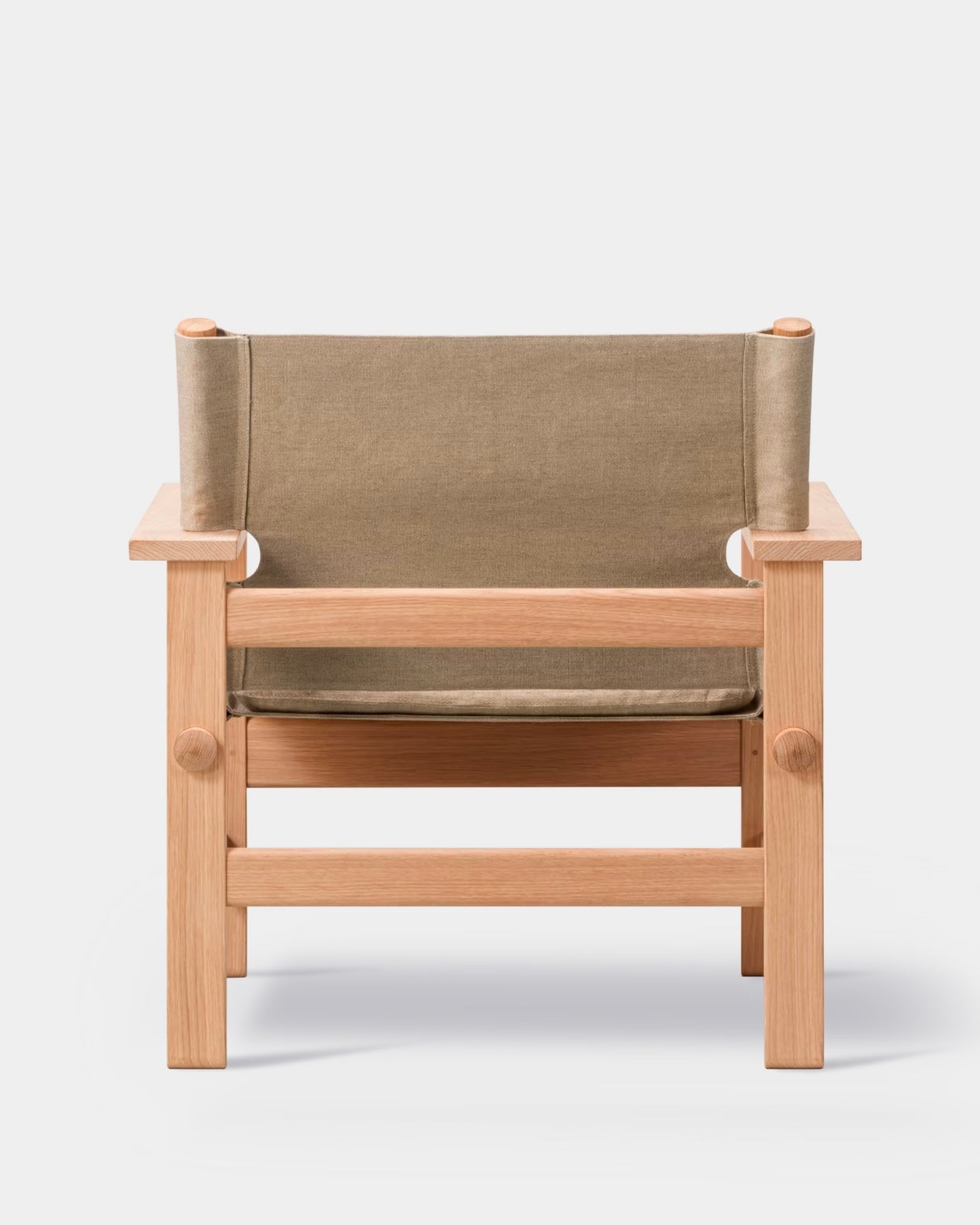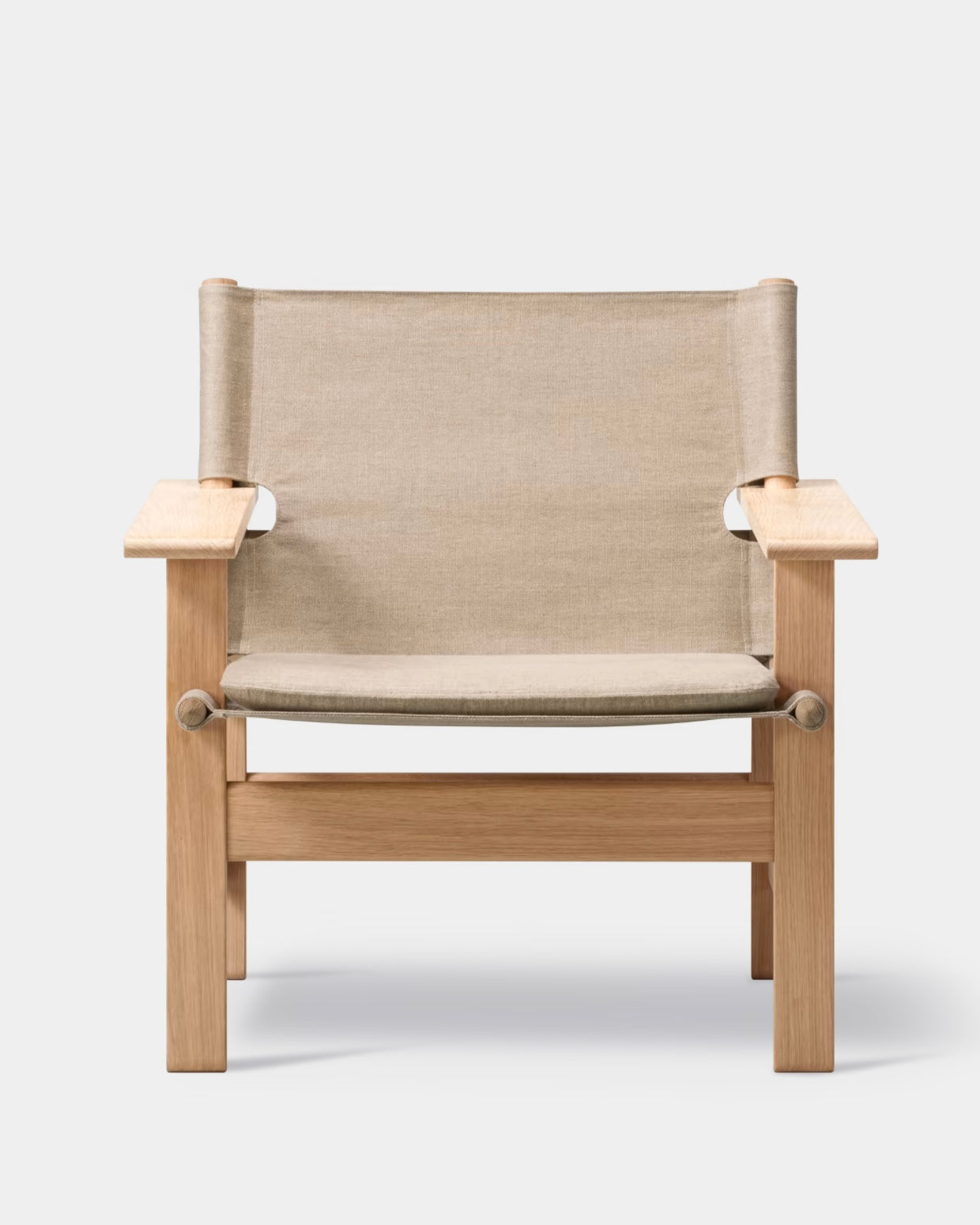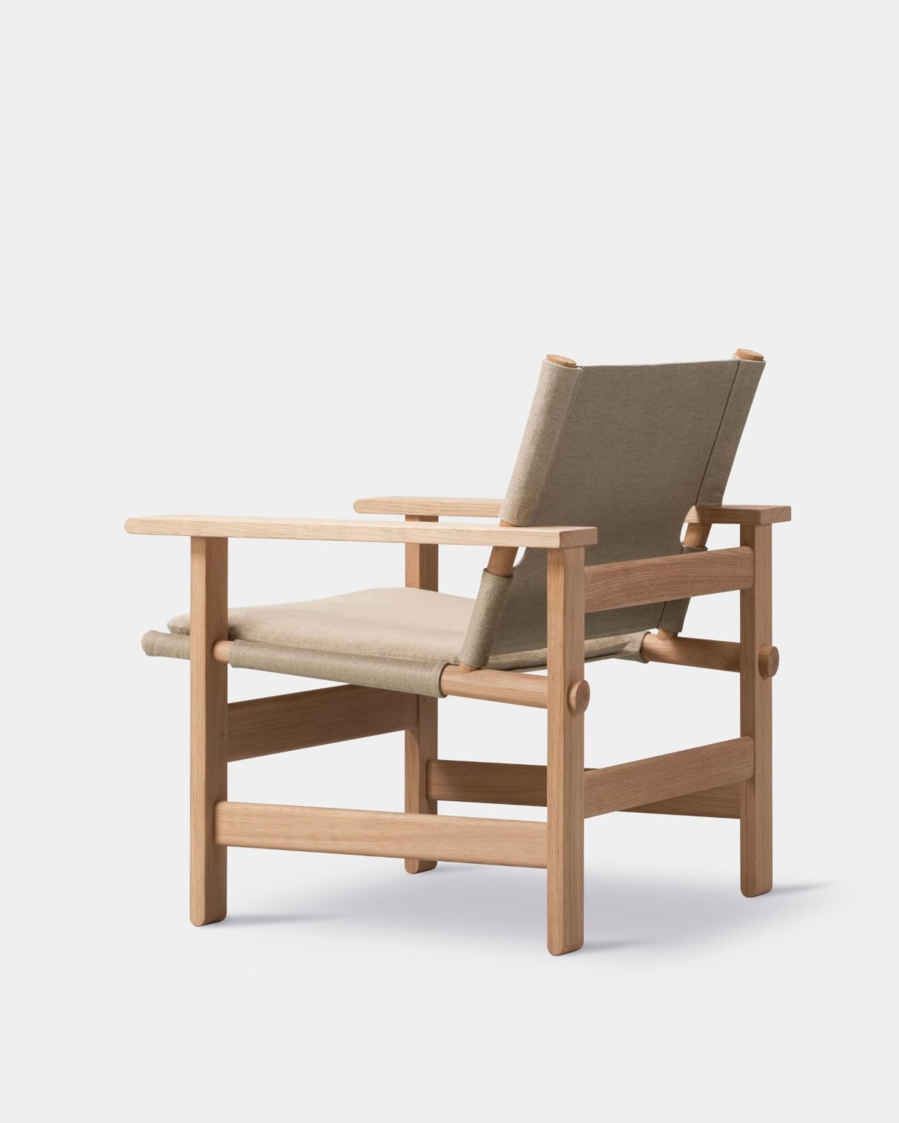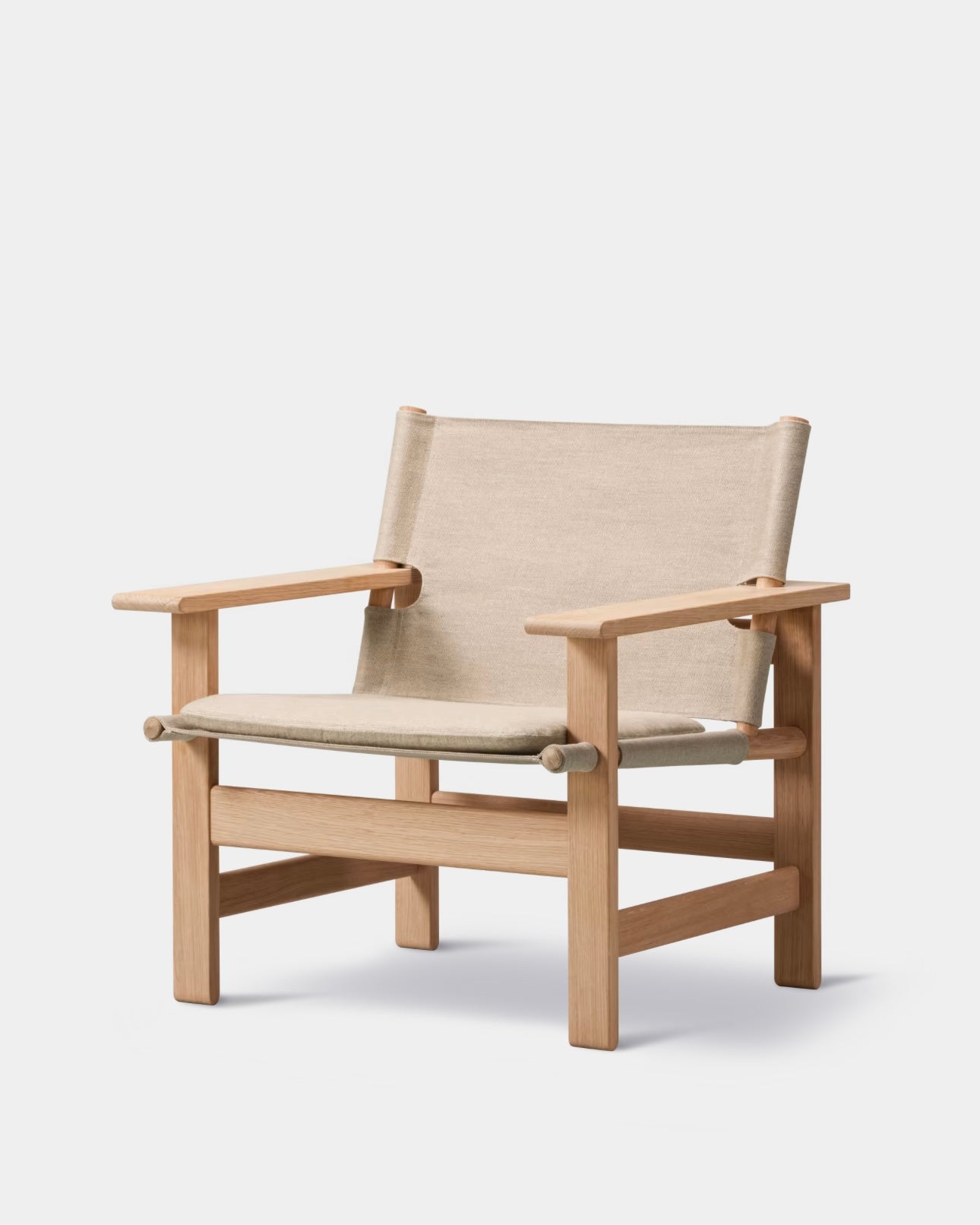 The Canvas Chair is a sustainable design, where material, shape and functionality is calibrated to equilibrium. Designed in 1970 by Børge Mogensen as one of his last pieces before his untimely passing in 1972, it is composed by clearly recognisable materials and shapes. Linen canvas is used for the seat and back suspended between conic pieces of solid oak – as the soft counterpart to an angular, almost constructivist base in solid oak.