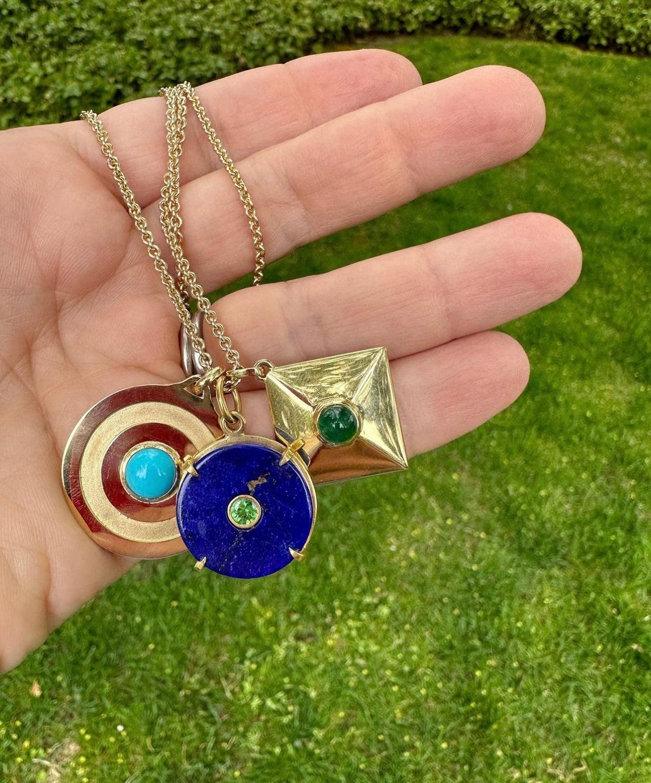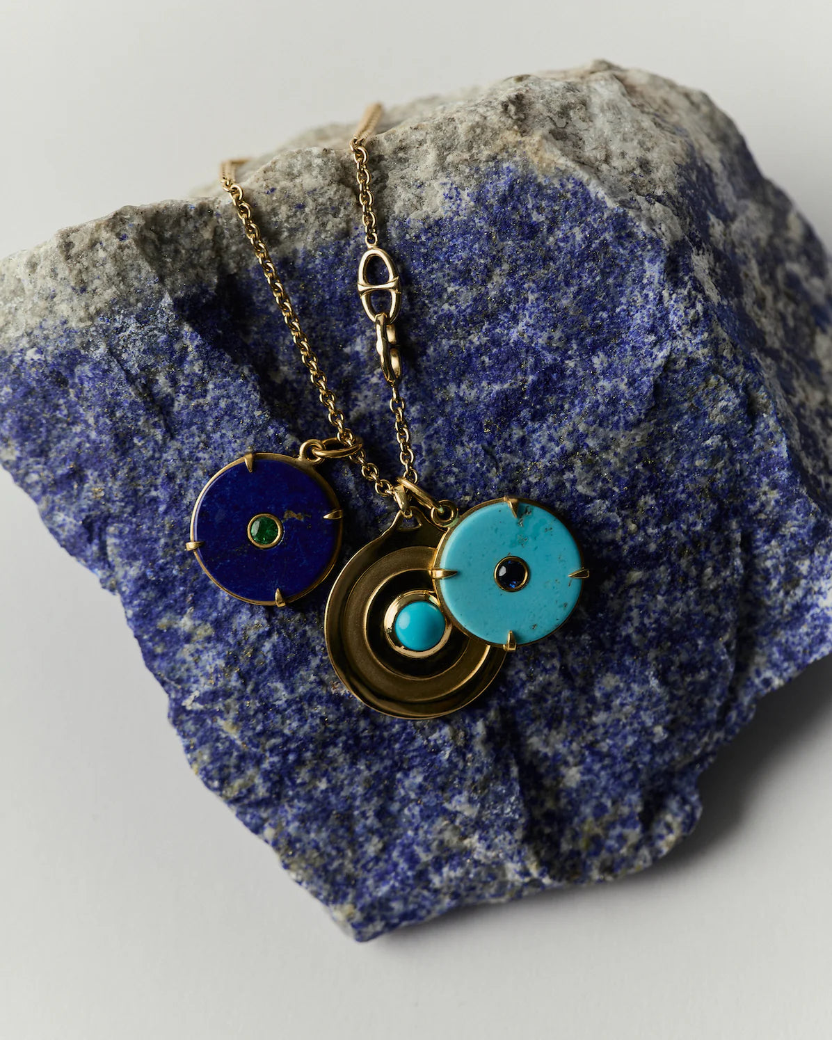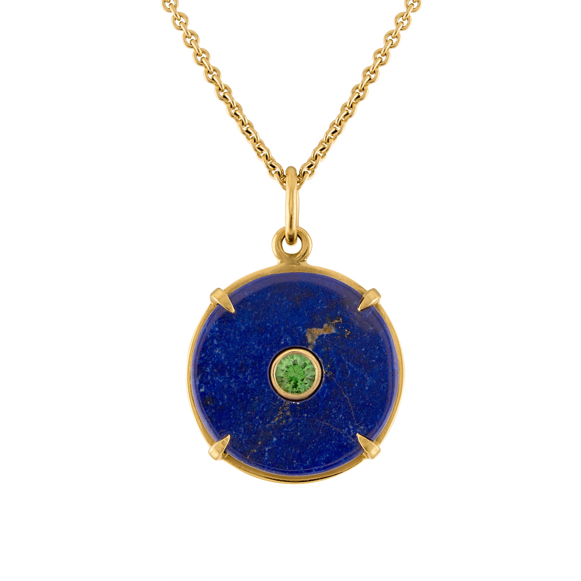 The 18k gold Circle Pendant with Lapis and Tsavorite measures 20mm (approx 3/4") across with a 4mm Tsavorite (approx .25ct) center stone. Pair it with classic and fine cable chains. Sold separately.