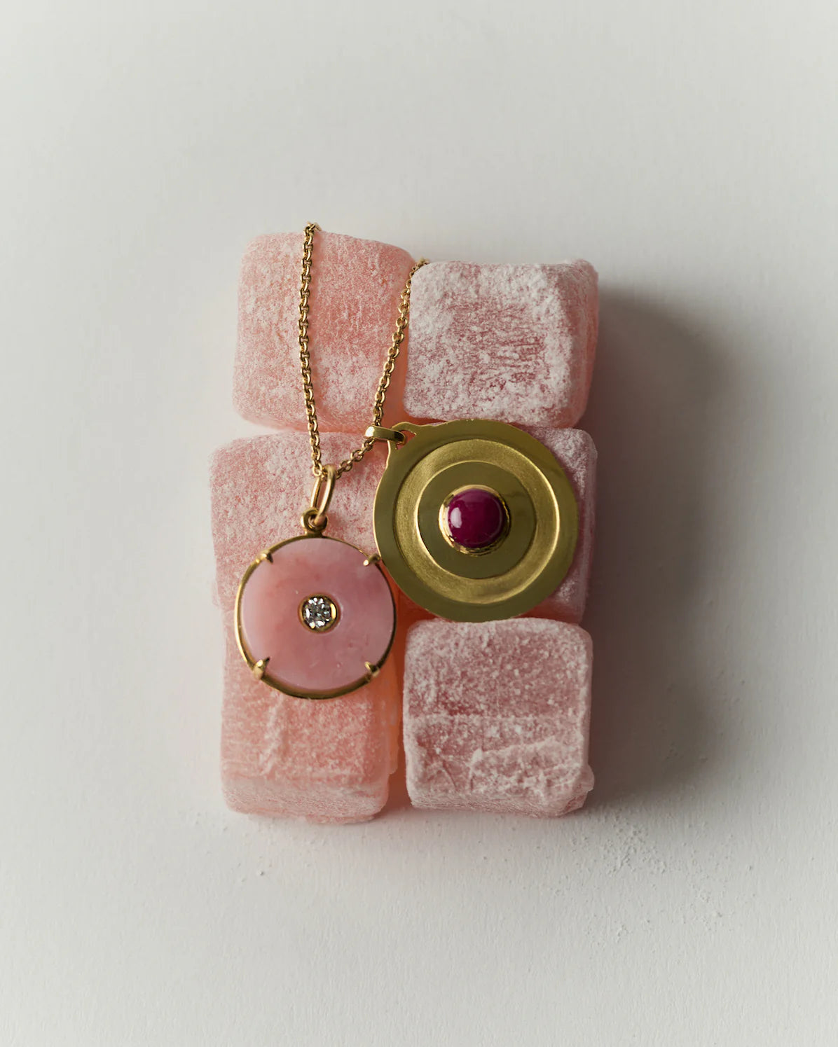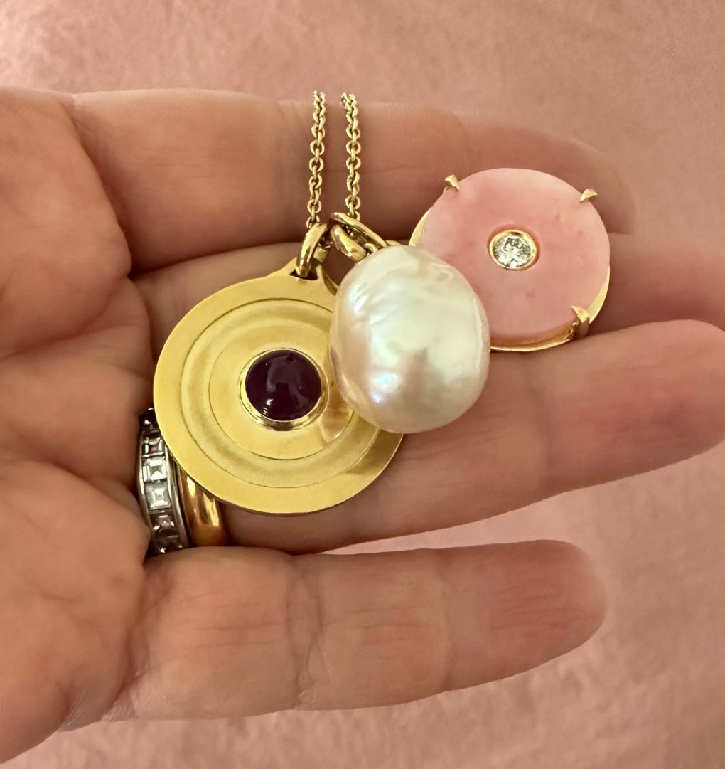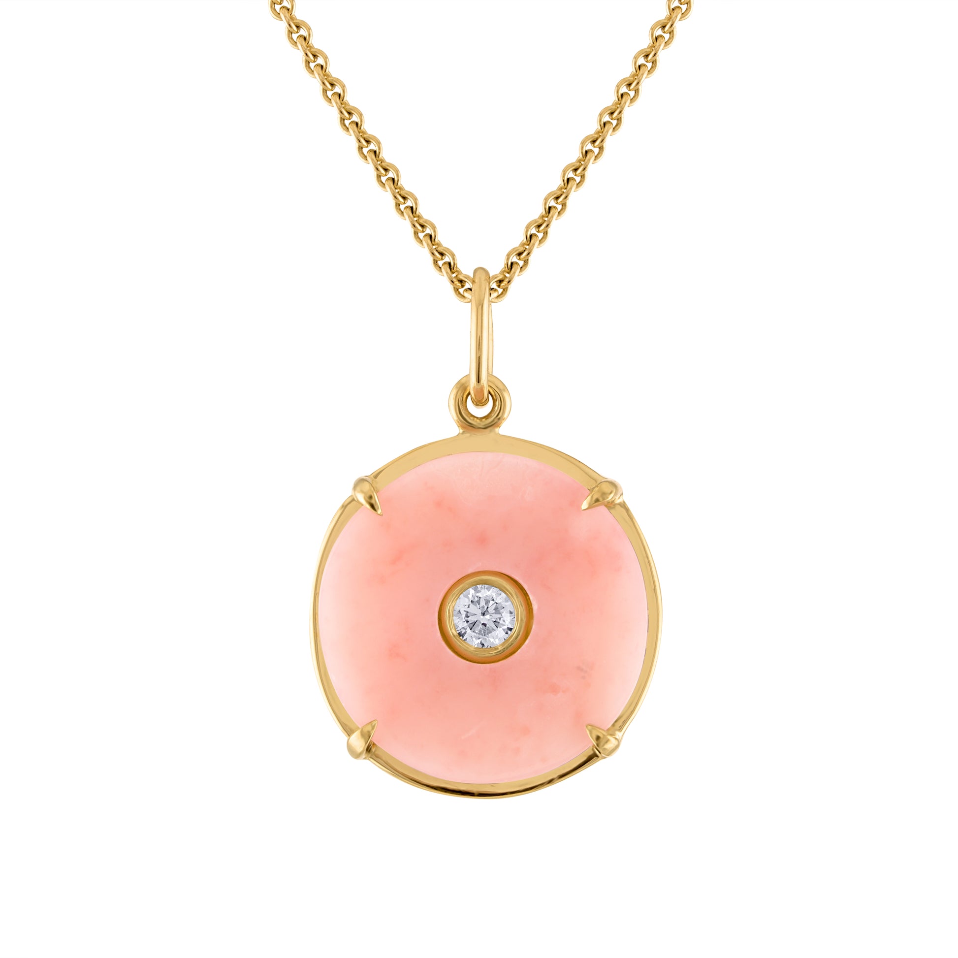 The 18k gold Circle Pendant with Pink Opal and diamond measures 20mm (approx 3/4") across with a 4mm diamond (approx .25ct) center stone. Pair it with classic and fine cable chains. Sold separately.
