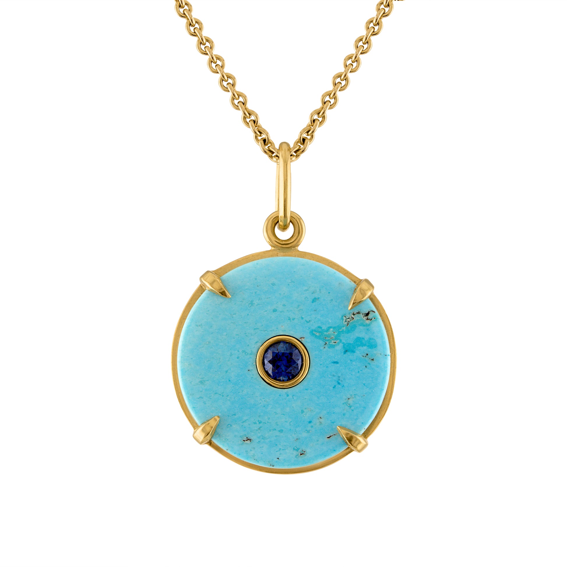 The 18k gold Circle Pendant with natural Turquoise and sapphire measures 20mm (approx 3/4") across with a 4mm sapphire (approx .25ct) center stone. Pair it with classic and fine cable chains. Sold separately.
