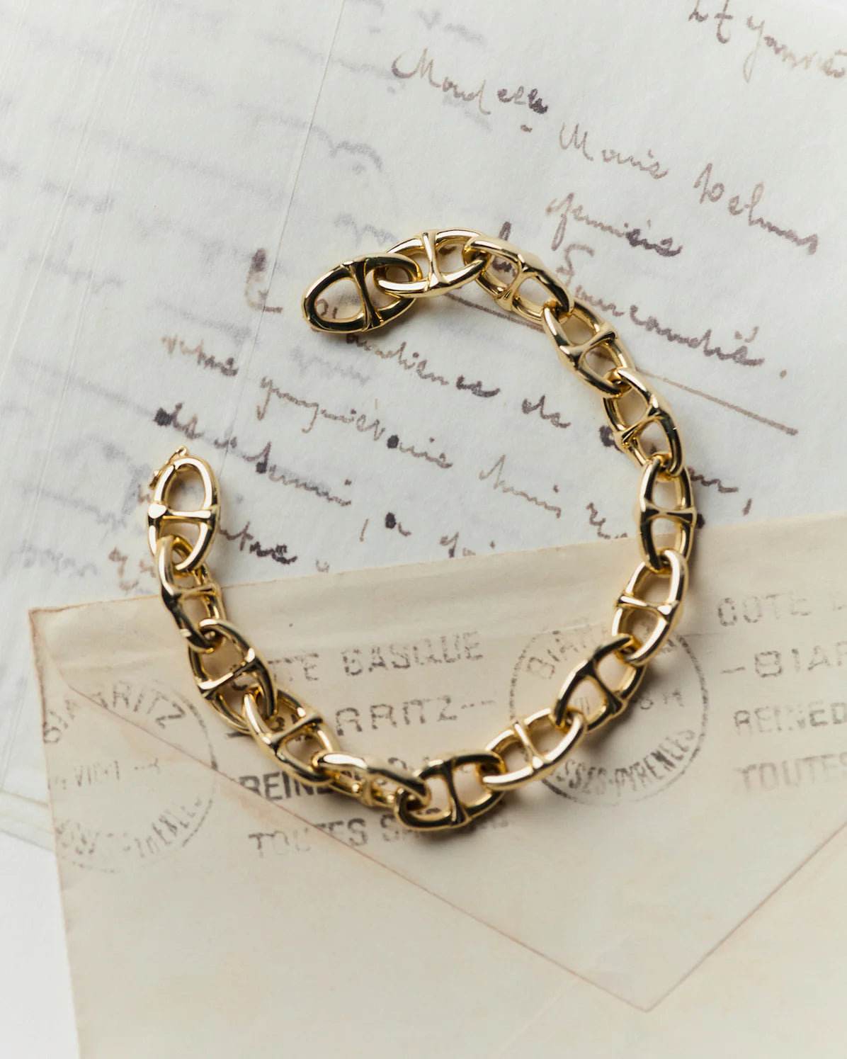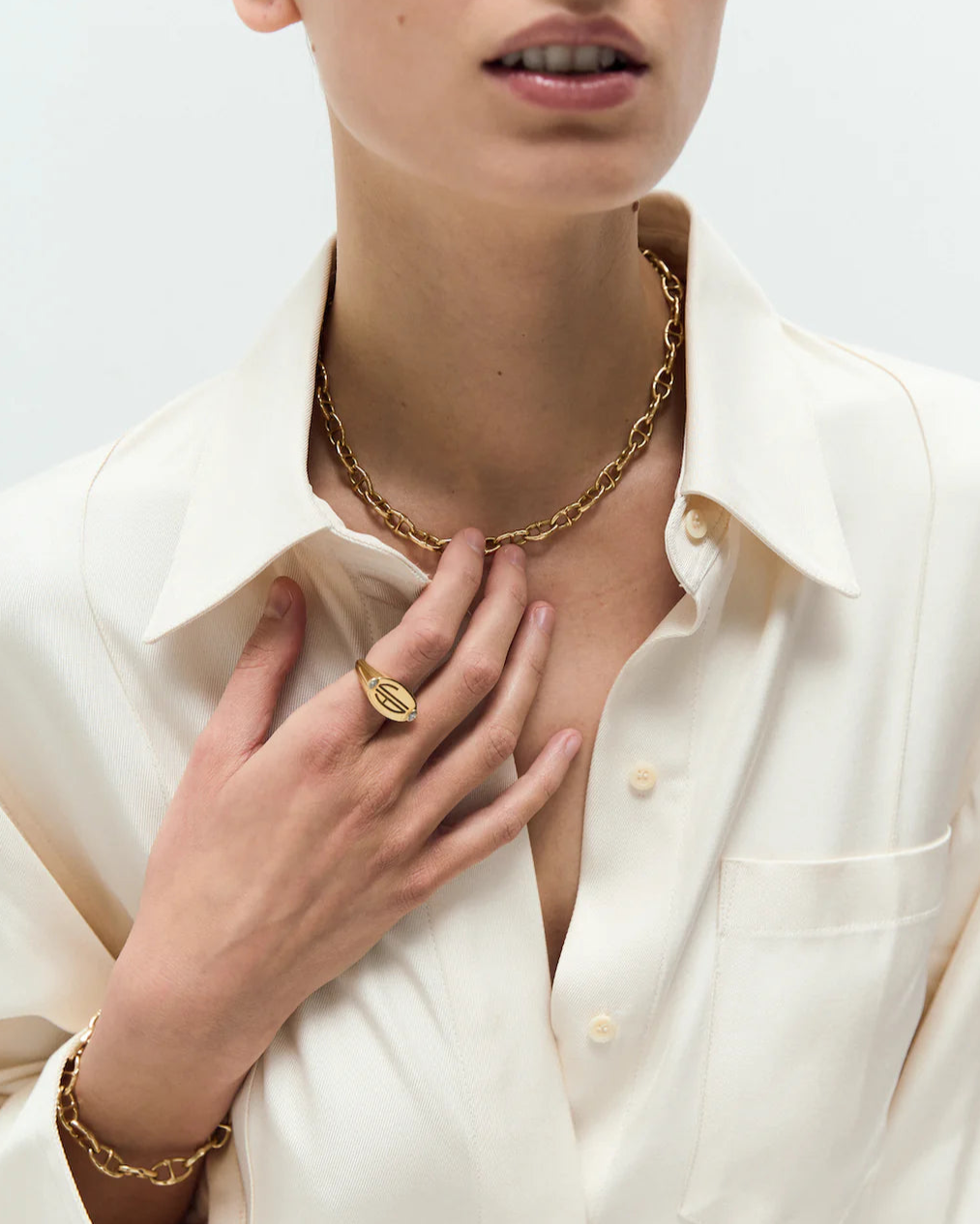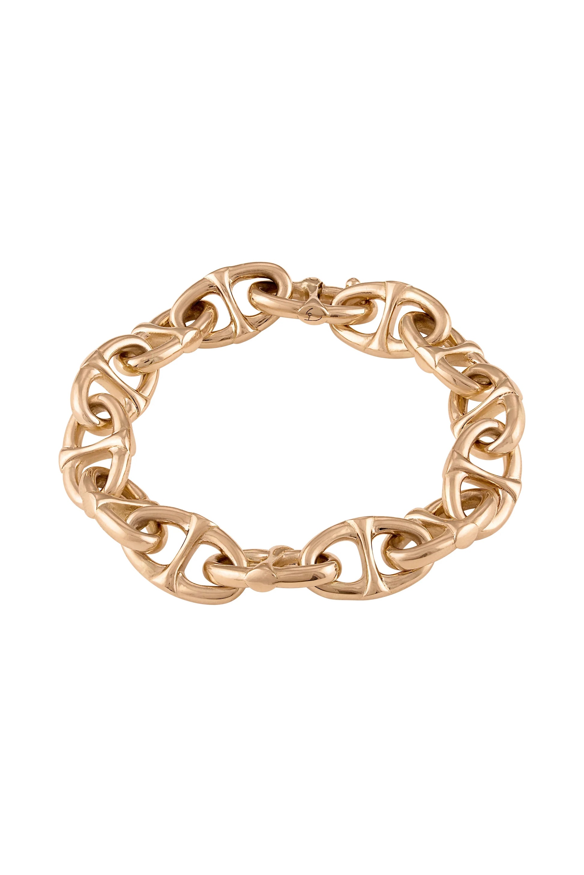 Classic in detail, modern in interpretation, the Mariner Link bracelet is composed of solid 18k gold links, and is available in 3 lengths. The clasp is a large link for a seamless style. Necklaces and bracelets can be put together to create longer and unique silhouettes. Custom lengths are available.
