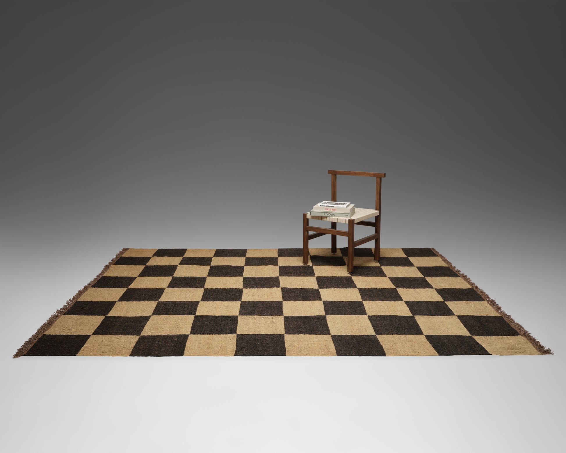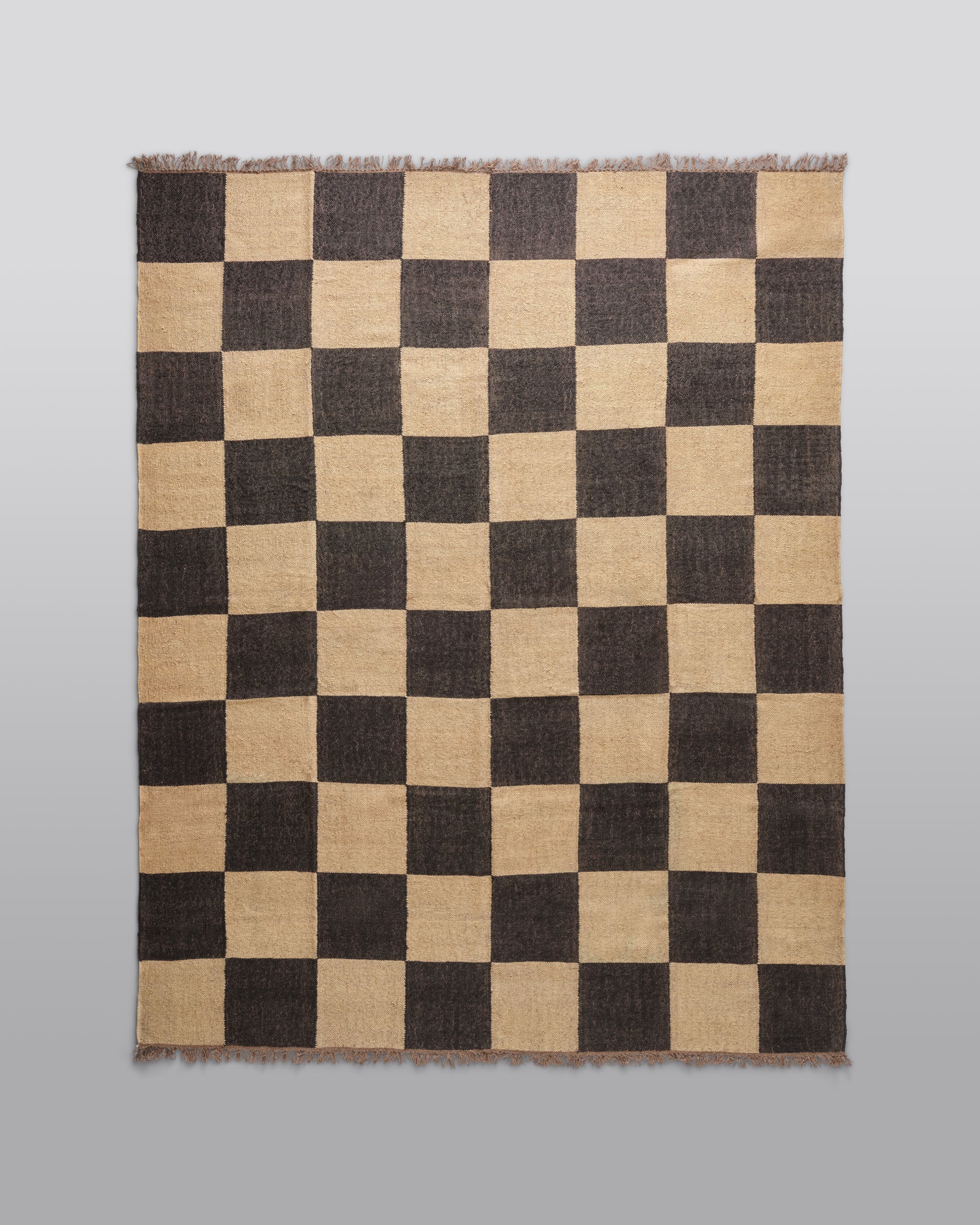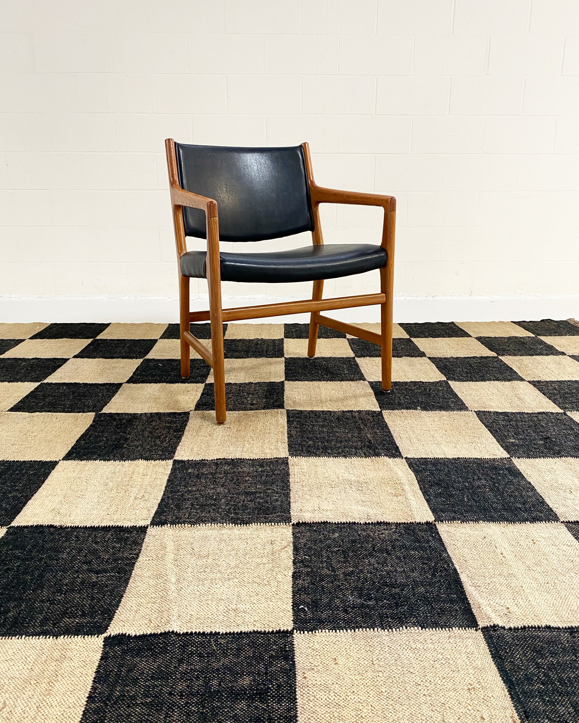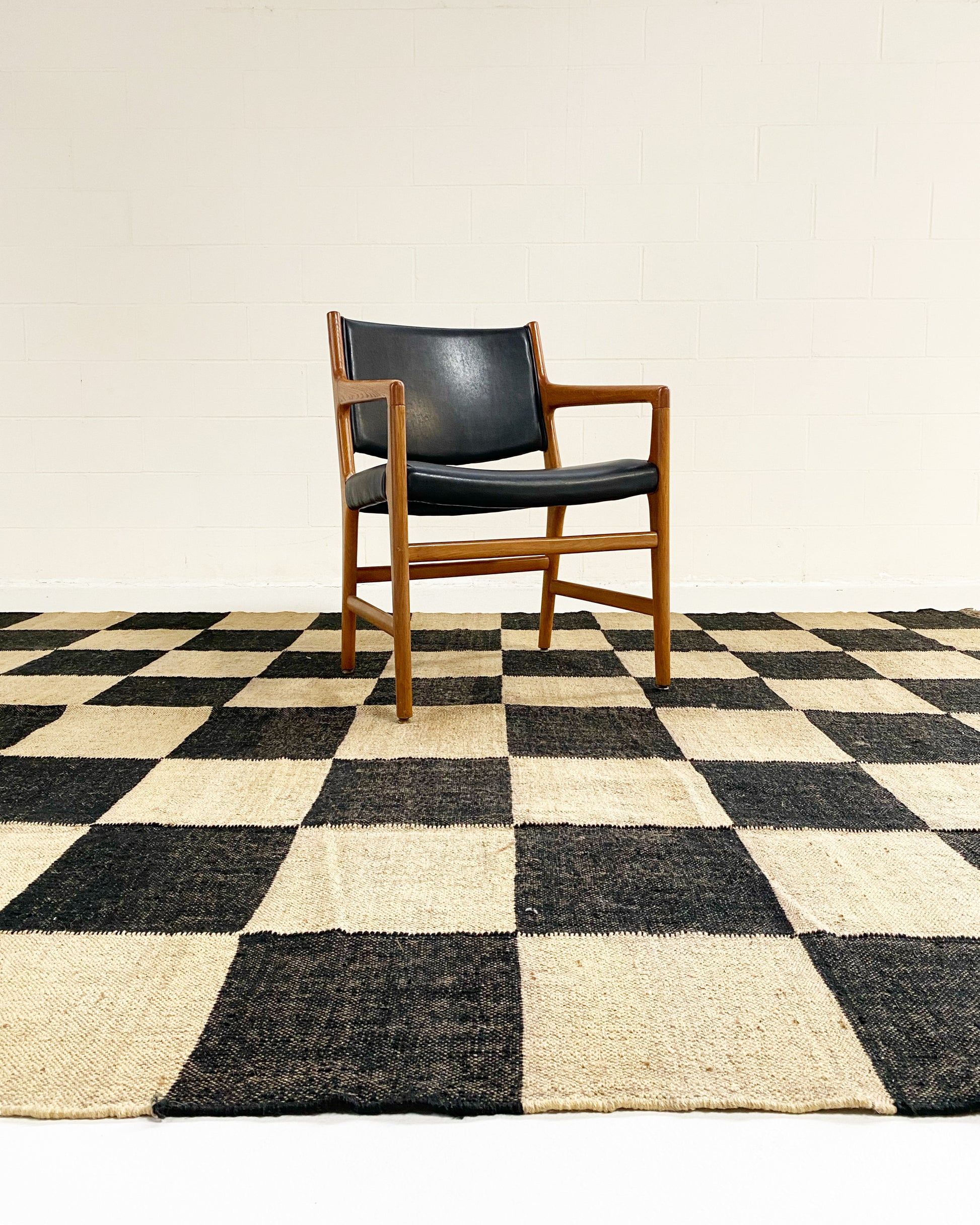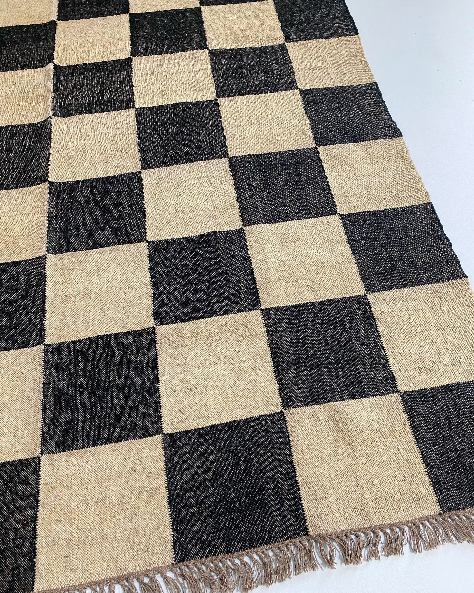 Our beautiful wool and jute checkerboard rugs are expertly handwoven in Jaipur, India. The checkerboard pattern and neutral off black & natural coloring are chic and sophisticated with a hint of bohemian cool. These bigger checks are approximately 12 x 12 inches. The flat weave is perfect for layering or on its own. Available in sizes 8x10', 9x12', and 11x14'