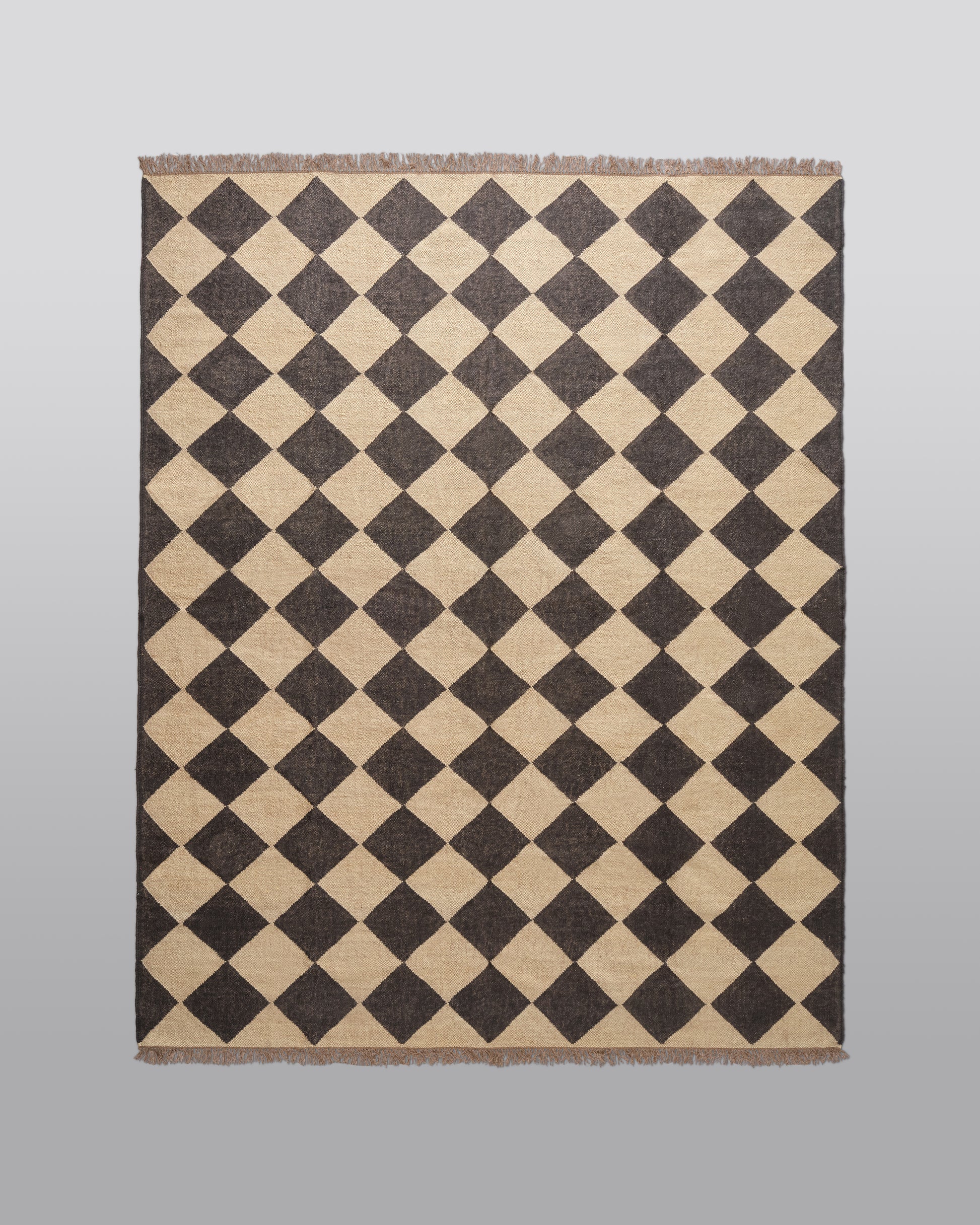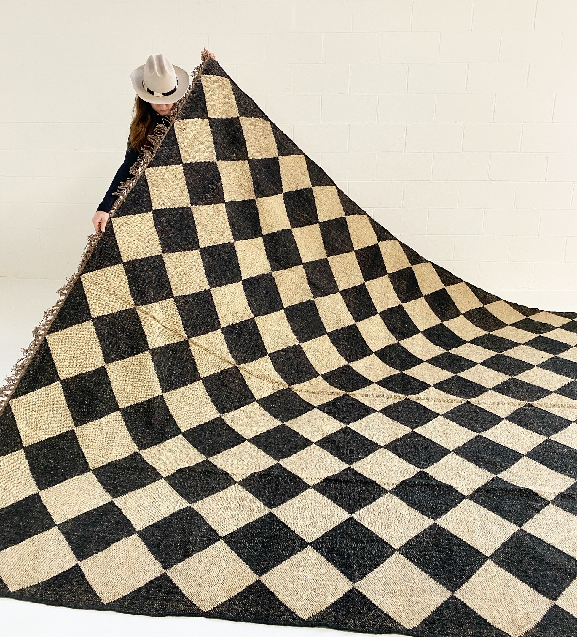 Our beautiful wool and jute checkerboard rugs are expertly handwoven in Jaipur, India. The diamond checkerboard pattern and neutral off black & natural coloring are chic and sophisticated with a hint of bohemian cool. These bigger checks are approximately 12 x 12 inches. The flat weave is perfect for layering or on its own. Available in sizes 6x9', 8x10', 9x12', and 11x14'