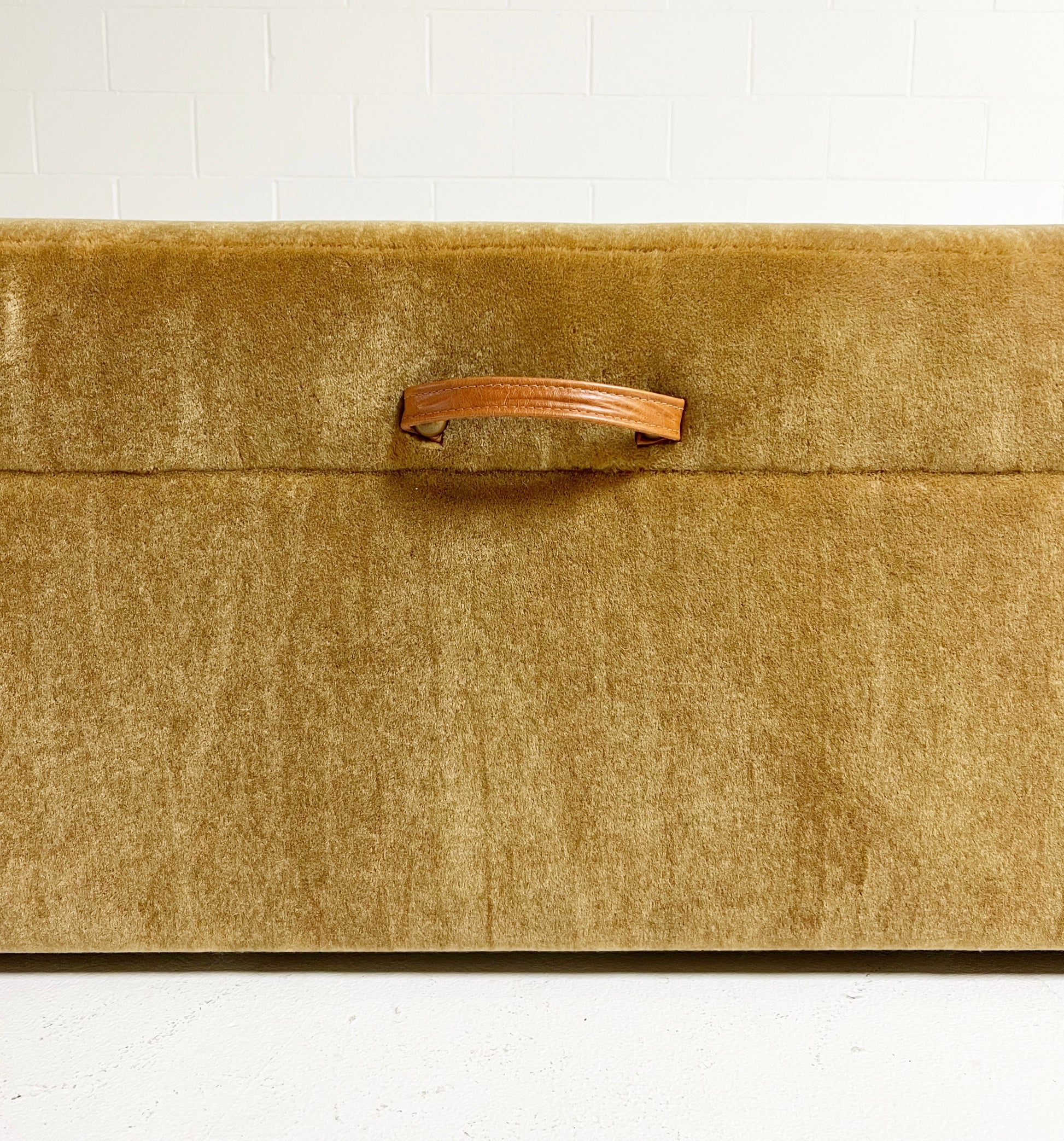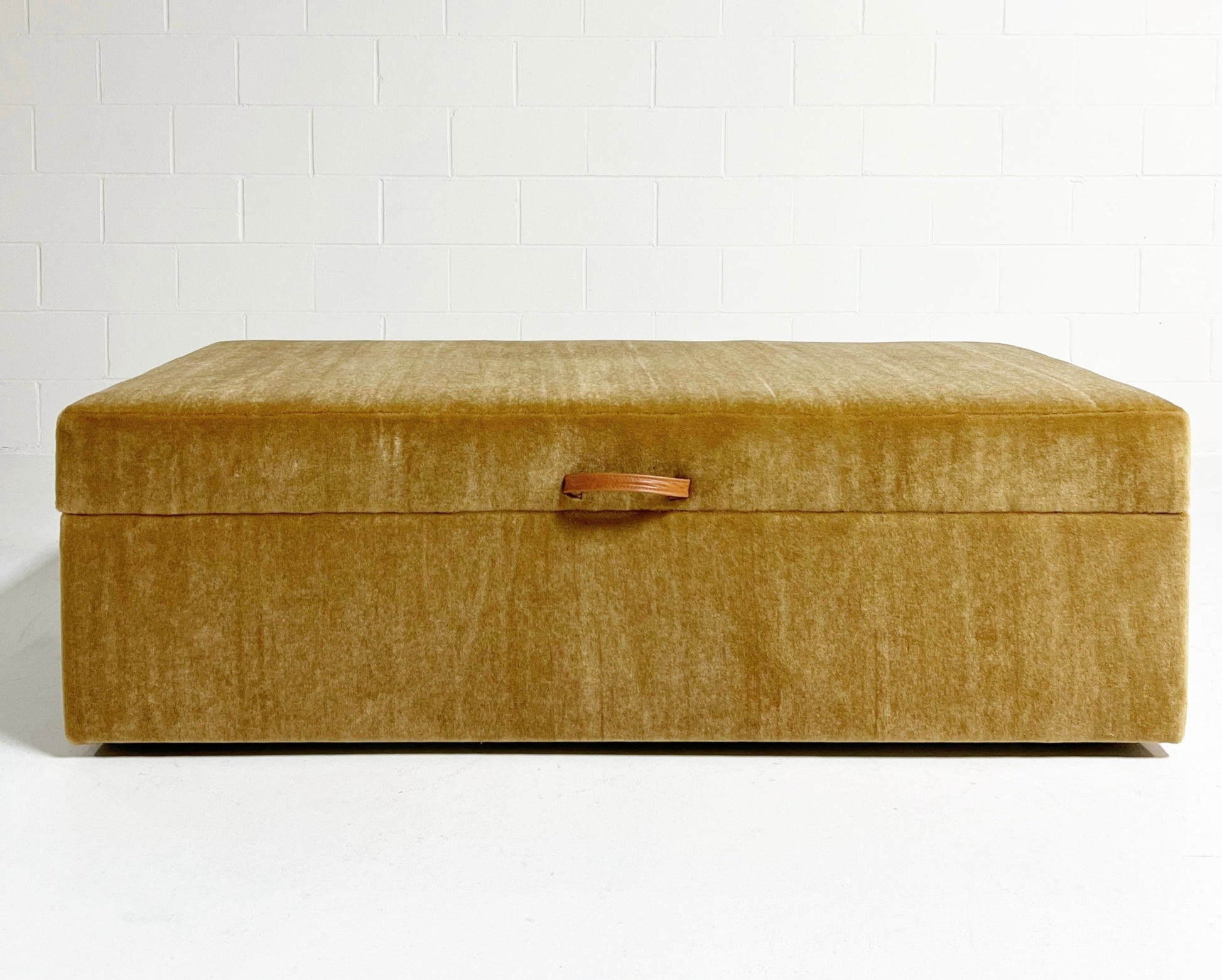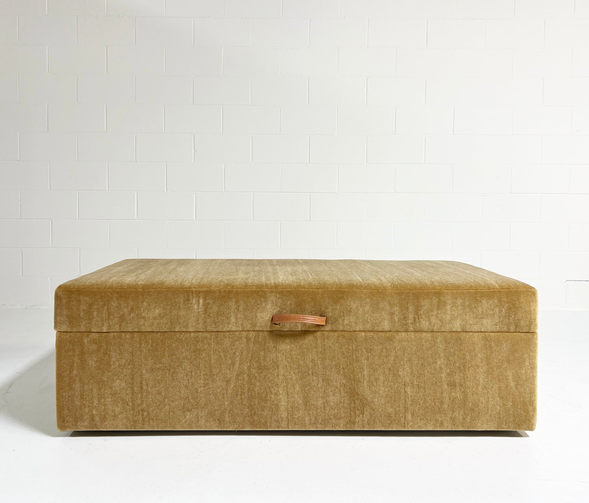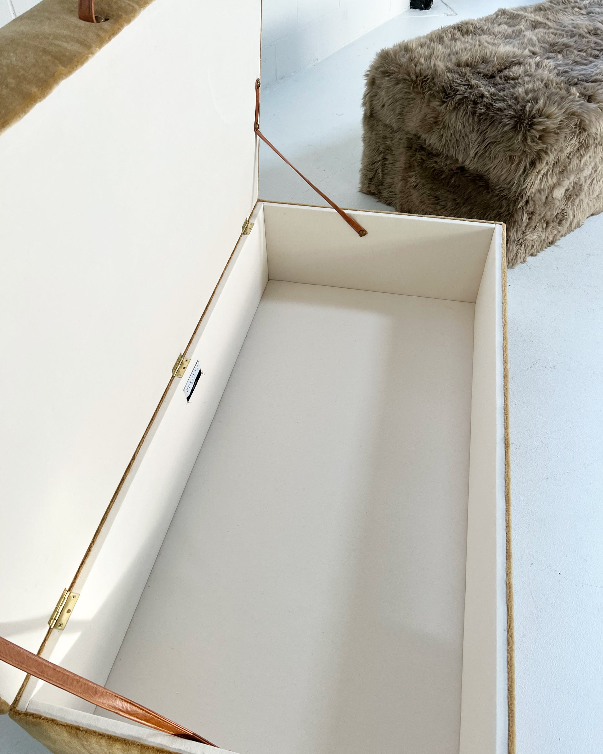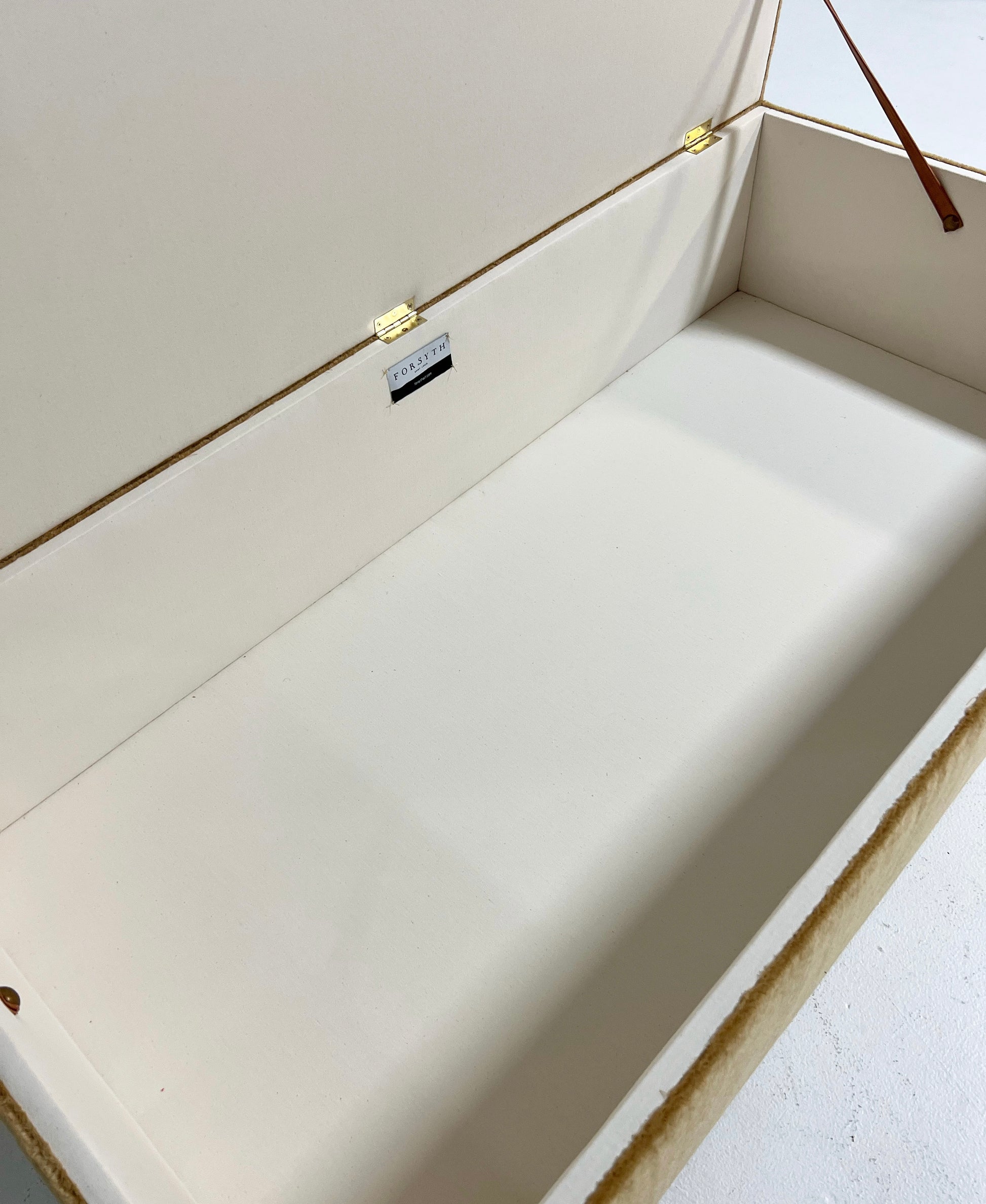 Part of the Forsyth Ottoman Collection. Soft and luxurious, the Forsyth Large Storage Ottoman is designed to be a versatile piece in a room adding an element of natural texture. The perfect coffee table, ottoman, or extra seating. Each ottoman is completely handmade by our amazing team of master upholsterers. Lift the lid with an attached leather strap to find ample storage space inside for extra blankets, toys, you name it. The inside storage space is finished with a beautiful ivory cotton canvas.