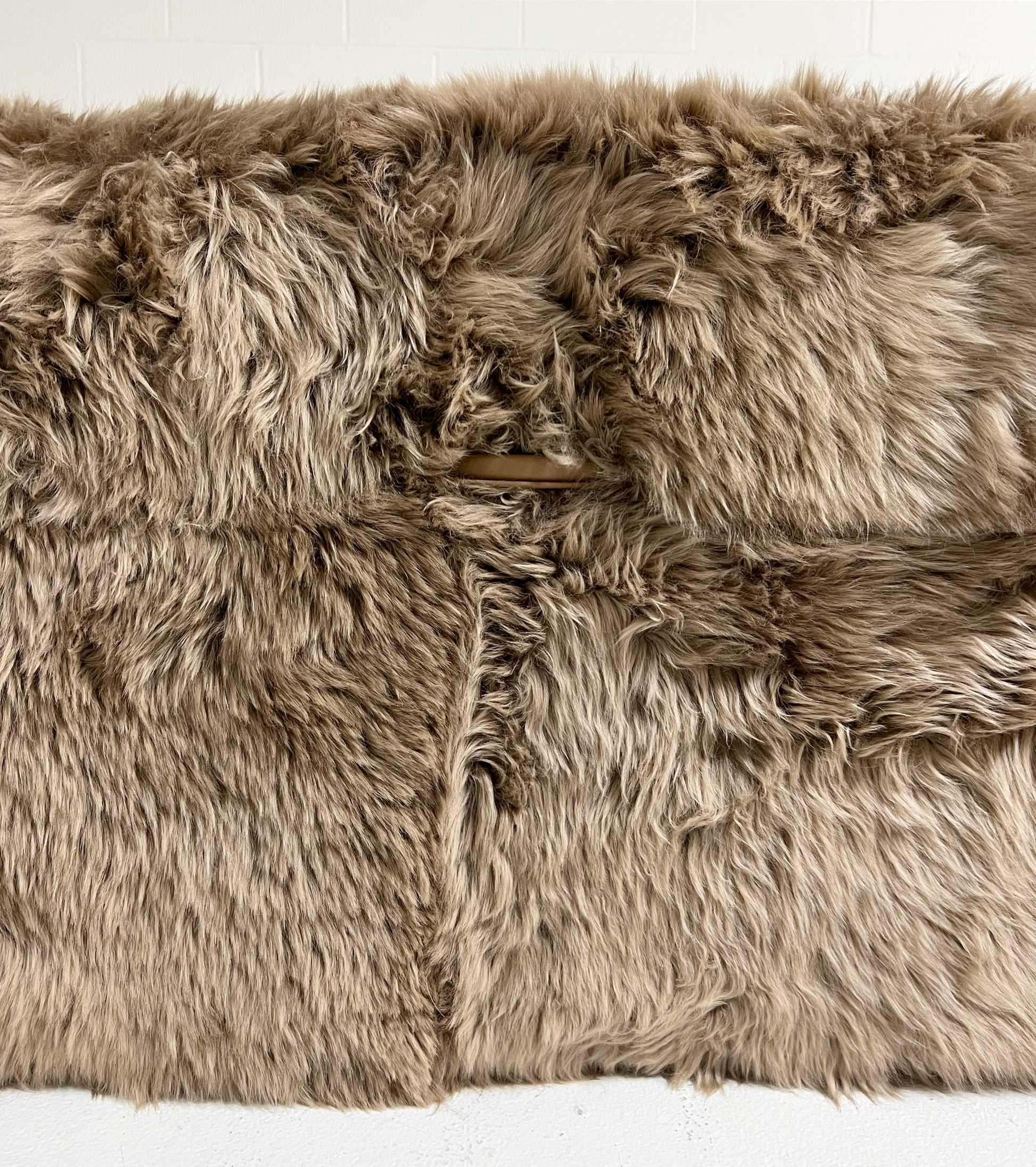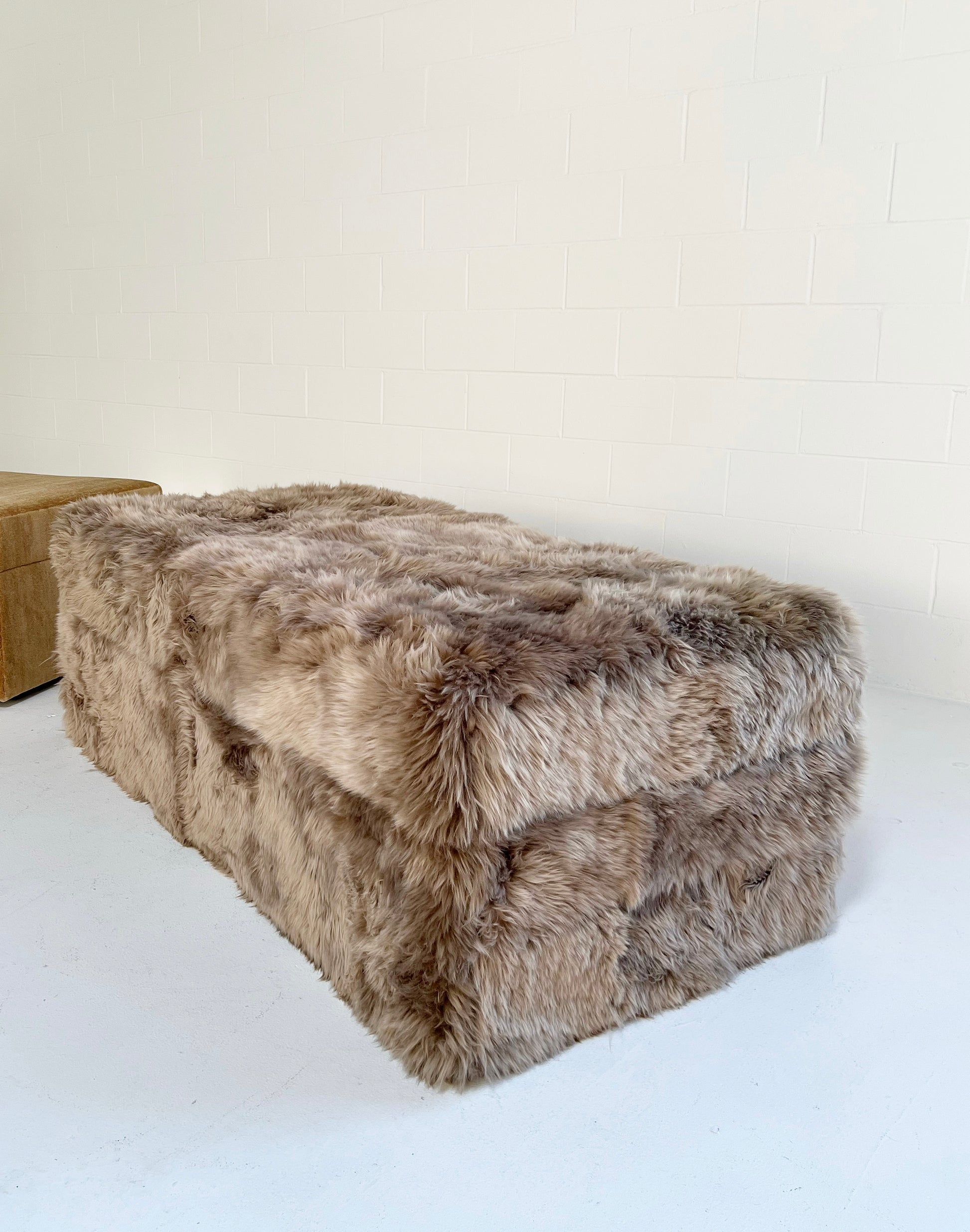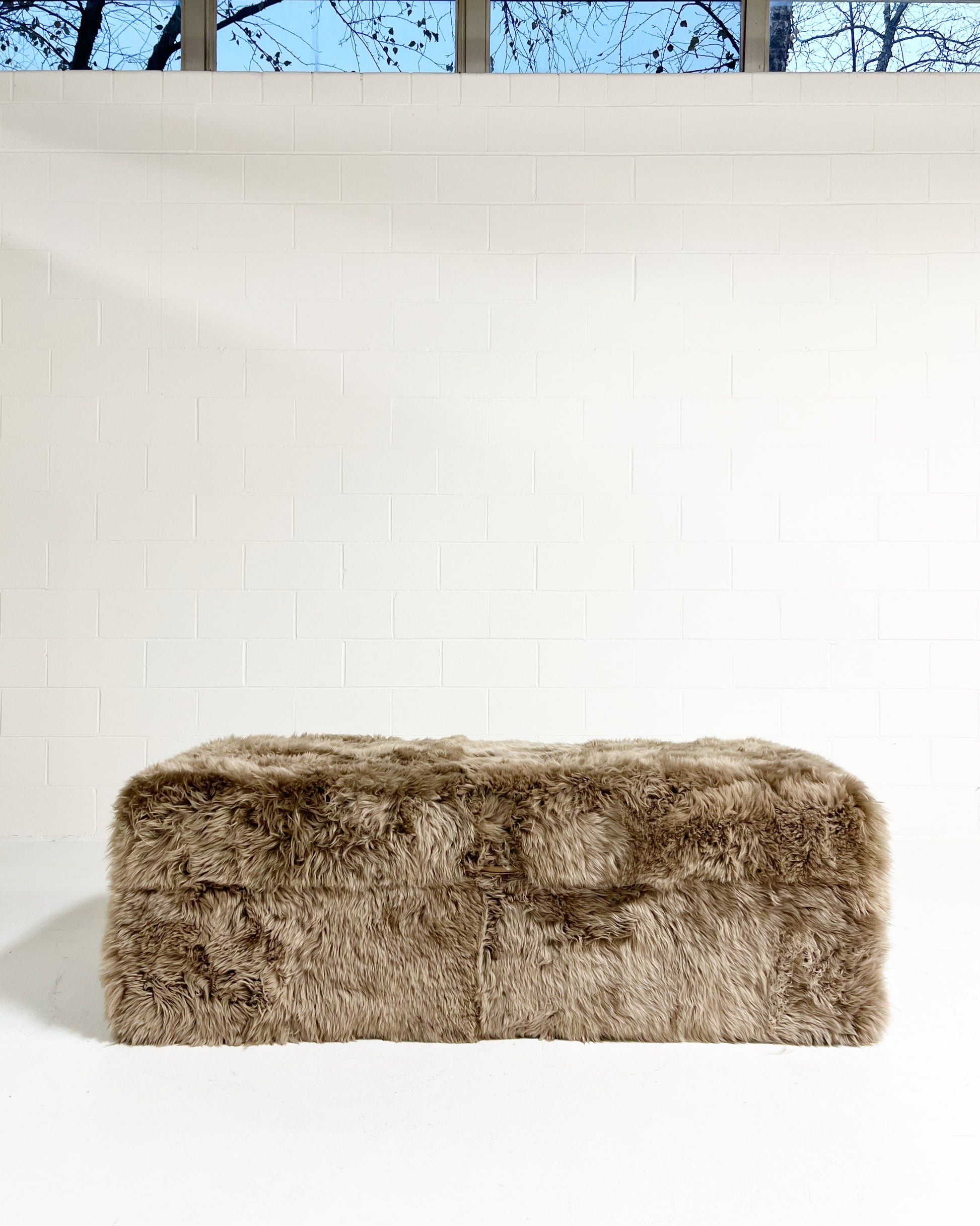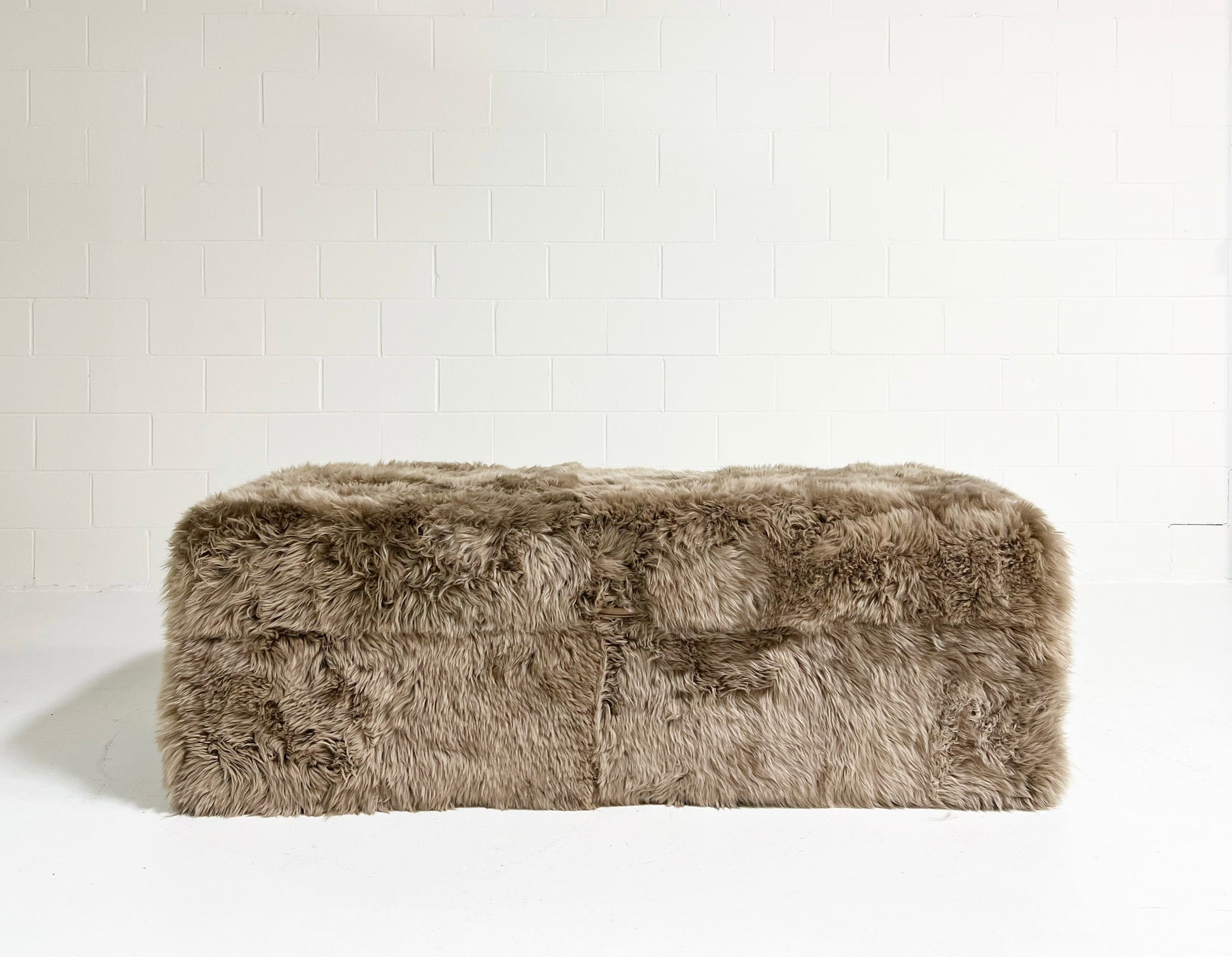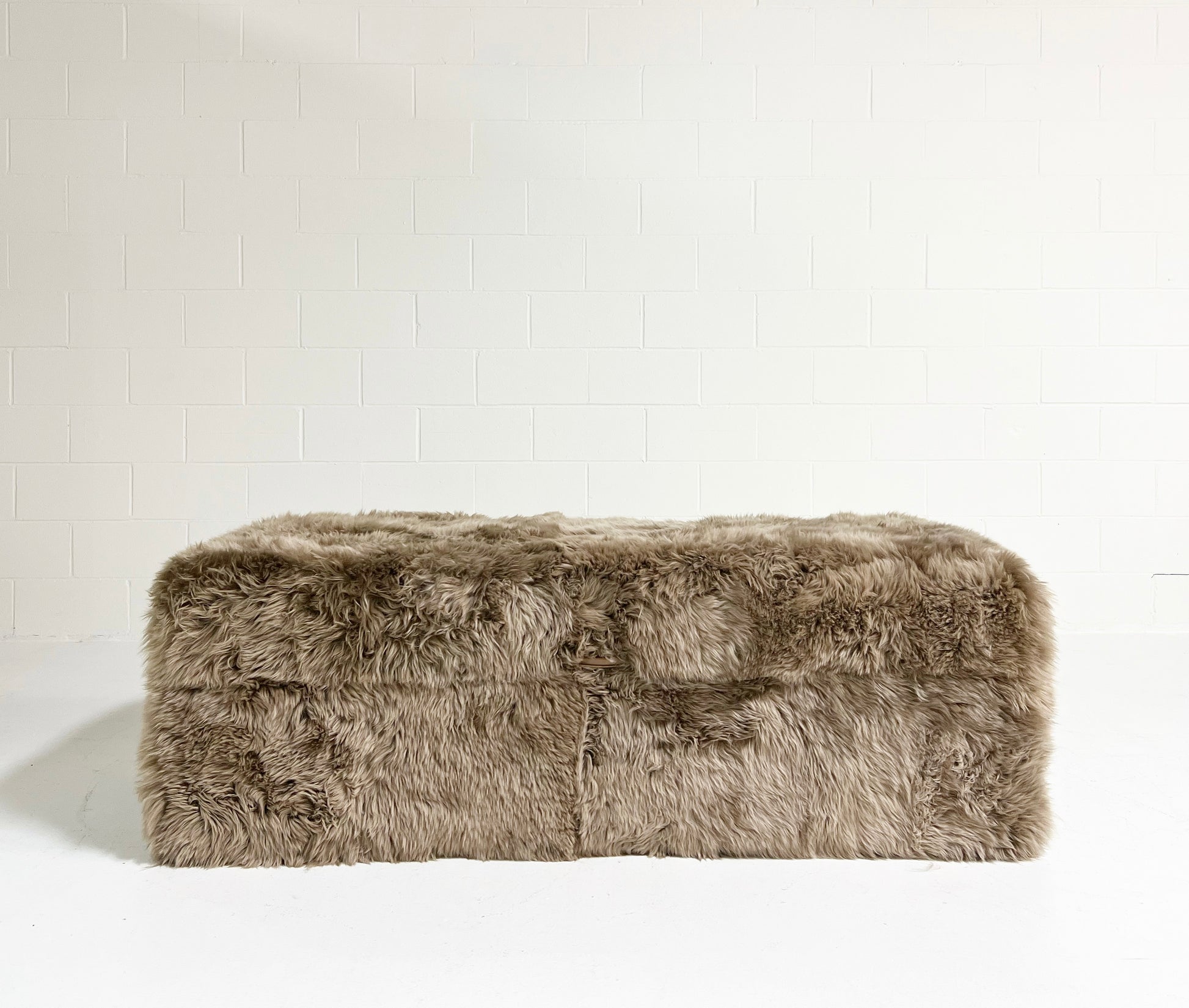 Custom made to order. Please allow 10-12 weeks. Also note, the ottoman can be made completely bespoke to meet your design needs. If you are interested in a different size or color for your space, just ask - we can custom make any size you need in a variety of colors and materials. Example shown is the Forsyth New Zealand Sheepskin in smokey taupe colorway.