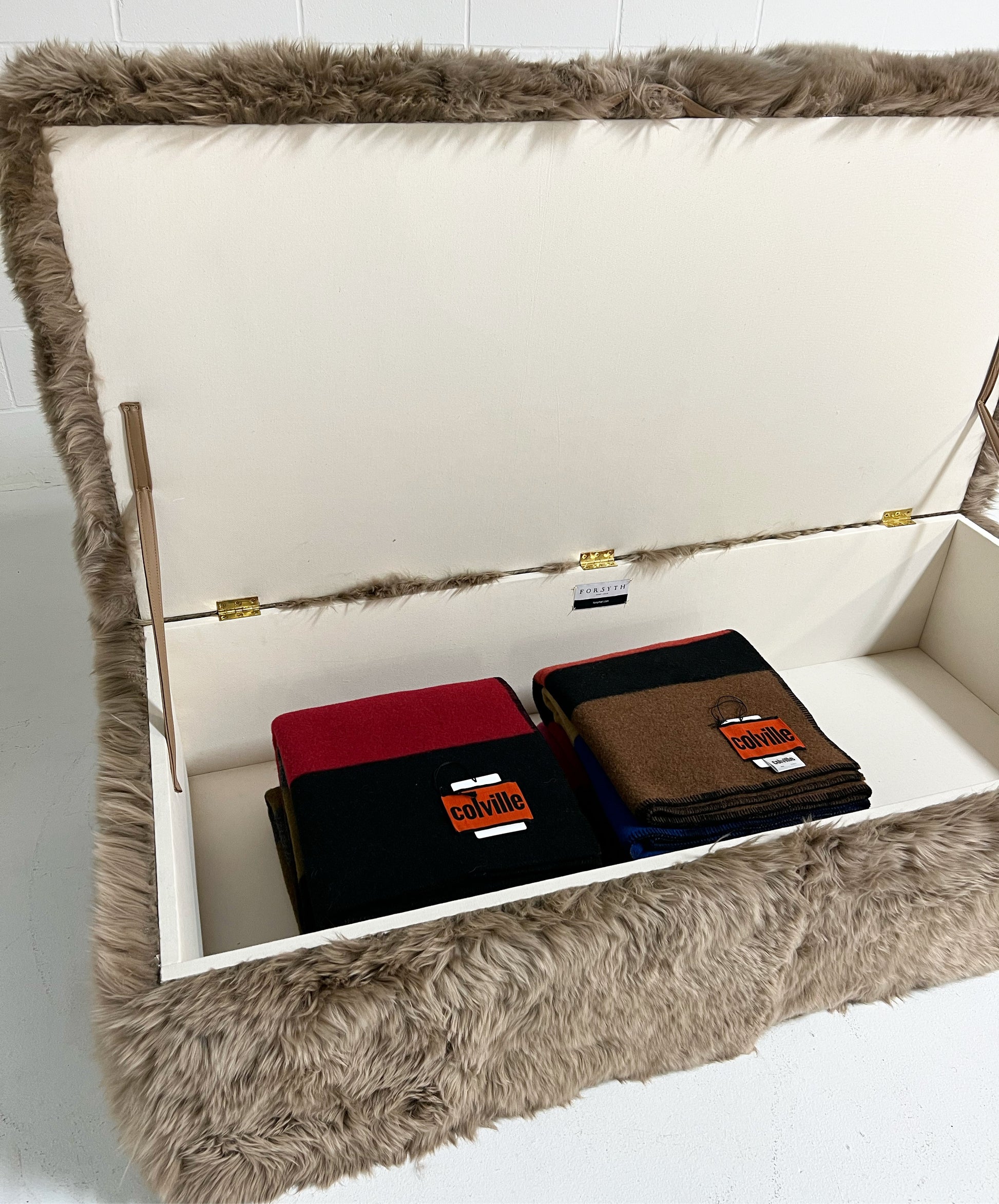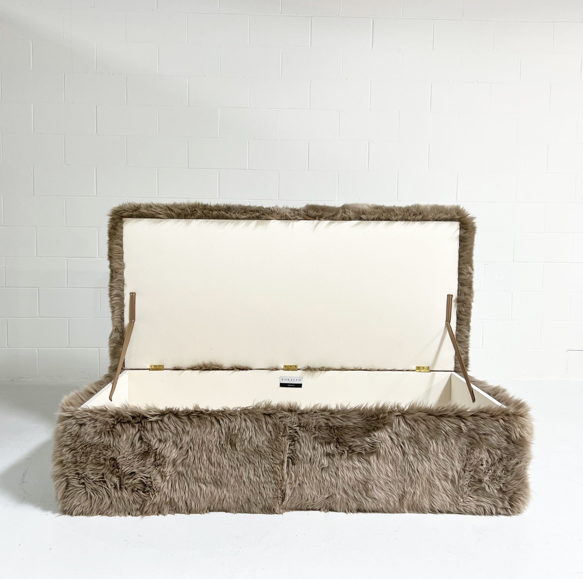 Part of the Forsyth Ottoman Collection. Soft and luxurious, the Forsyth Large Storage Ottoman is designed to be a versatile piece in a room adding an element of natural texture. The perfect coffee table, ottoman, or extra seating. Each ottoman is completely handmade by our amazing team of master upholsterers. Lift the lid with an attached leather strap to find ample storage space inside for extra blankets, toys, you name it. The inside storage space is finished with a beautiful ivory cotton canvas.