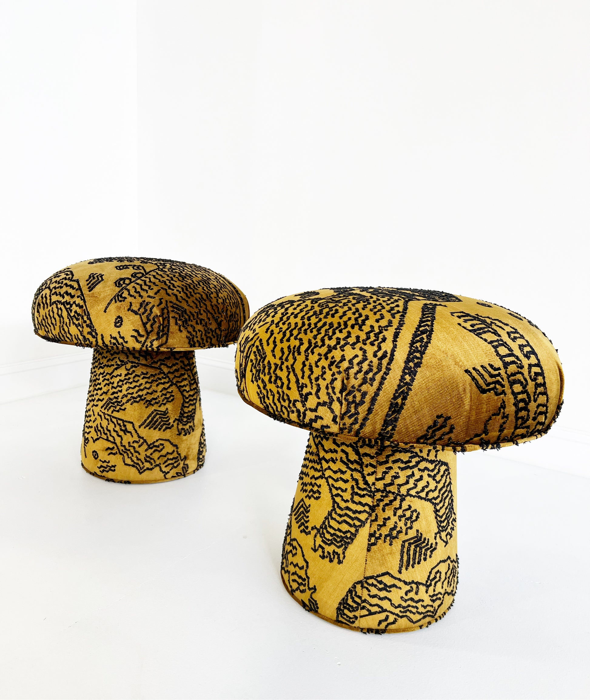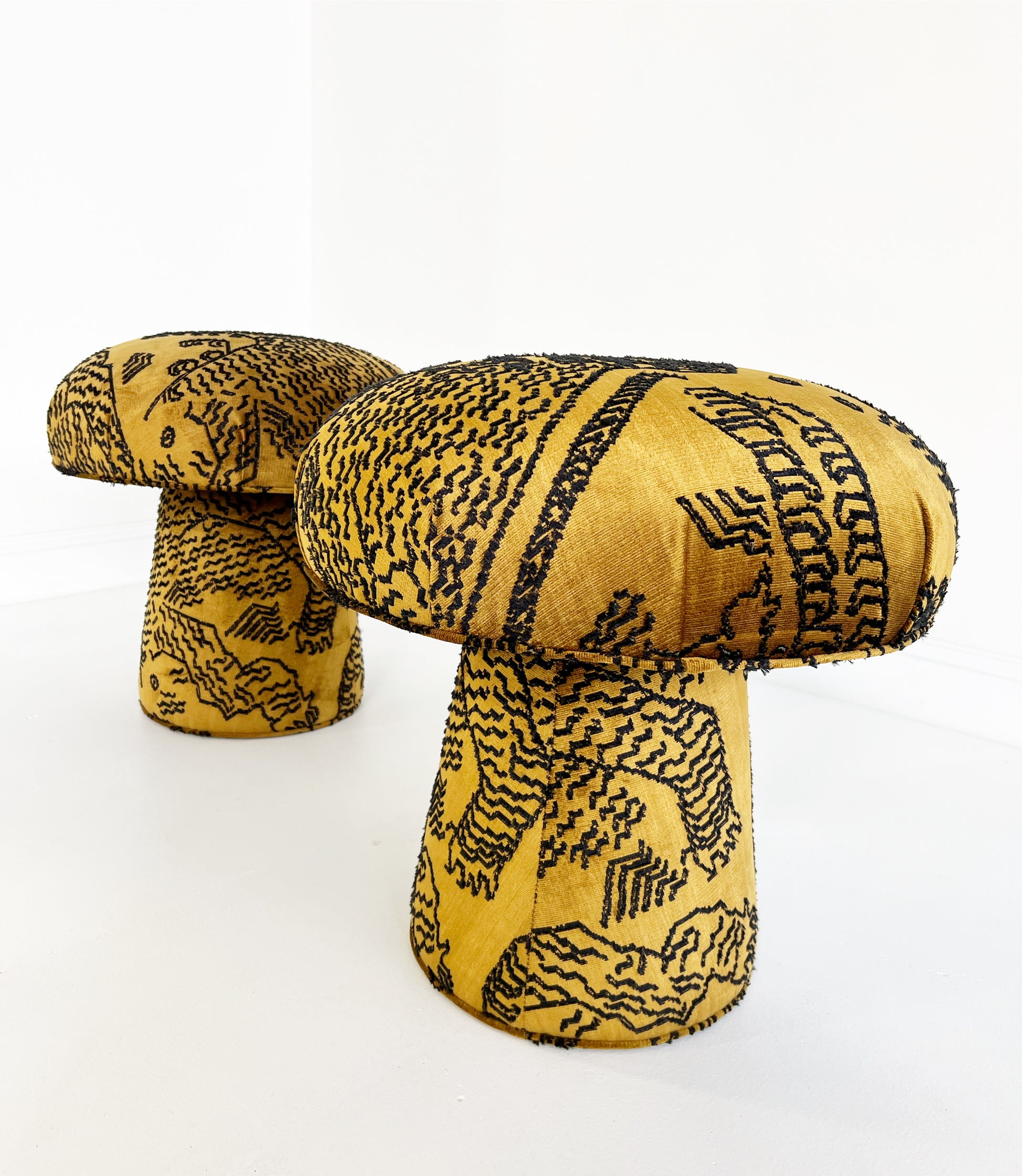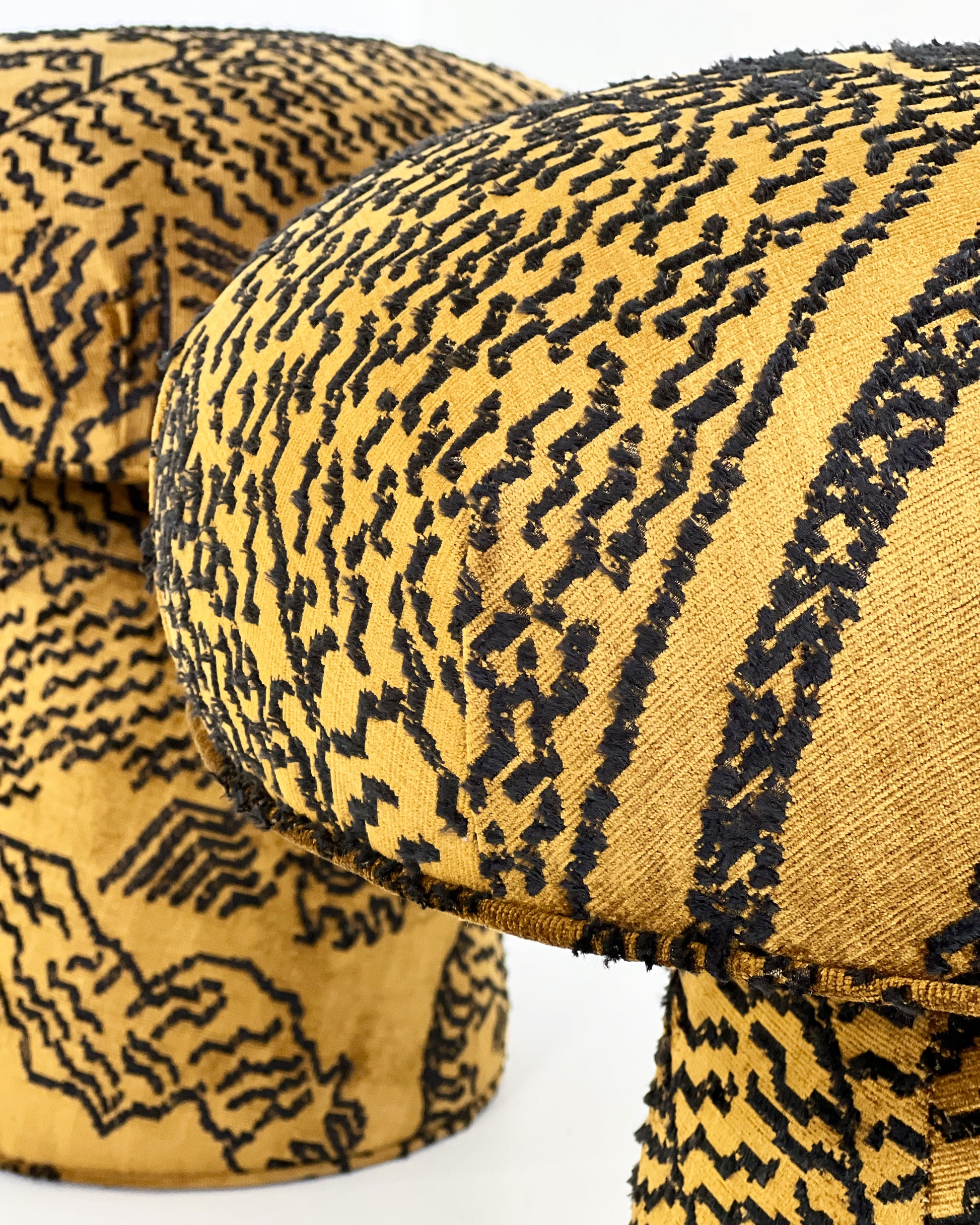 Shown in Dedar's stunning jacquard velvet, Tiger Mountain. Tiger Mountain is available in 3 colorways, Graphite (black and white), Fauve (the mustard shown), and Petrified Wood. The Mushroom pictured is in Fauve.