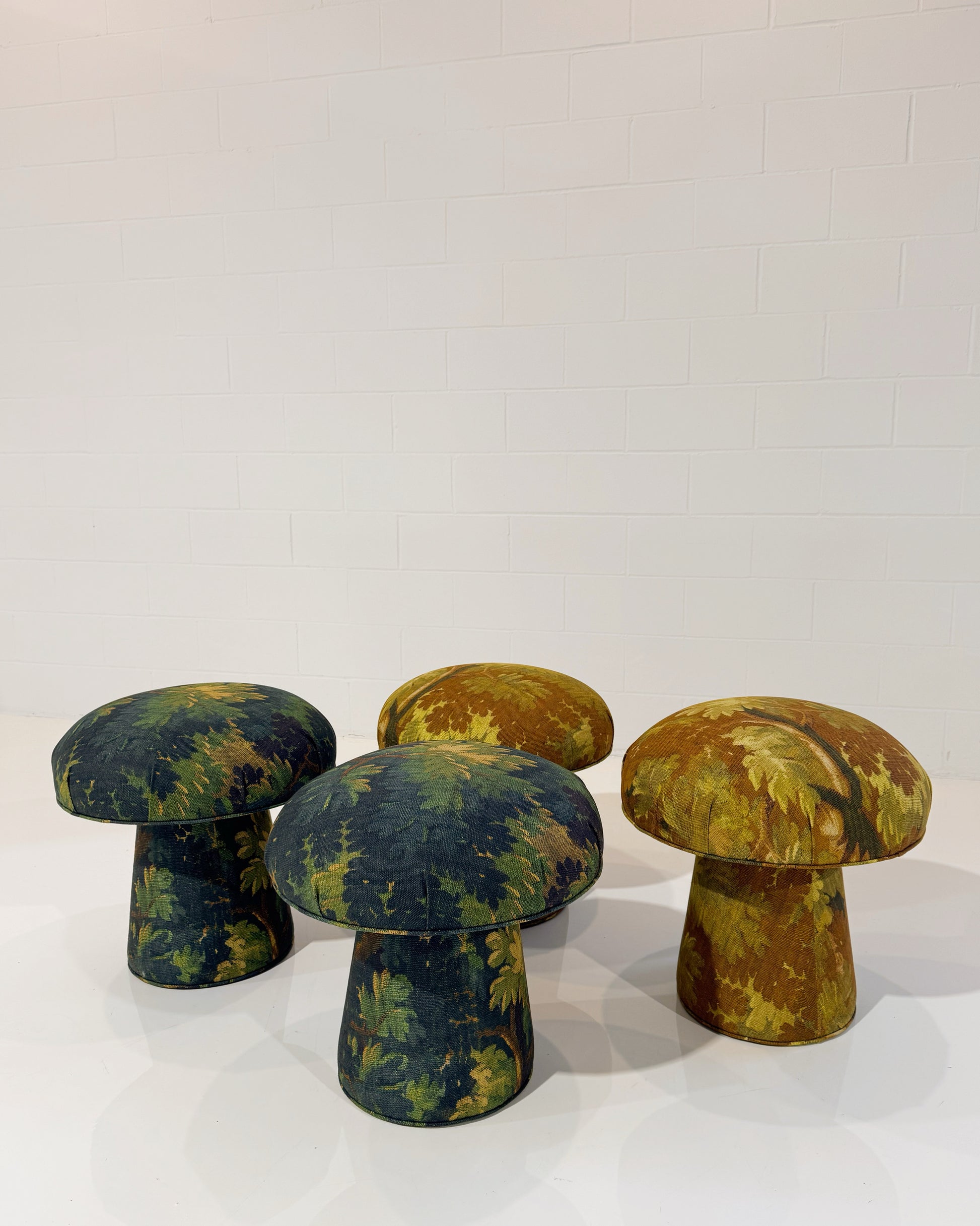 Shown in Dedar's beautiful linen fabric, Schwarzwald, a modern tapestry. Schwarzwald is available in 3 colorways, Verdure, Automne, and Bleu Nuit. The 4 mushrooms pictured are in Verdure and Automne.
