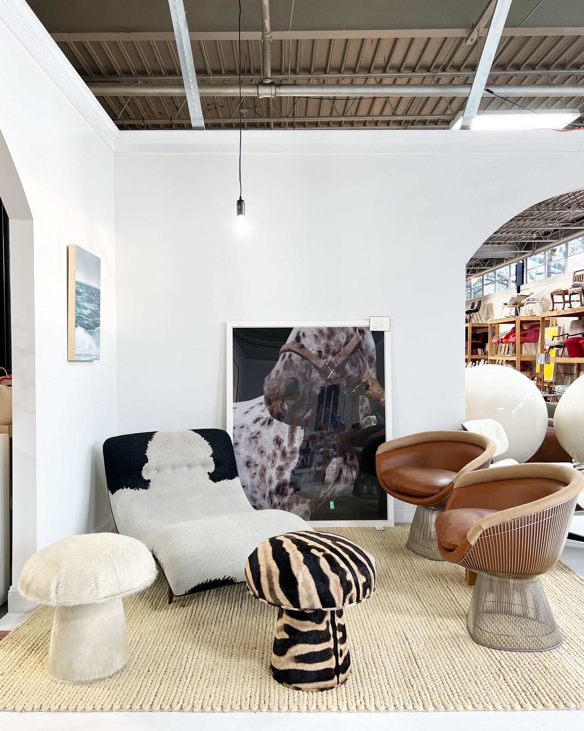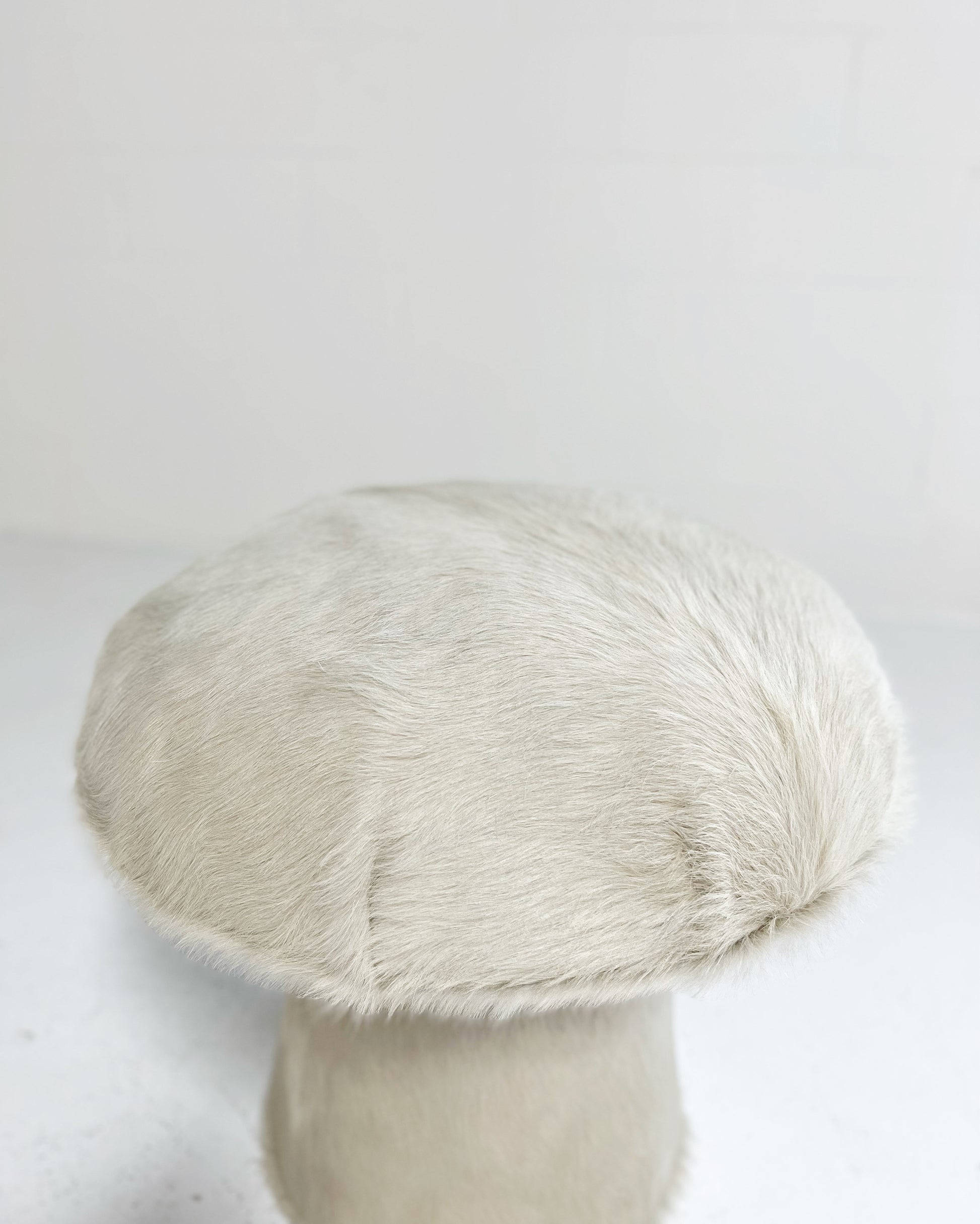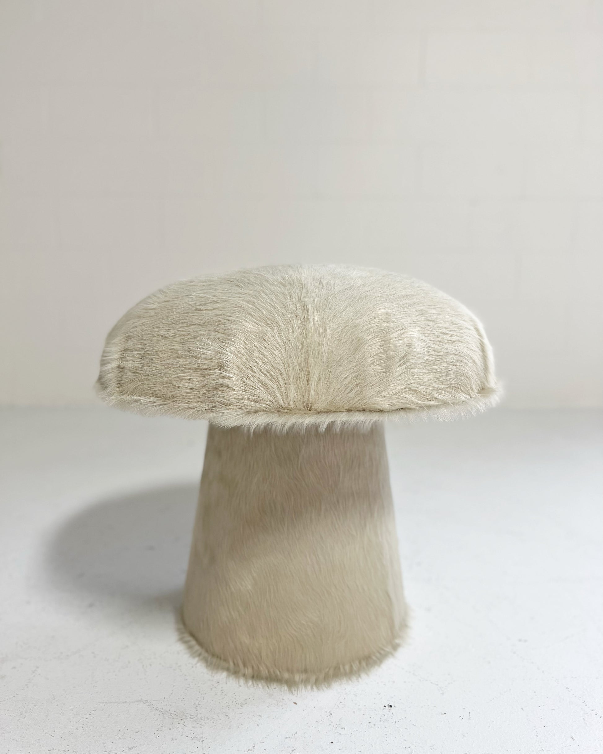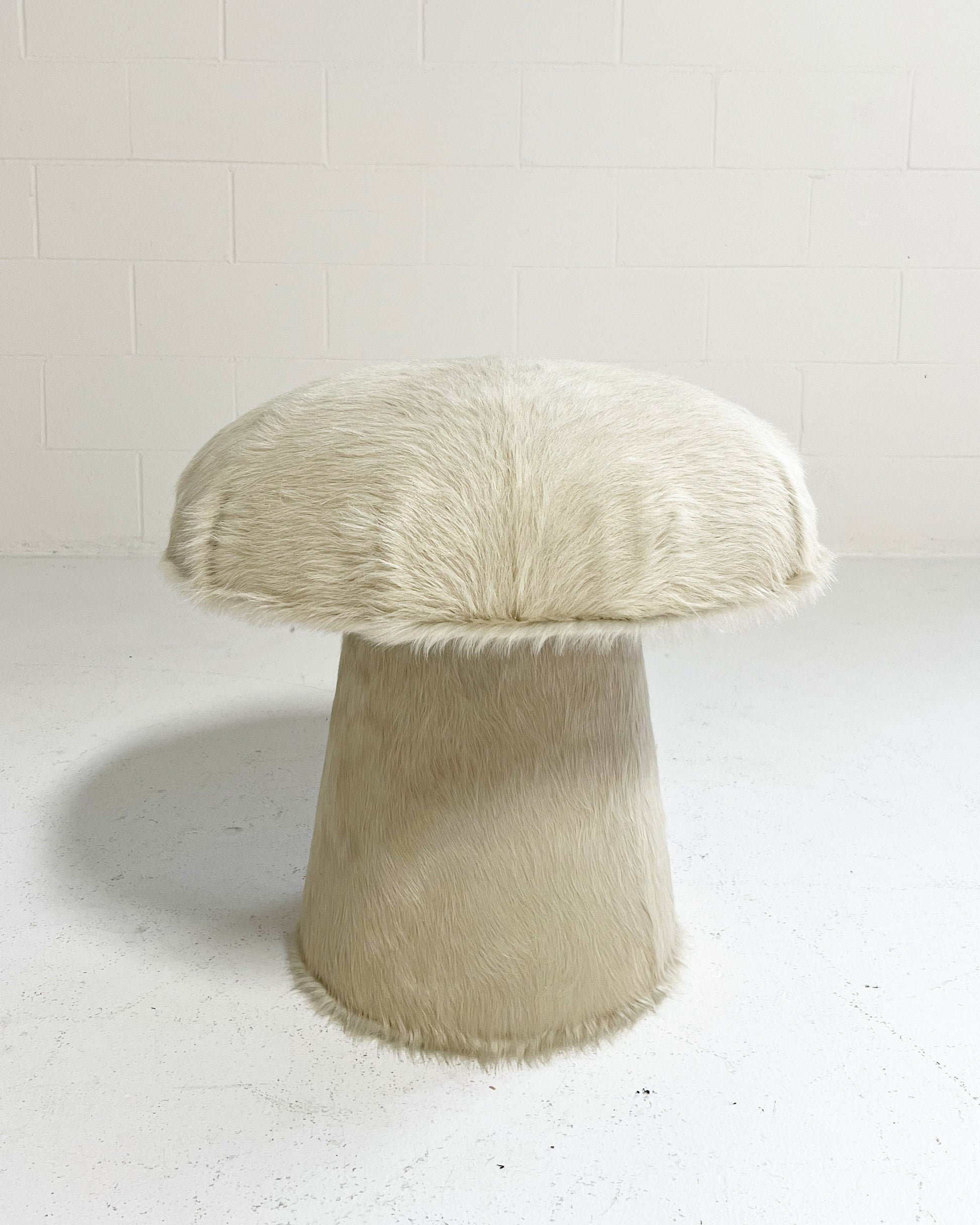 Shown in ivory cowhide. Interested in a different hide or fabric? The mushroom pouf can be made bespoke to meet your design needs. If you are interested in a different fabric for your space, just ask.