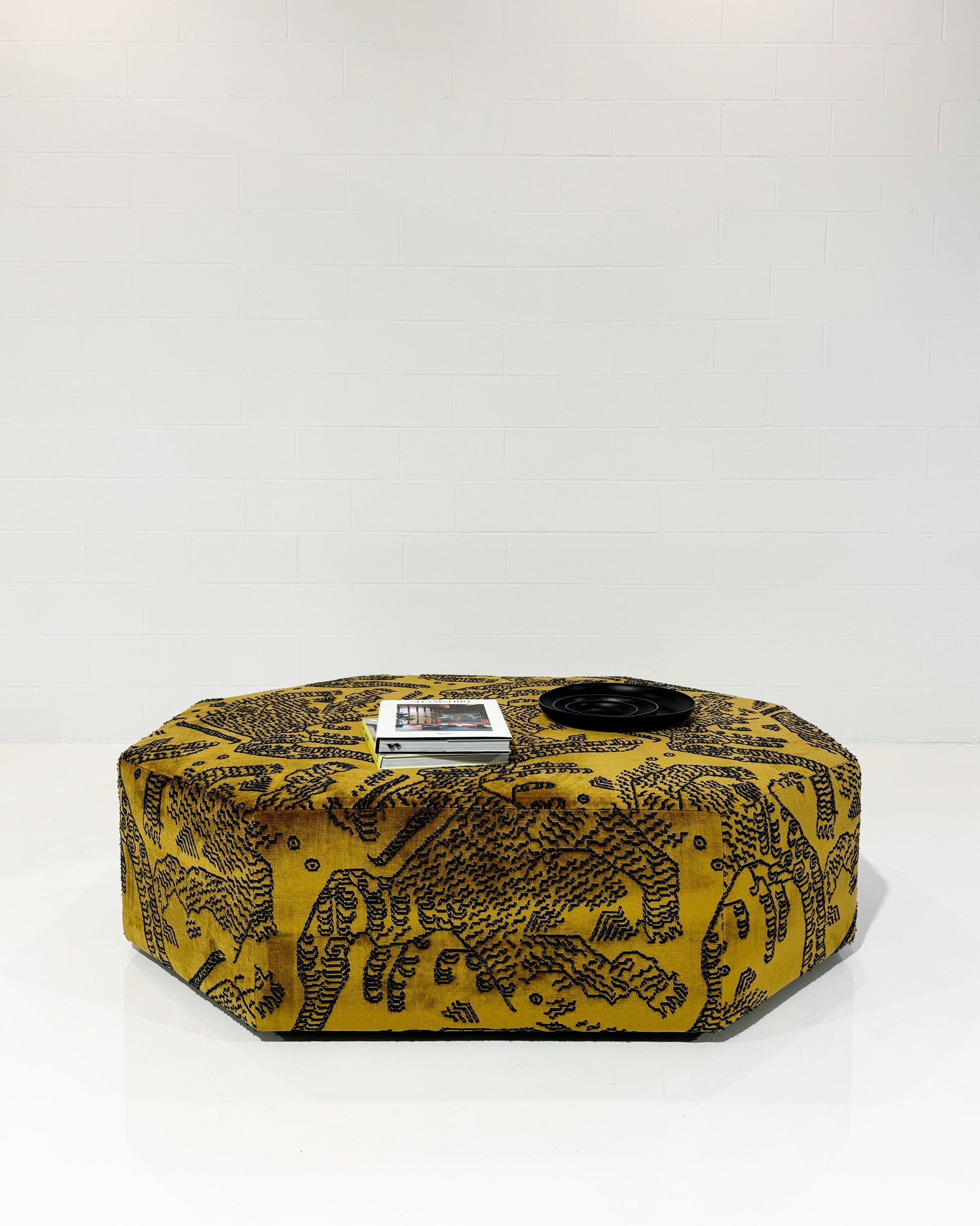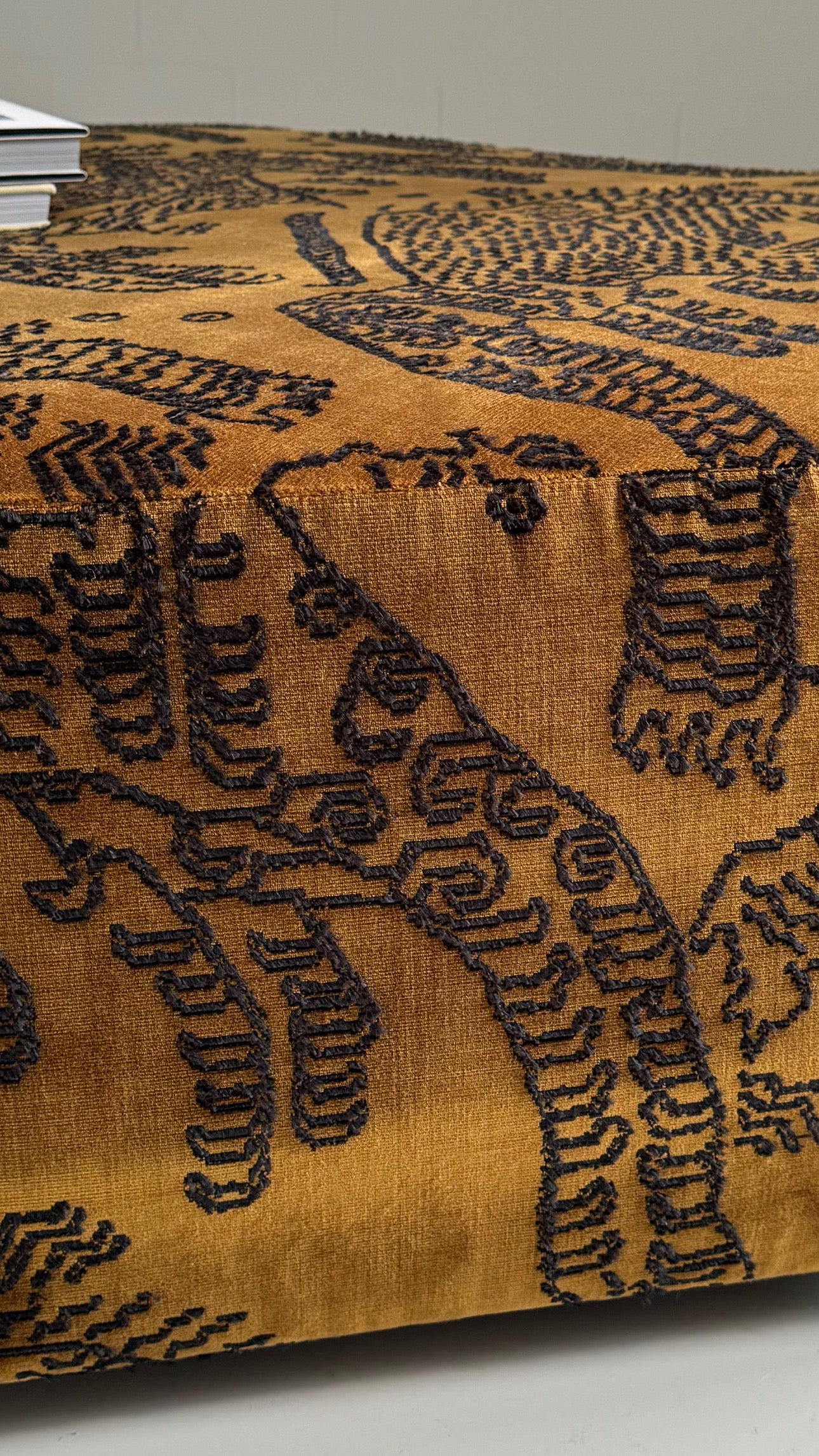 This one is designed and handcrafted in Dedar's Tiger Mountain, a stunning jacquard velvet and one of our favorite fabrics ever. The perfect coffee table, ottoman, or extra seating. Each ottoman is completely handmade by our amazing team of master upholsterers. Custom made to order. Please allow 6 to 8 weeks.
