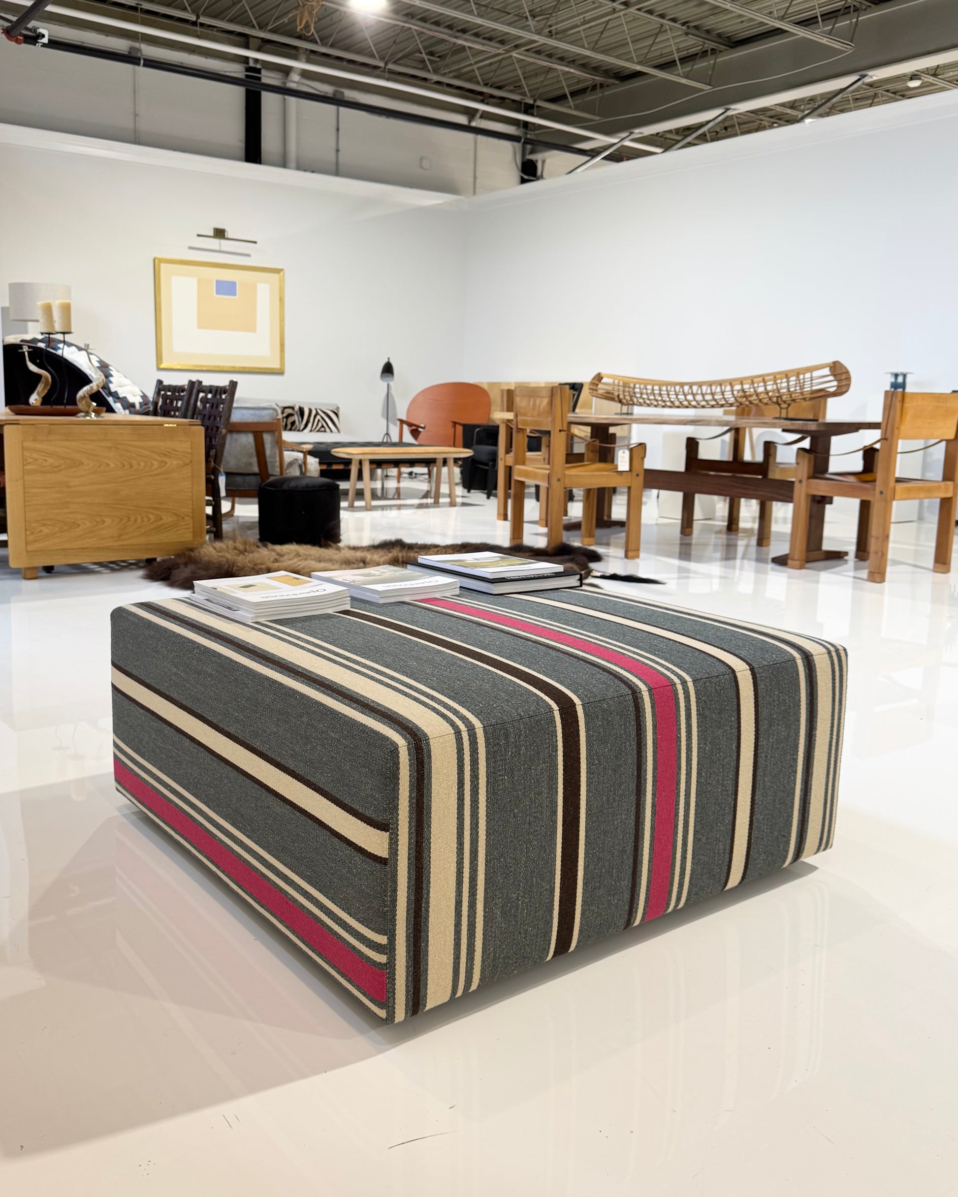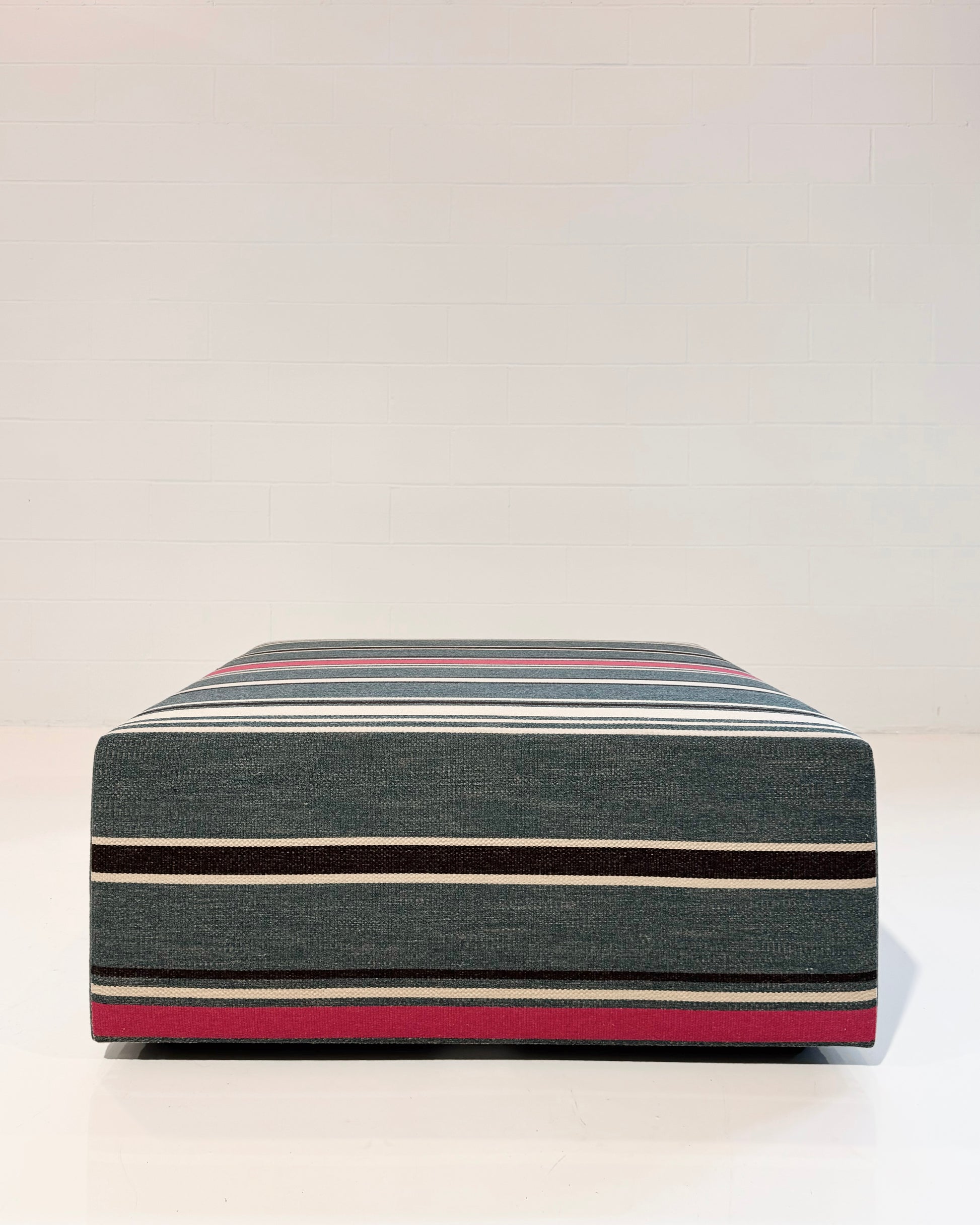 This Forsyth Ottoman is designed and handcrafted in BDDW's #007 fabric. A beautiful denim-y stripe. This fabric is now discontinued. We have one ottoman in stock in this fabric in 40x40x16 inches. The fabric is now discontinued. This ottoman is one of a kind.