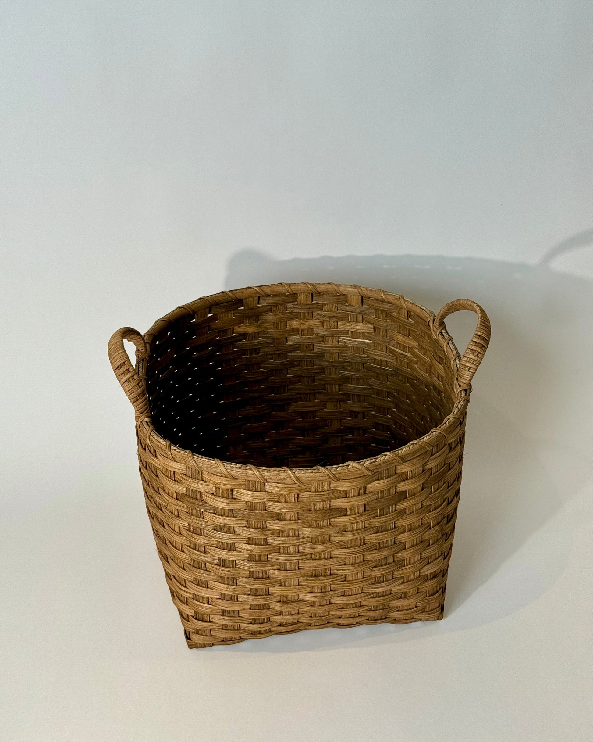 This piece is defined by its versatile shape: a square bottom for stability that gently curves into a generous, round top. Handwoven by us from natural rattan, the beautiful variations in the fibers ensure that your basket is a one-of-a-kind work of functional art. Extended, wrapped handles complete the design, offering both comfort and durability.