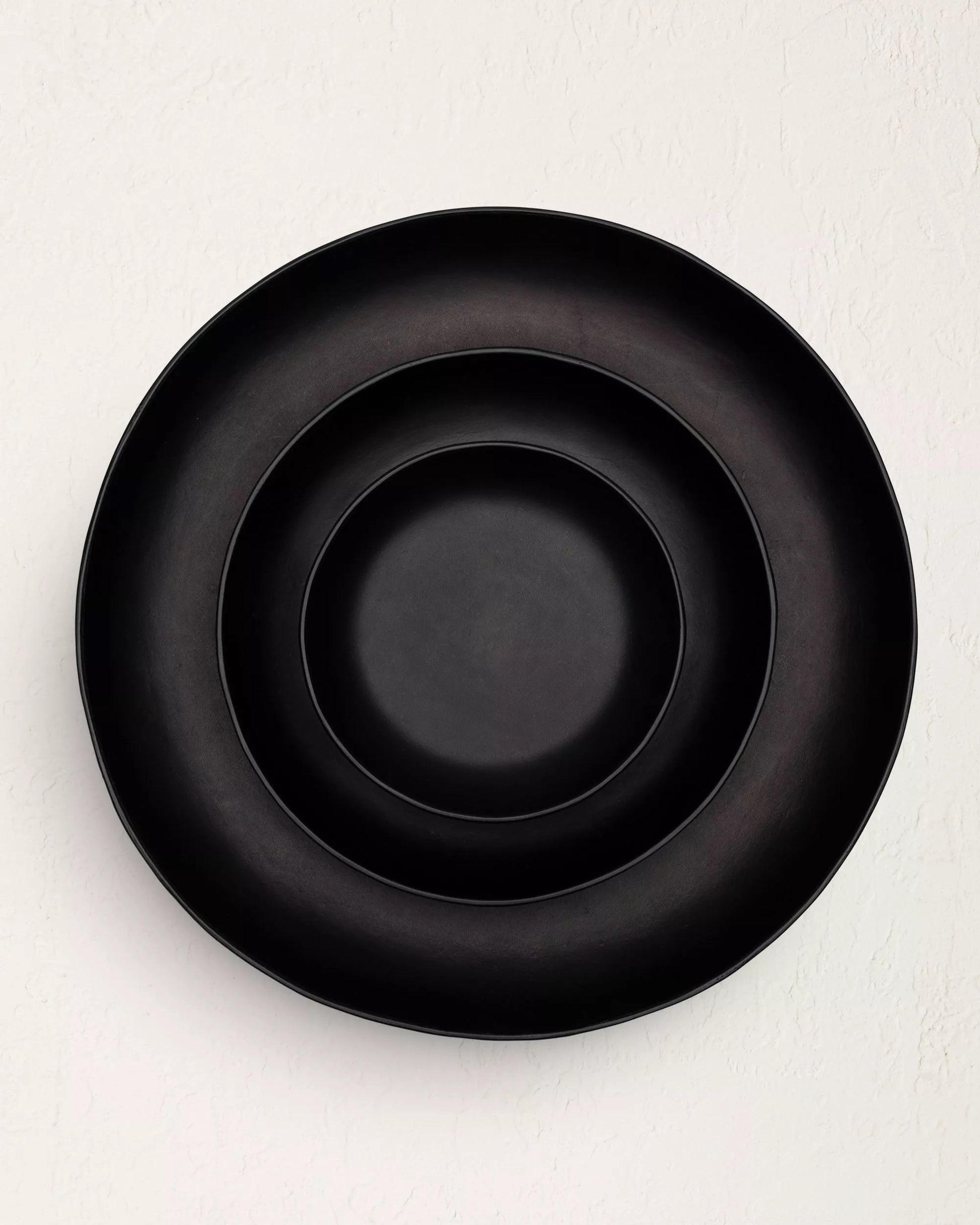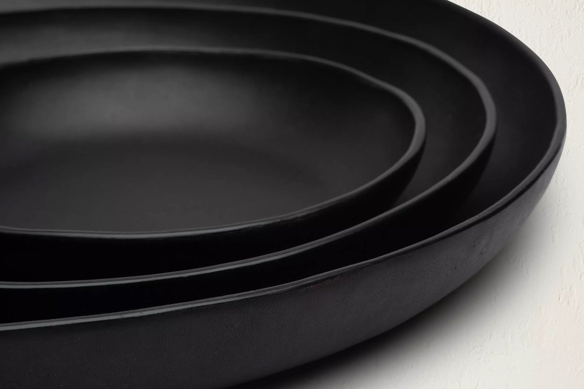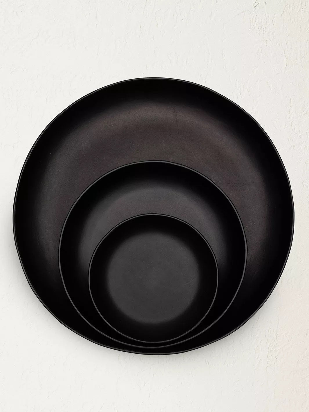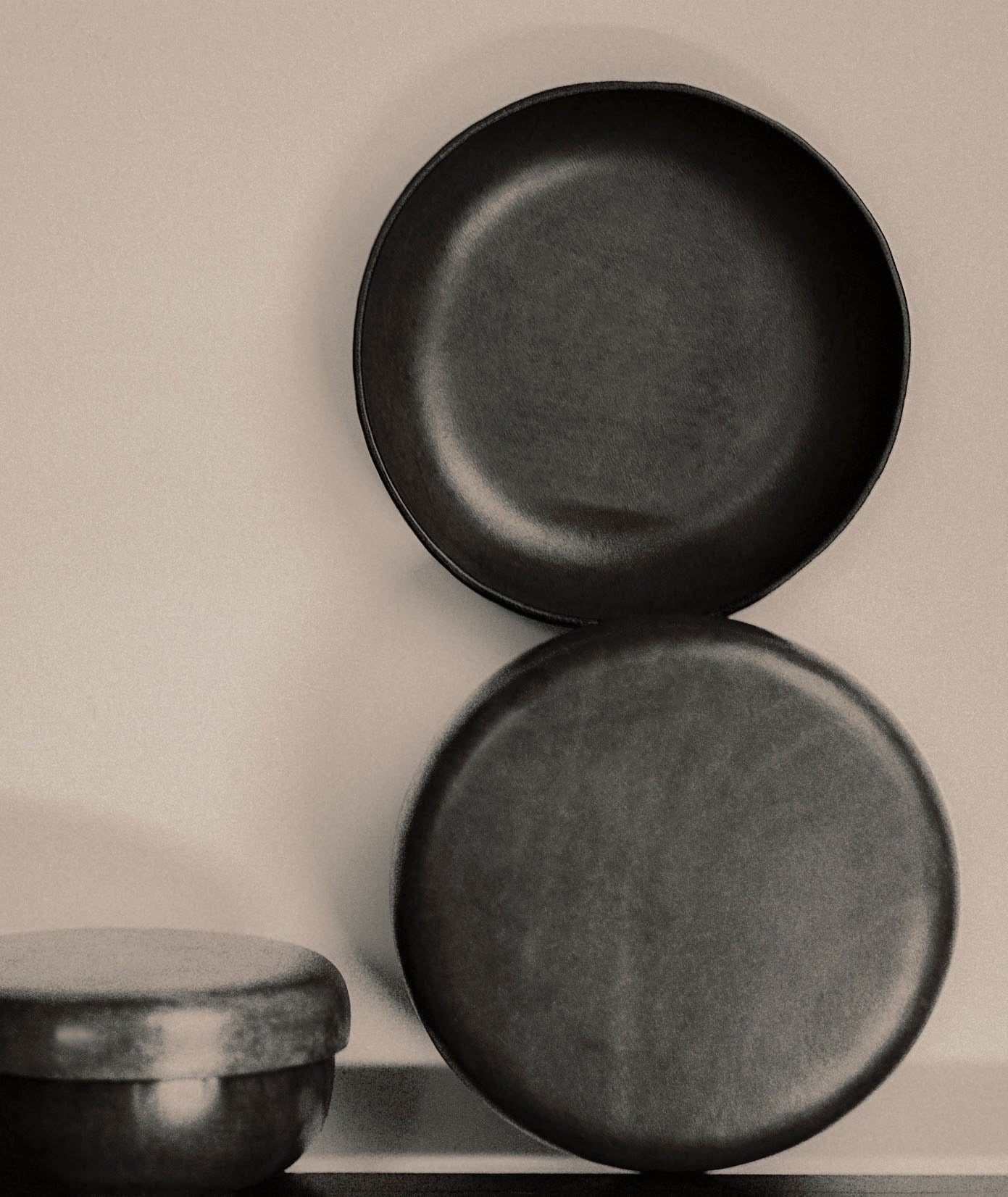 Sleek and sculptural, the Tray Set features three seamless circular forms constructed from a time-honored molding technique. Shaped in organic, biomorphic silhouettes, these smooth leather pieces feature buffed finishes that echo the look of Japanese lacquer-ware.