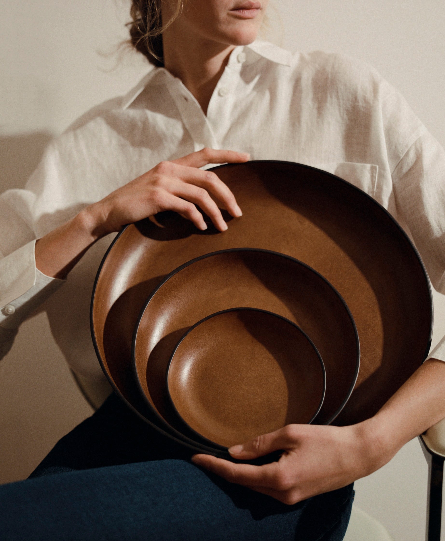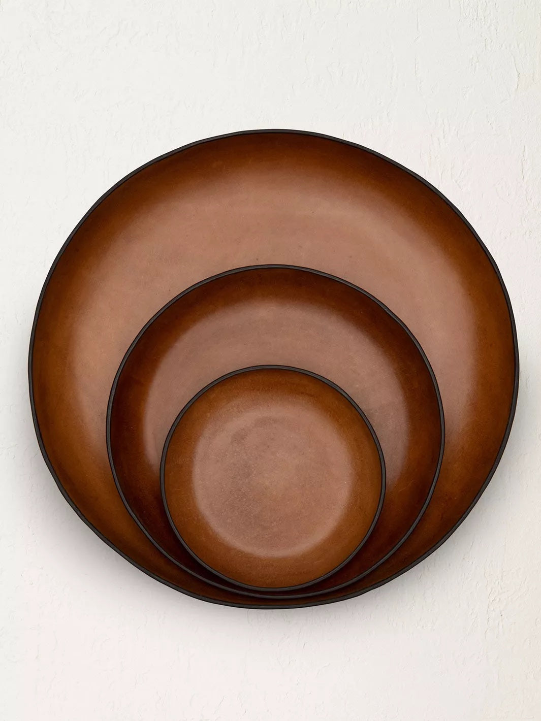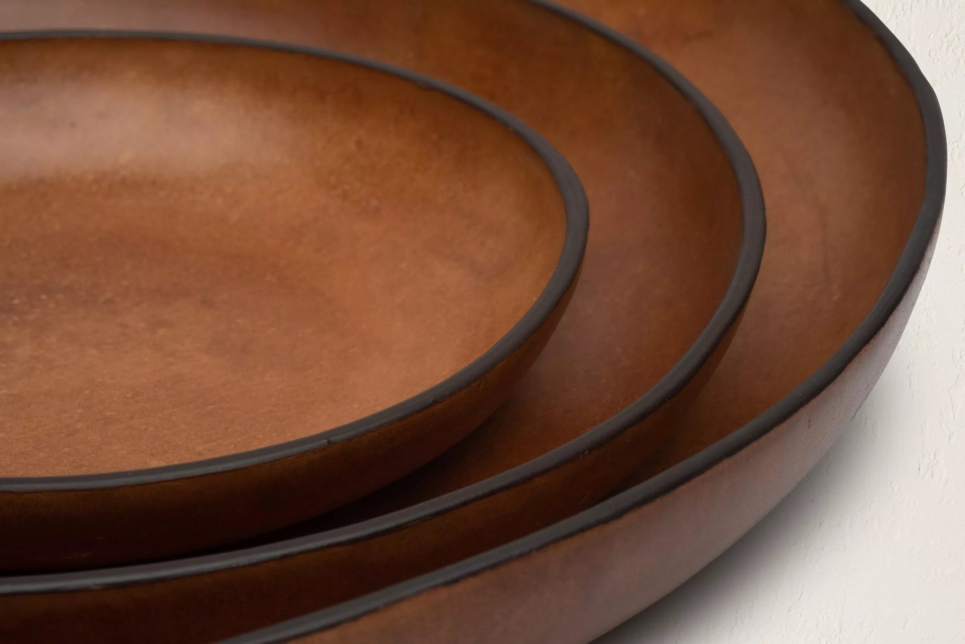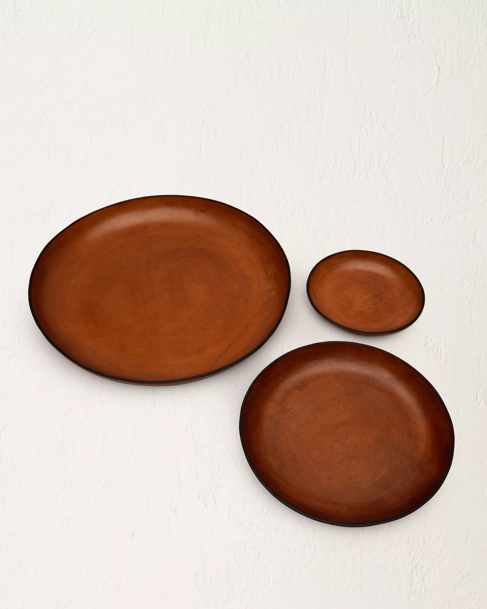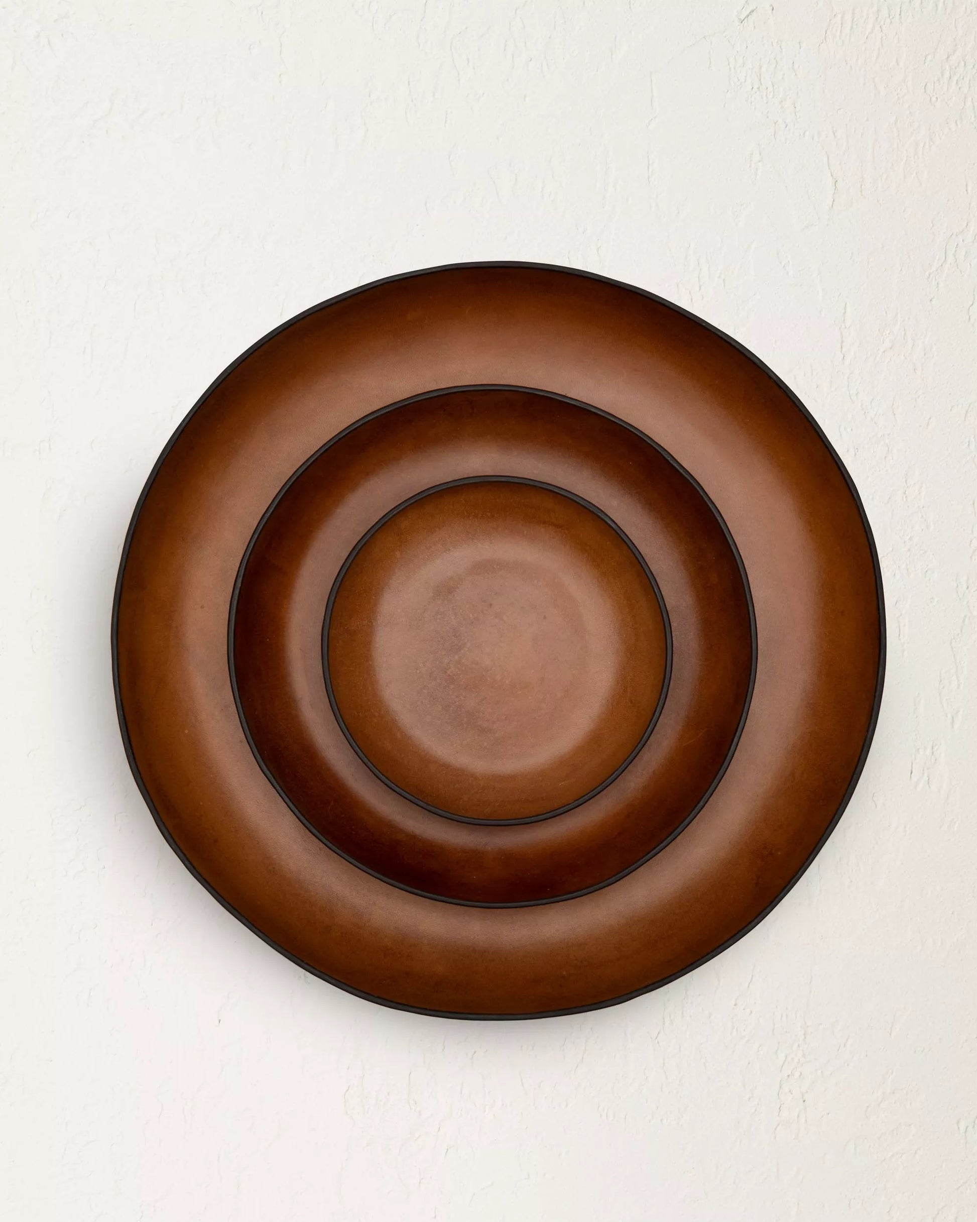 Sleek and sculptural, the Tray Set features three seamless circular forms constructed from a time-honored molding technique. Shaped in organic, biomorphic silhouettes, these smooth leather pieces feature buffed finishes that echo the look of Japanese lacquer-ware.