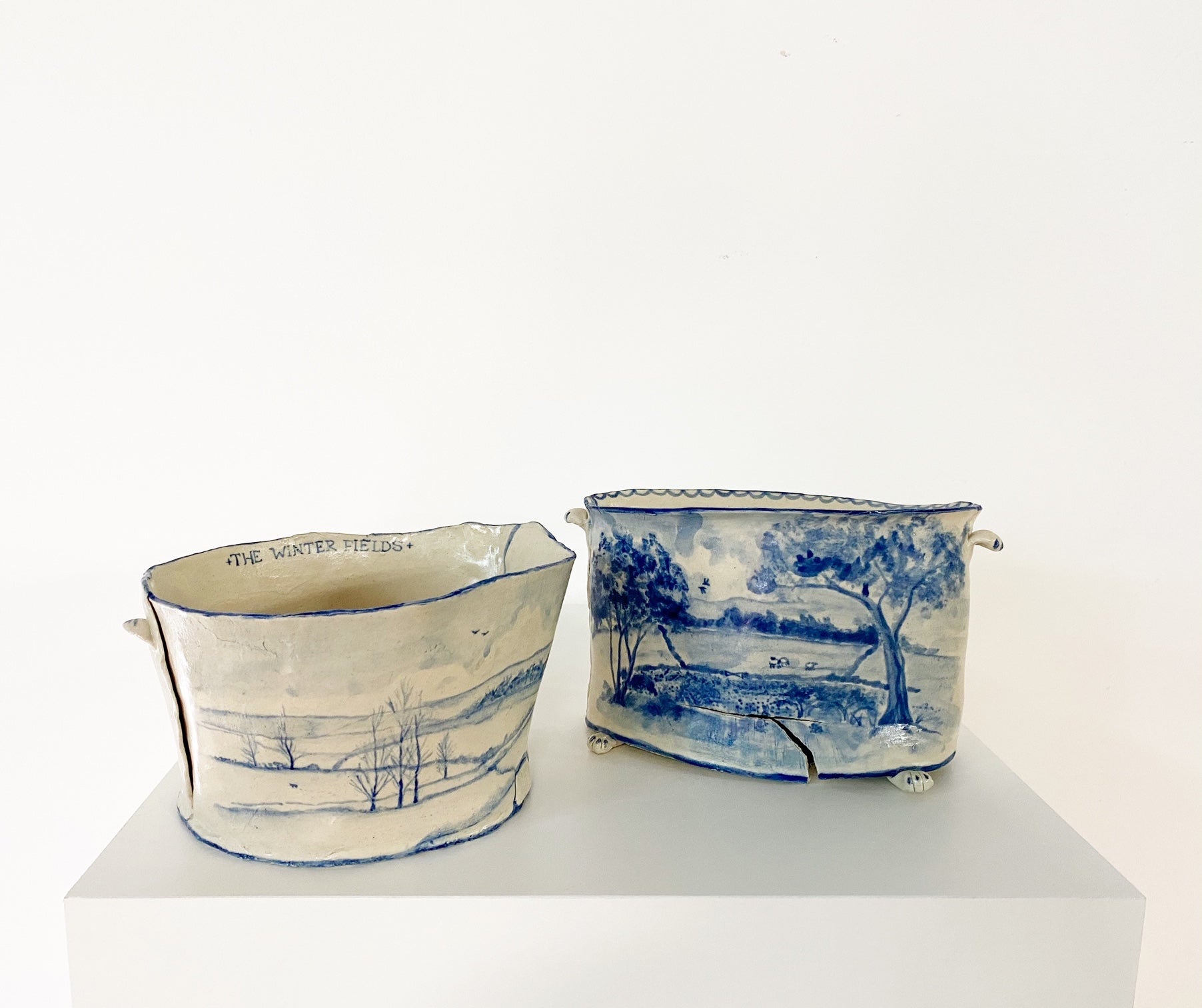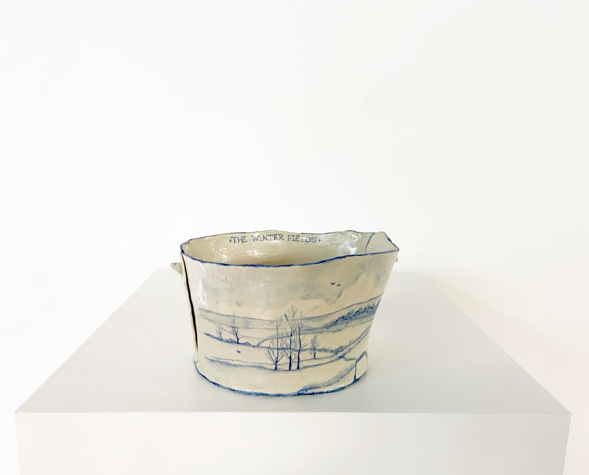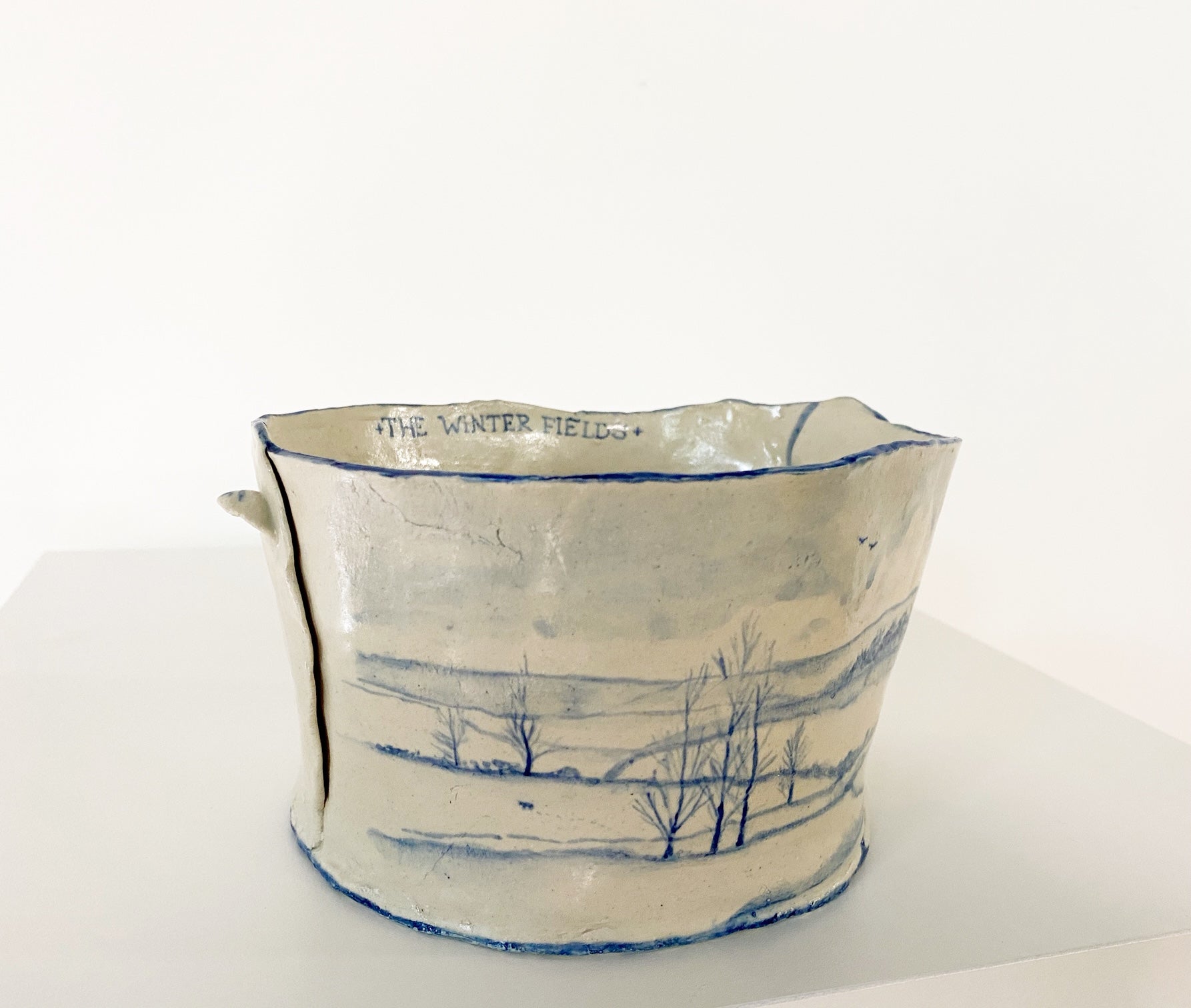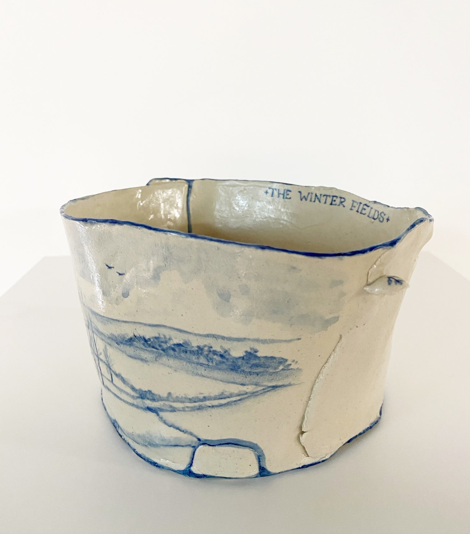 The Country Gentleman Collection by artist Maggie Robertson is a beautiful series of one-of-a-kind stoneware vessels. Each unique piece embraces the seams and irregularities of her hand-built technique complemented by intricate, hand-painted scenes of the English countryside in classic blue and white. The vessels are water tight and food safe, microwaveable and dishwasher safe; however, as they are art pieces and fragile, we would recommend hand washing.