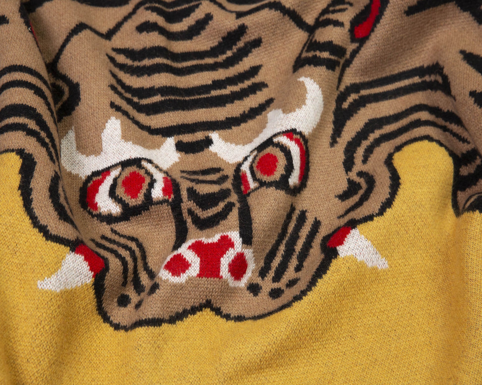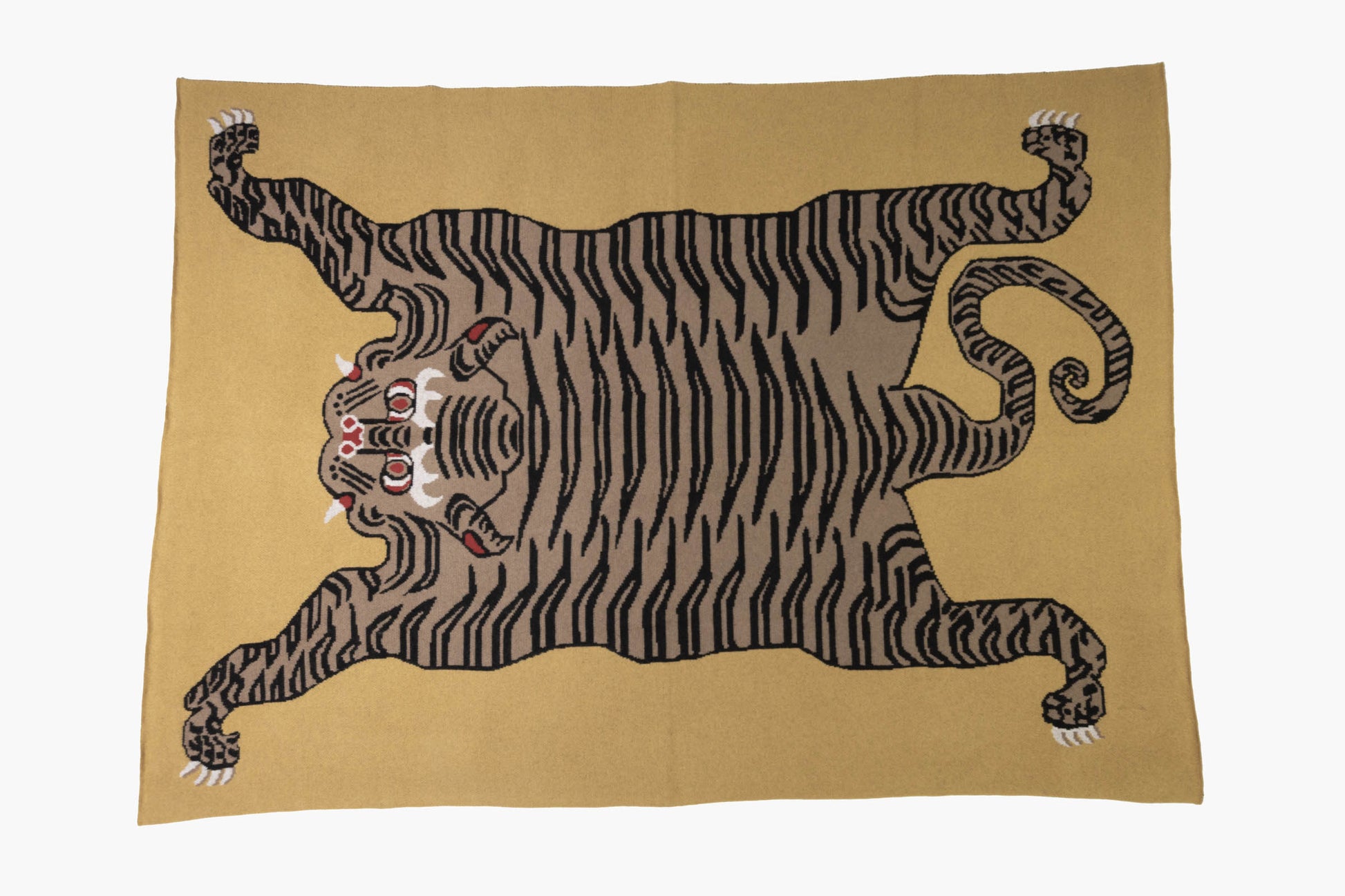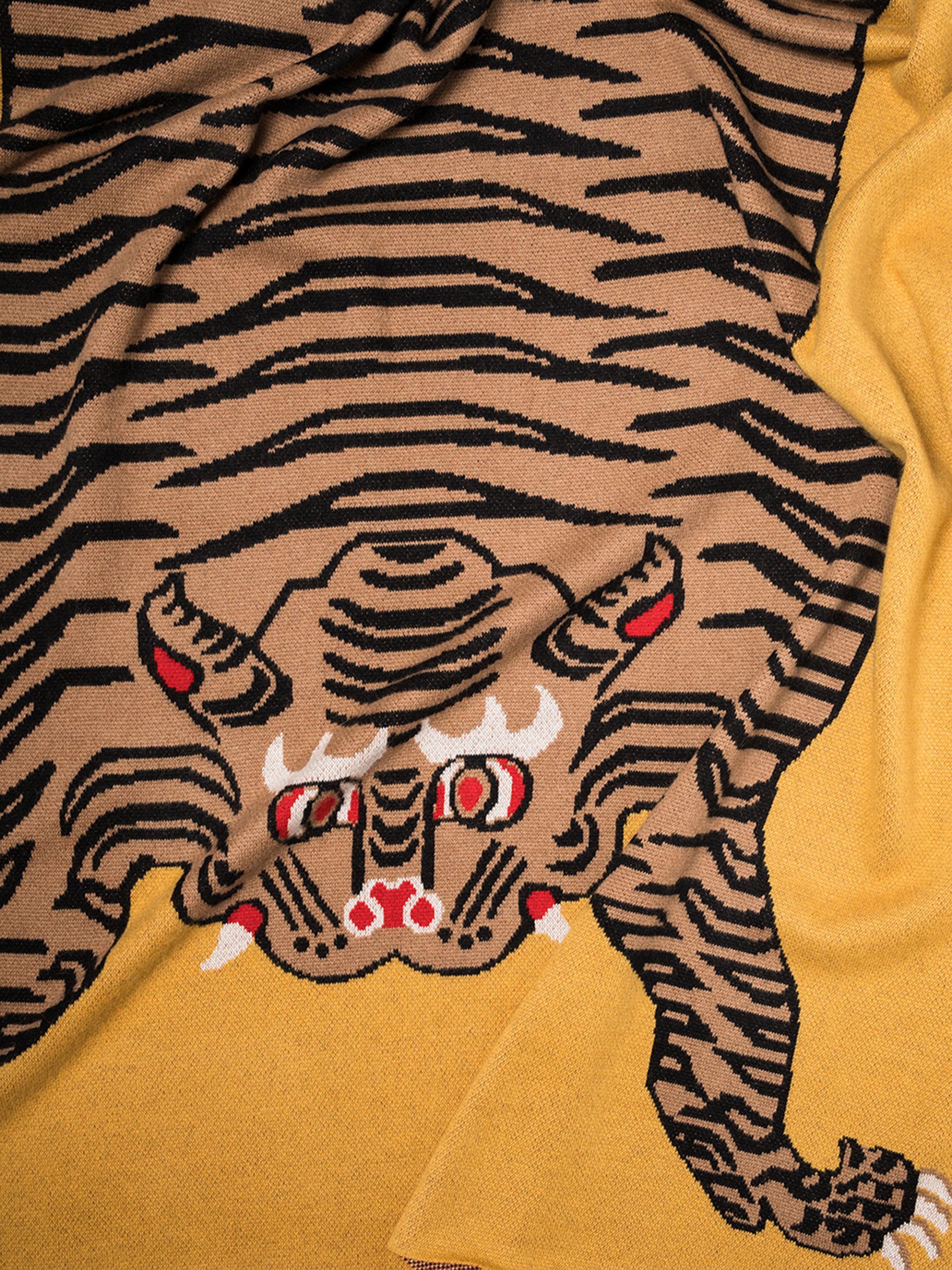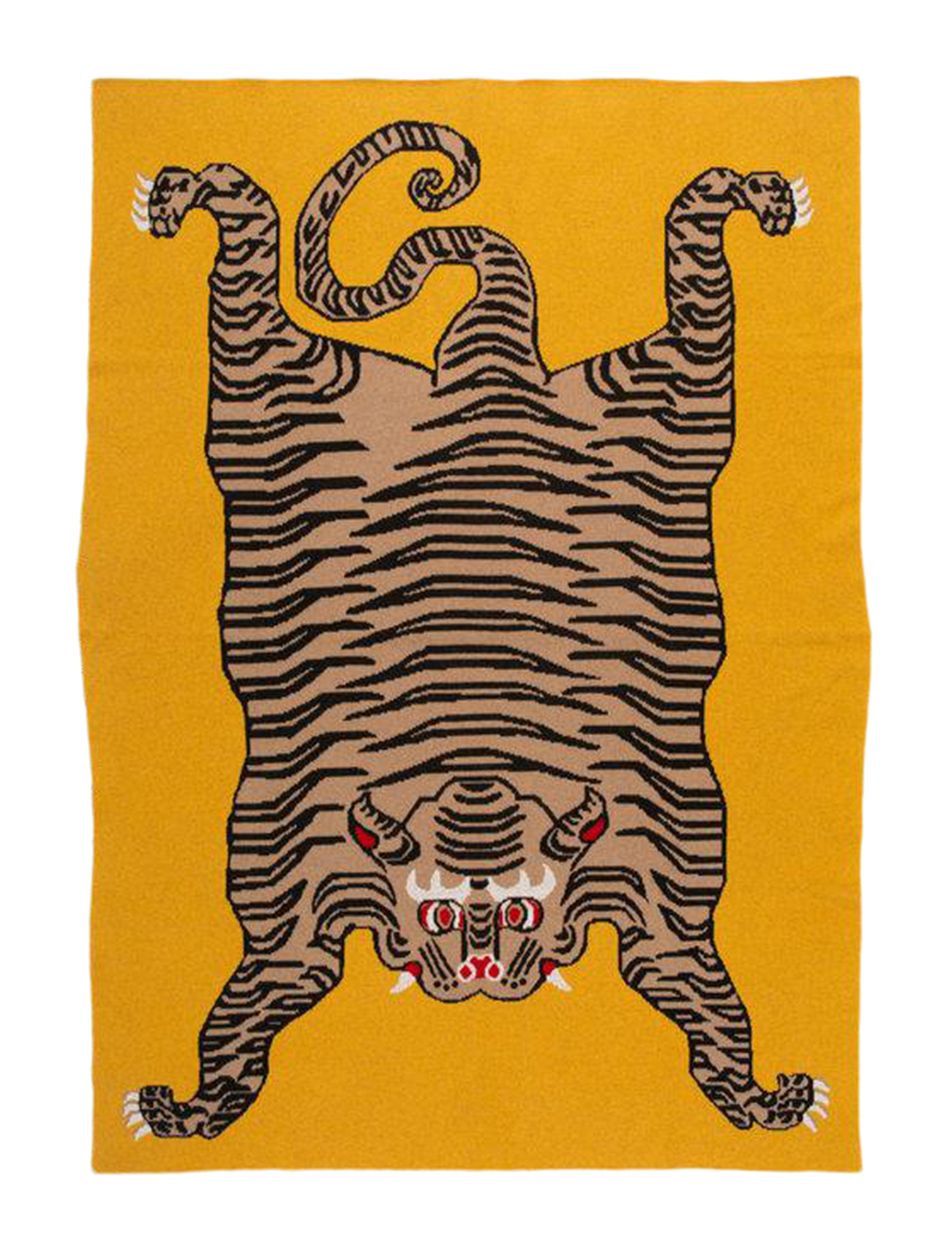 The auspicious Caspian tiger celebrated in Mongolian and Tibetan traditions adorns the Tiger Rug throw.  Vibrant in color and fierce in design, the weave is a luxurious pairing of Mongolian Cashmere and fine Baby Camel Hair.